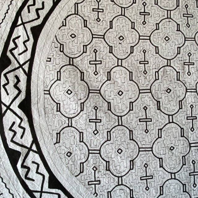 植物はアヤワスカやチャカルーナなどの植物をモチーフにしていると考えられます。 【アマゾンの泥染めについて】 アマゾンの泥染めは南米ペルー・アマゾンの先住民族シピボ族の伝統的な染めもので、すべてフリーハンドで模様が描かれています。 主に茶色地と白地の二種類あり、それぞれ異なる工程で幾何学模様を染めつけます。 どちらもマホガニーなどの樹皮を煮出した茶の染料の「タンニン」と、奥地で採取する特別な泥に含まれる「鉄分」の化合を利用して幾何学模様のデザインの部分だけが黒く染めるのが特徴です。 白地にデザインの場合、 一見、白い布に黒の染料でデザインを描いているだけのように思われるかもしれませんが、実際には、茶色(タンニン)の染料でデザインを描いた後、泥(鉄分)を布全面に塗りつけ、茶色のデザイン部分に泥の鉄分が結合することでデザインの部分のみが黒く発色するのです。 白地日デザインを染める染料は、タンニンを含む5種類の木の樹皮を煮出して濃縮した染料を使います。濃い黒色を出すためにはデザイン部分を茶の染料で何度も塗り重ねるため、とても手間がかかります。 詳しくは ホームページ「ペルーアマゾンシピボ族と泥染め」をご覧ください。 「白地染めの工程」 http://amazon-dorozome.com/making/white.html 蔵カフェでのイベントで展示