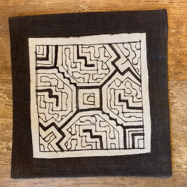 シピボ族の泥染めの黒く染めた中央に刺繍を入れた特注サイズの刺繍です。 コースターより大きめでポットマットや花瓶敷きなどに良いサイズ、細かい刺繍をシピボ族らしい独特な色の組み合わせが特徴です。 このシリーズは中央を黒く泥染めにして周囲を茶色に残した珍しいデザインです。 額装用のゴージャス刺繍を、キルト芯を入れて分厚いマットにしました。不思議な幾何学模様はシピボ族の精神世界を表すと言われる不思議な模様です。 日常生活に取り込んで毎日のテーブルが華やかになります。 コットン100% 南米ペルーアマゾン地域シピボ族の泥染め 裏側は墨っぽい黒系に染めたシピボ模様入りハギレです。 詳しくはアマゾン屋のホームページ シピボ族の泥染めを参考にご覧ください