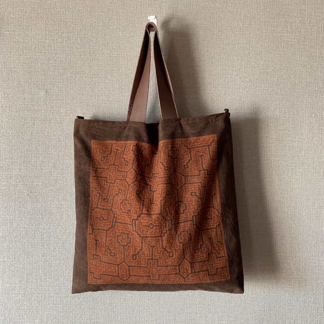 Bag パソコンバッグ 泥染め茶地白刺繍本革持ち手 全面草木染め 28x36cm シピボ族の泥染め sipibo 先住民族の工芸