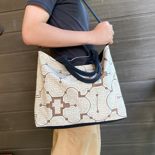 帆布泥染めトートショルダー中型 40x28x8cm シピボ族の泥染め 長さ調整ショルダー取り外し 軽いバッグ