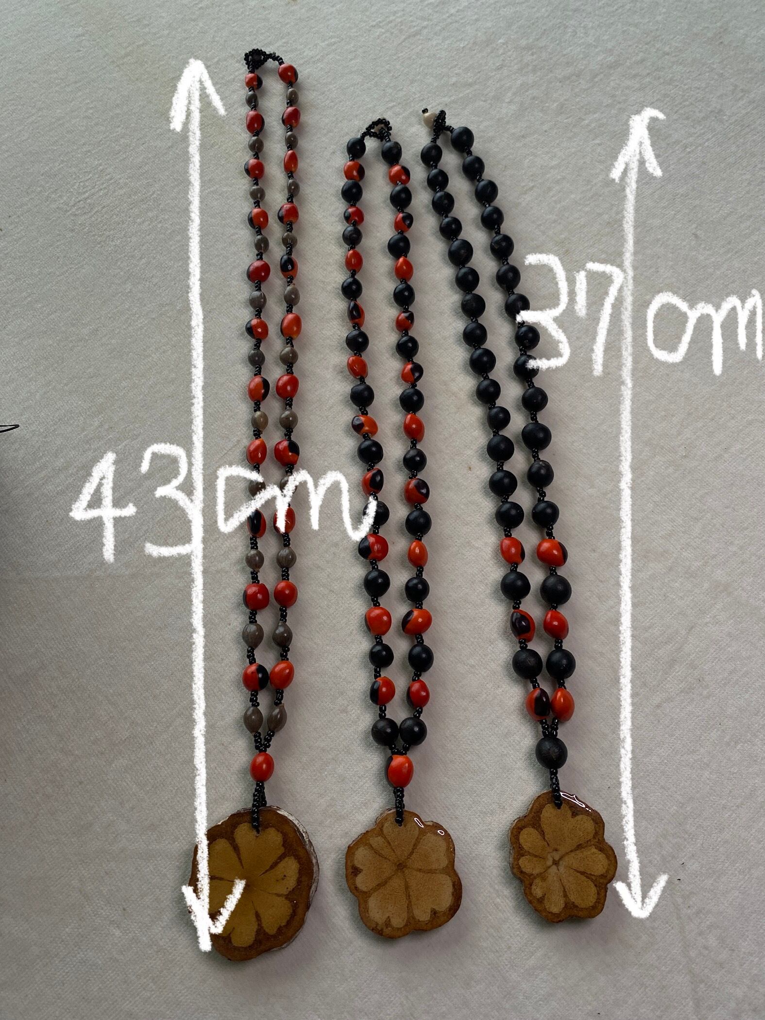 朱色◎ワイルーロ アマゾンの森で採取できる。硬く簡単に穴を開けられない。魔除けや祈祷に使われるほか、先住民の人々の装飾などに使われいてた。最近は手作りのアクサリーはとても少なかなっています。朱色の実の黒いブチは天然の模様で、艶も自然から生まれます。