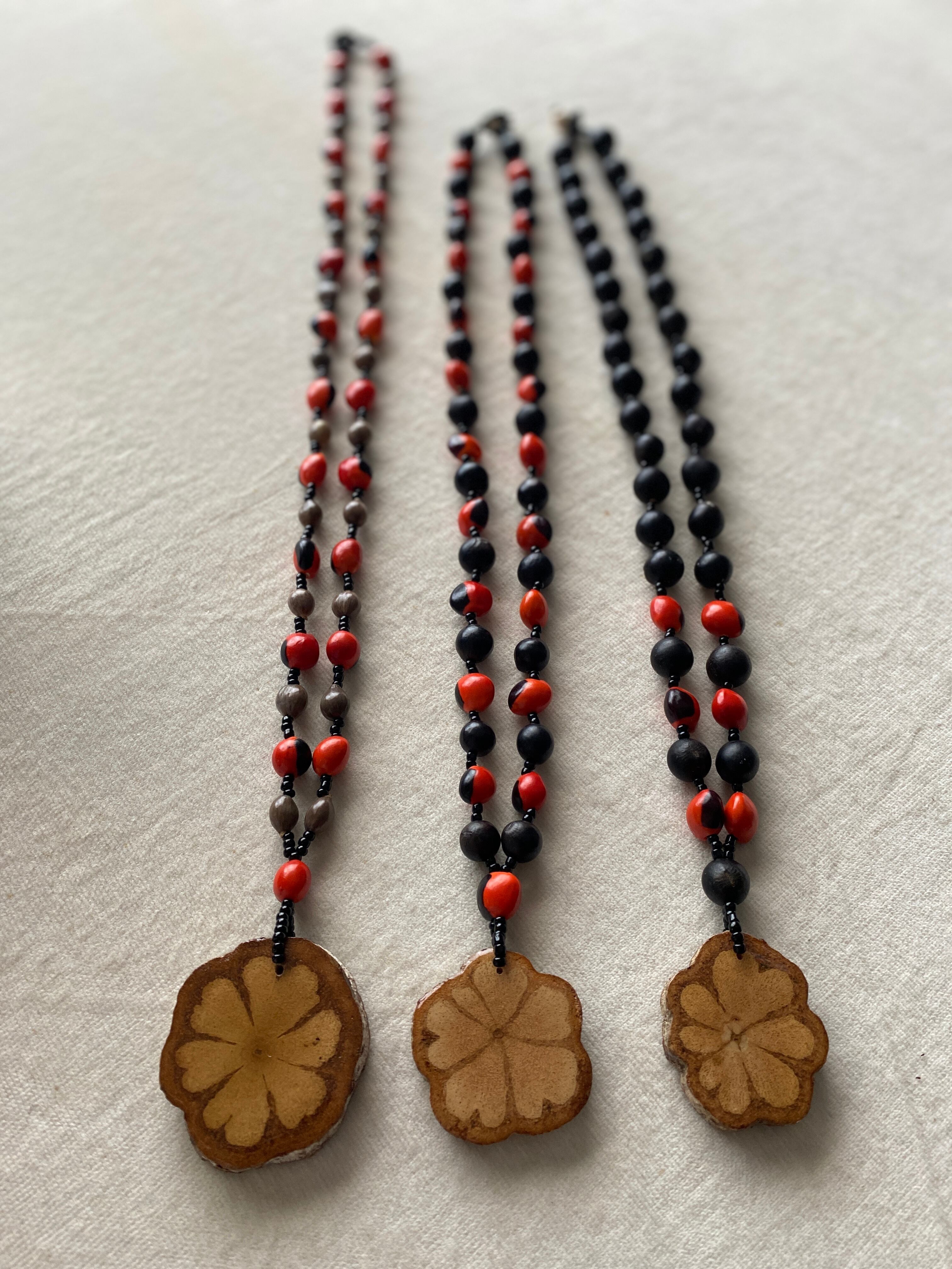 朱色◎ワイルーロ アマゾンの森で採取できる。硬く簡単に穴を開けられない。魔除けや祈祷に使われるほか、先住民の人々の装飾などに使われいてた。最近は手作りのアクサリーはとても少ない。ブチは天然の模様です。