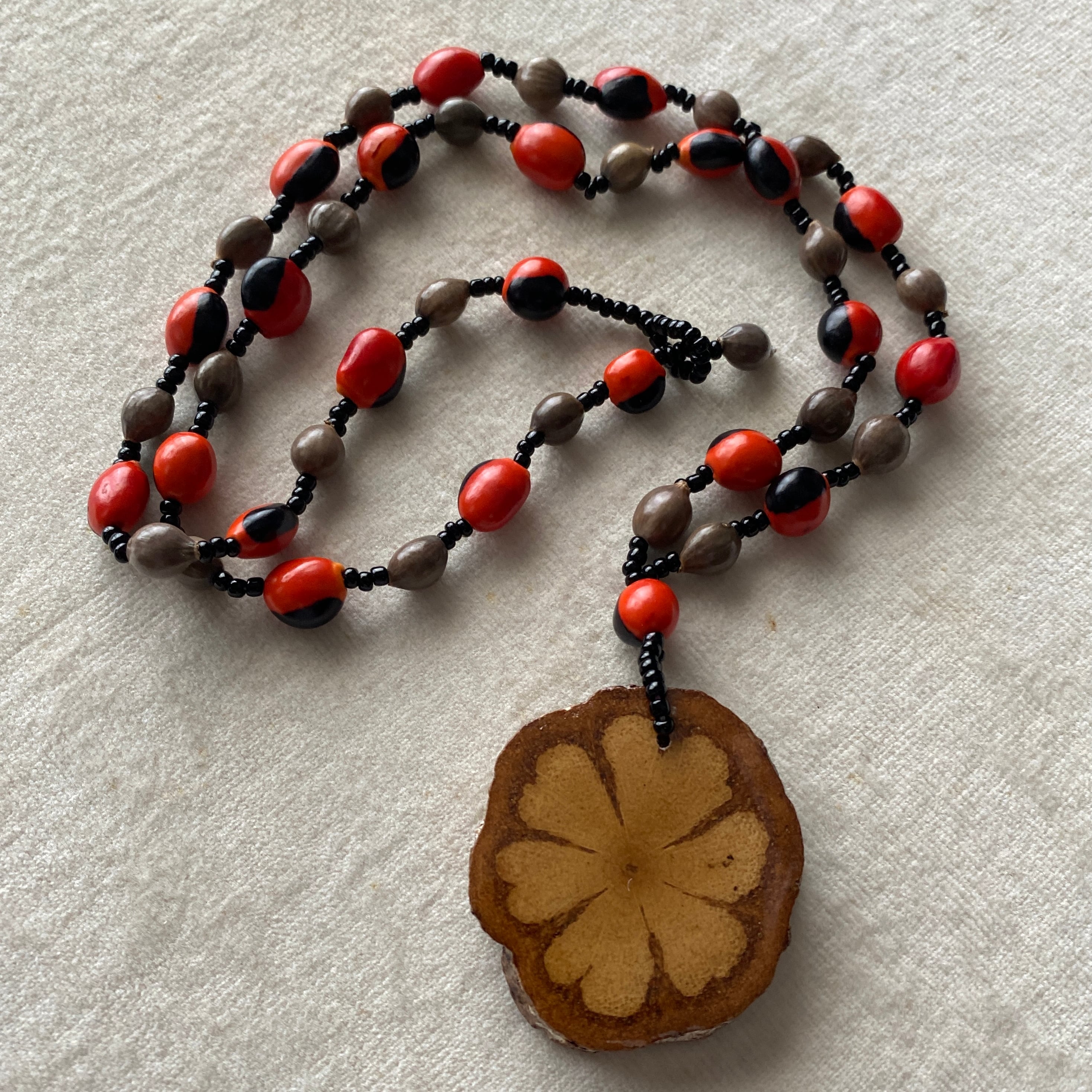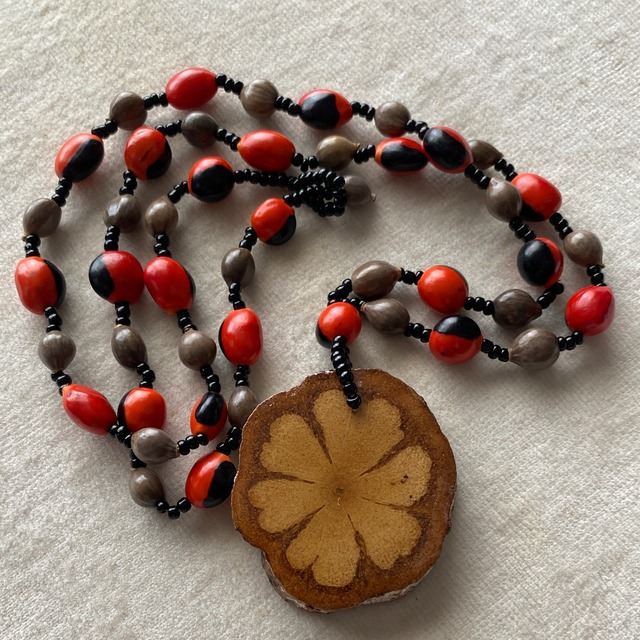 朱色◎ワイルーロ アマゾンの森で採取できる。硬く簡単に穴を開けられない。魔除けや祈祷に使われるほか、先住民の人々の装飾などに使われいてた。最近は手作りのアクサリーはとても少ない。ブチは天然の模様