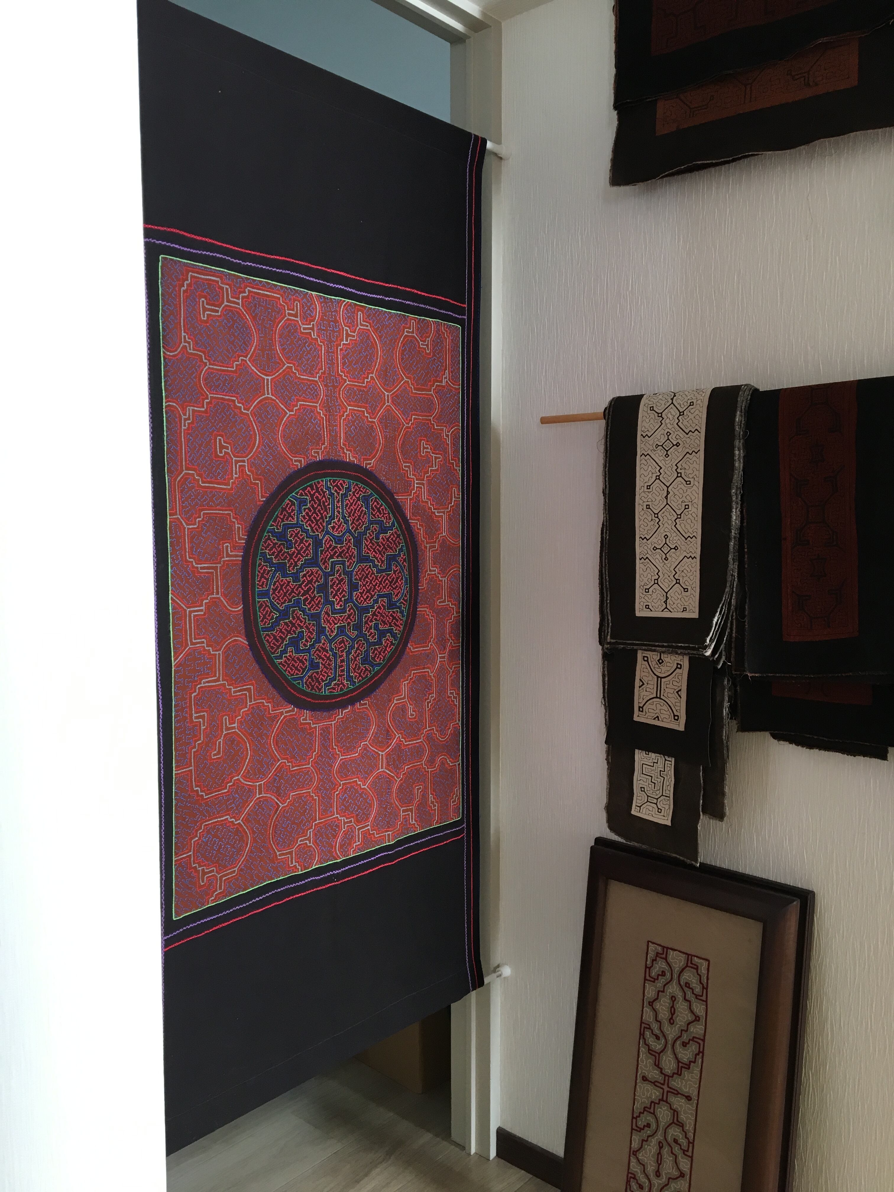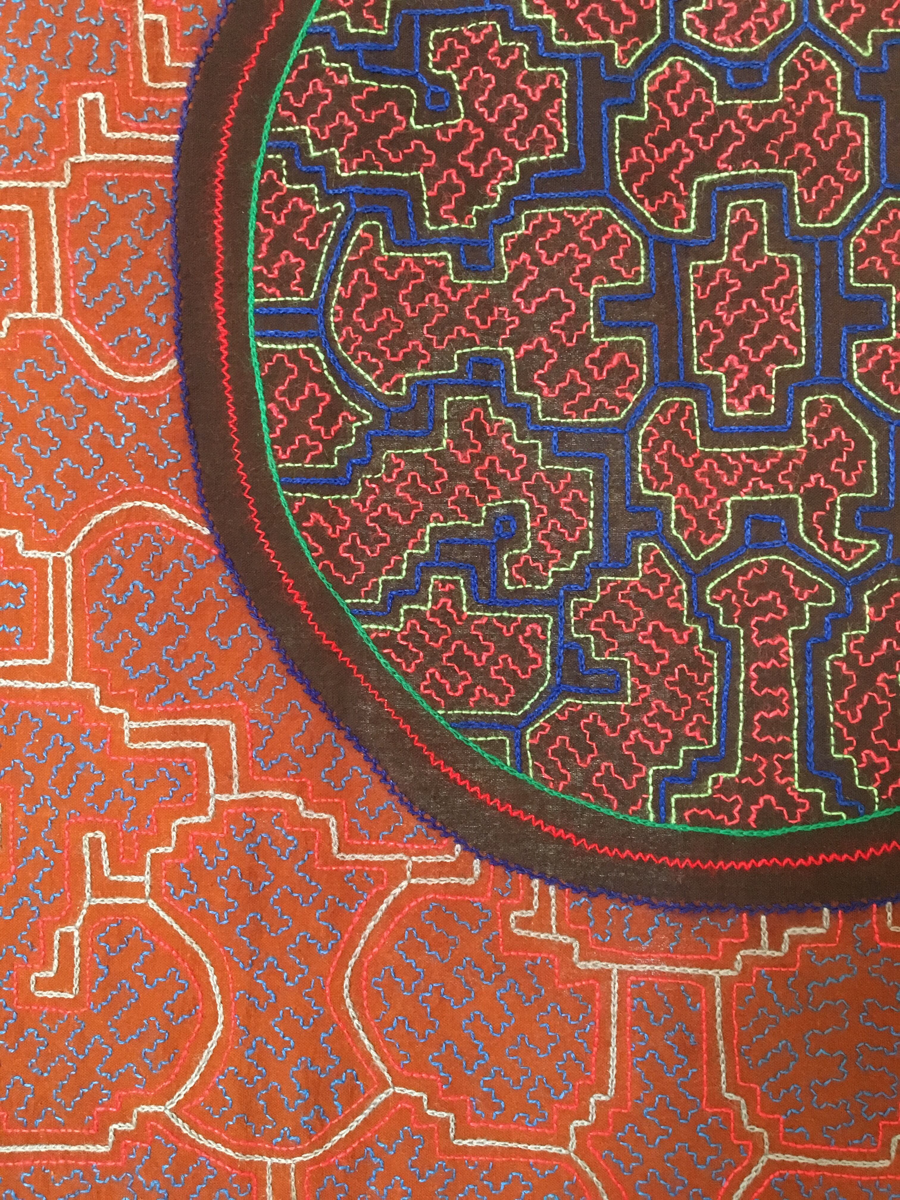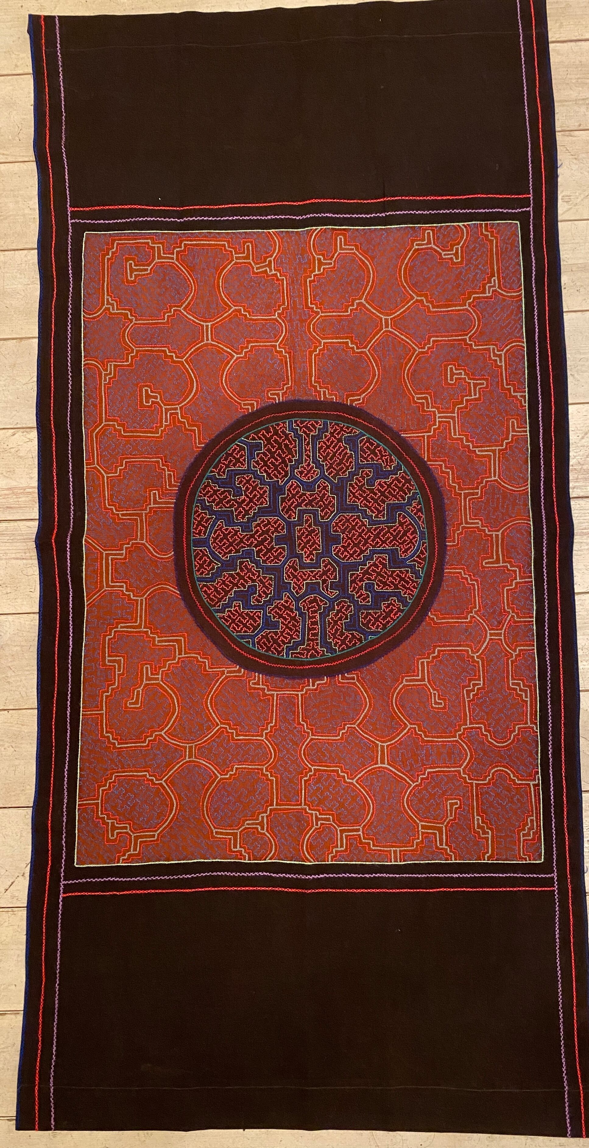 樹皮の茶に染めた後で円の部分を黒く泥染めし、全面に刺繍をフリーハンドで施している。生地はやわらかい木綿を現地で染めており、この上のない美しい黒の発色と、樹液の染料で染まった明るい茶のコントラストが貴重。刺繍の丁寧さも色の組み合わせも神秘的で完璧な優良品。