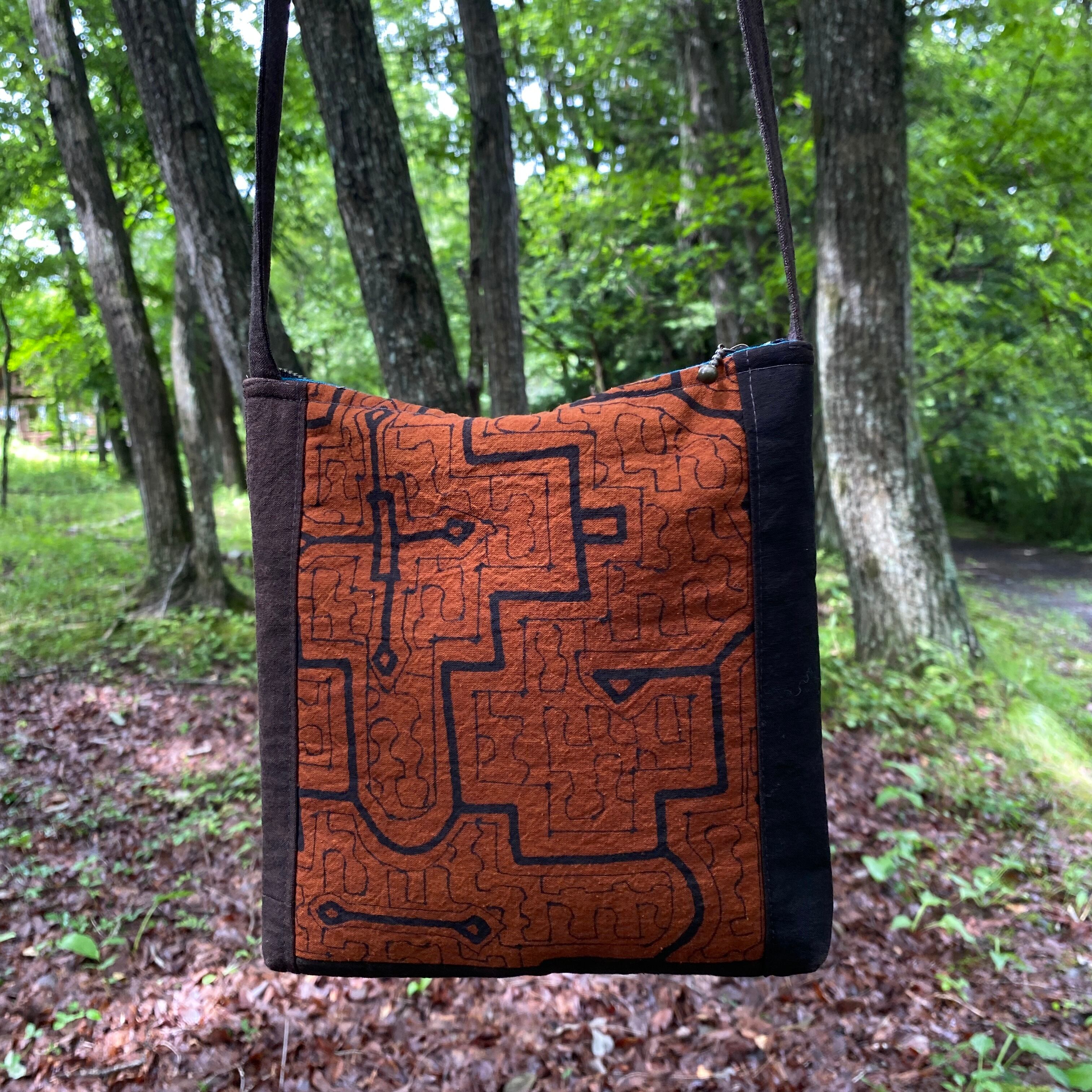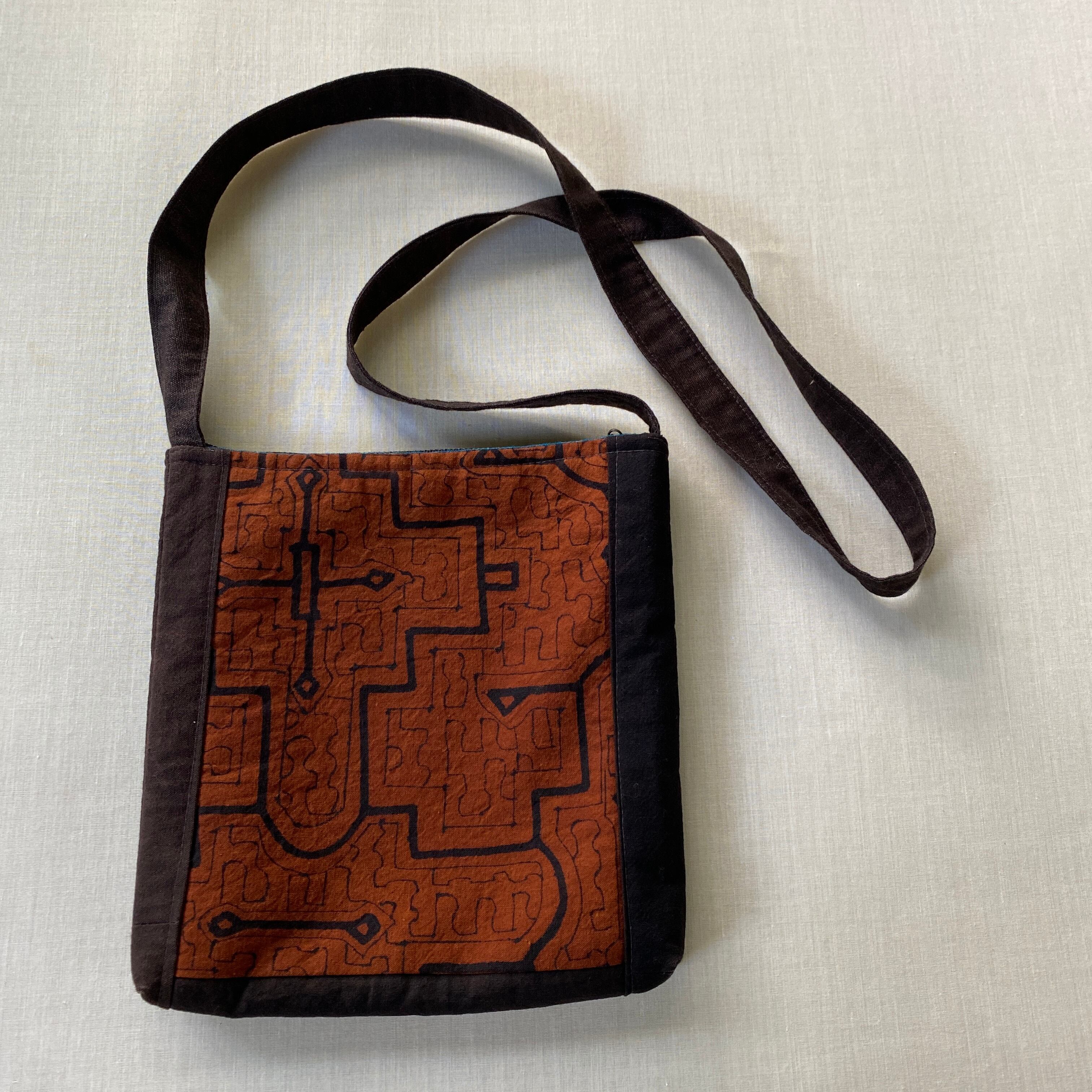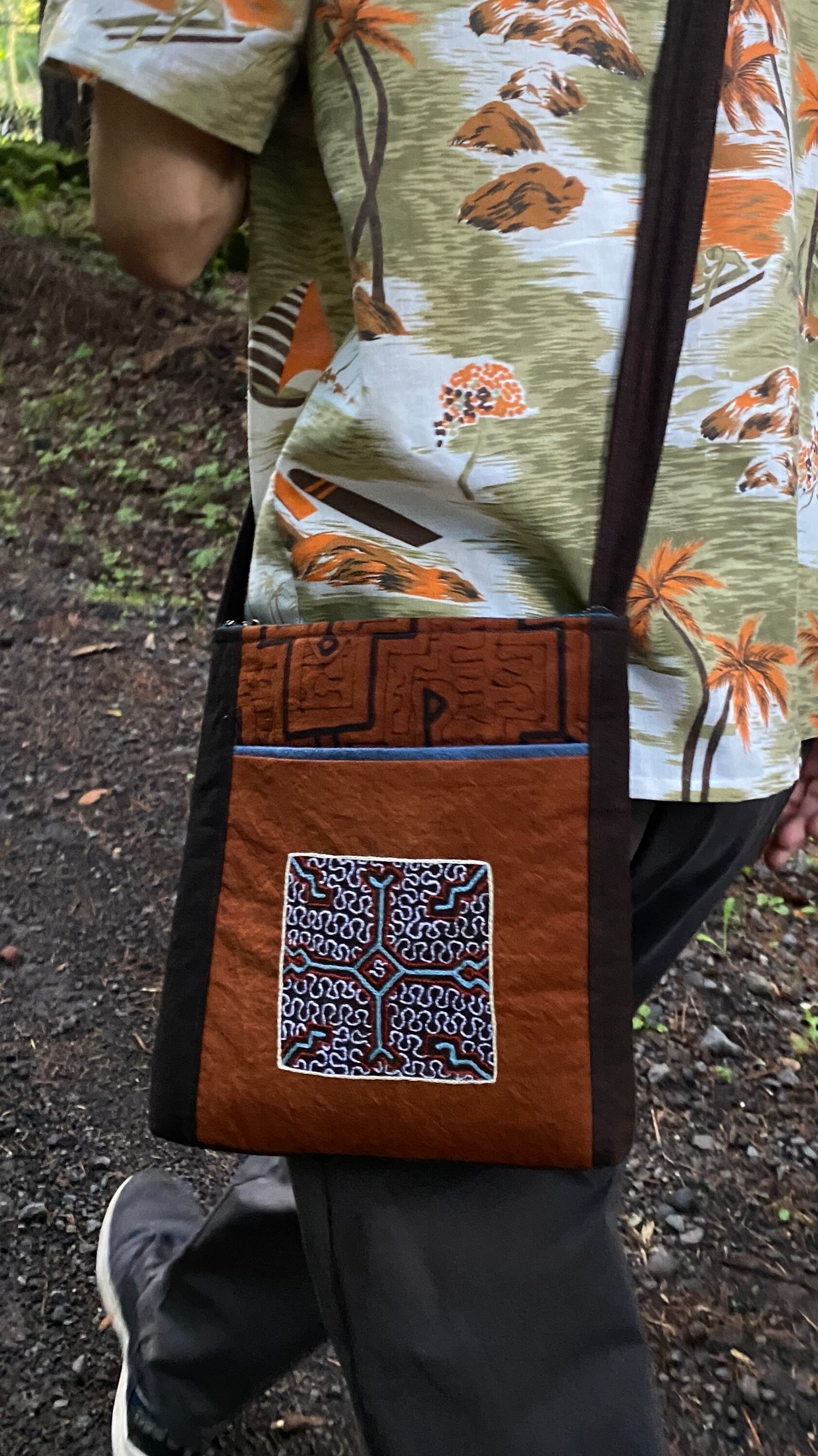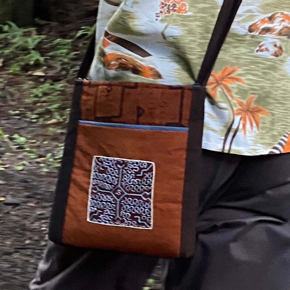 シピボ族により泥染めに刺繍した素材をポケットにしたファスナー付きポシェットで、裏側はシピボ族の手描き模様のデザインです。