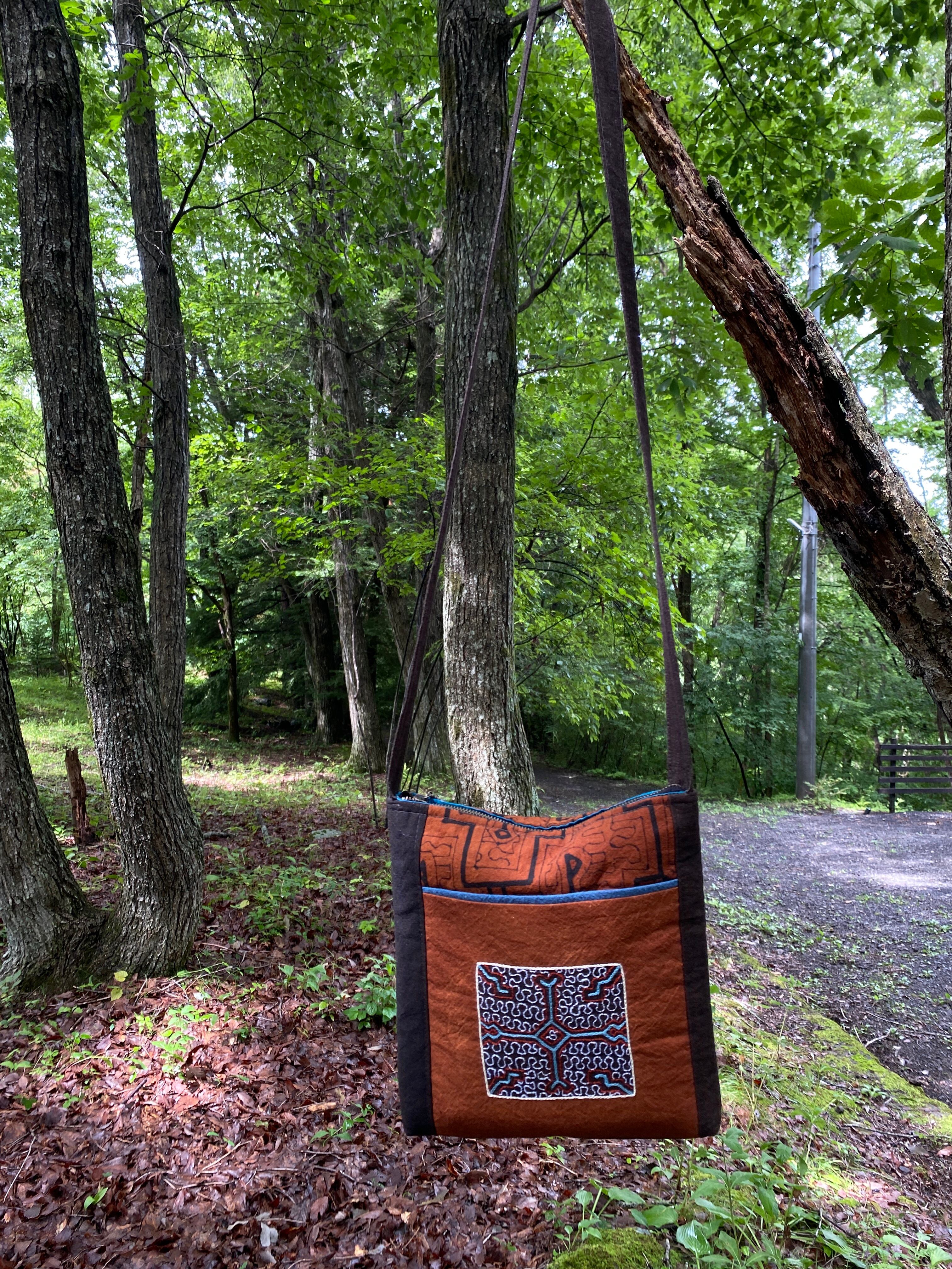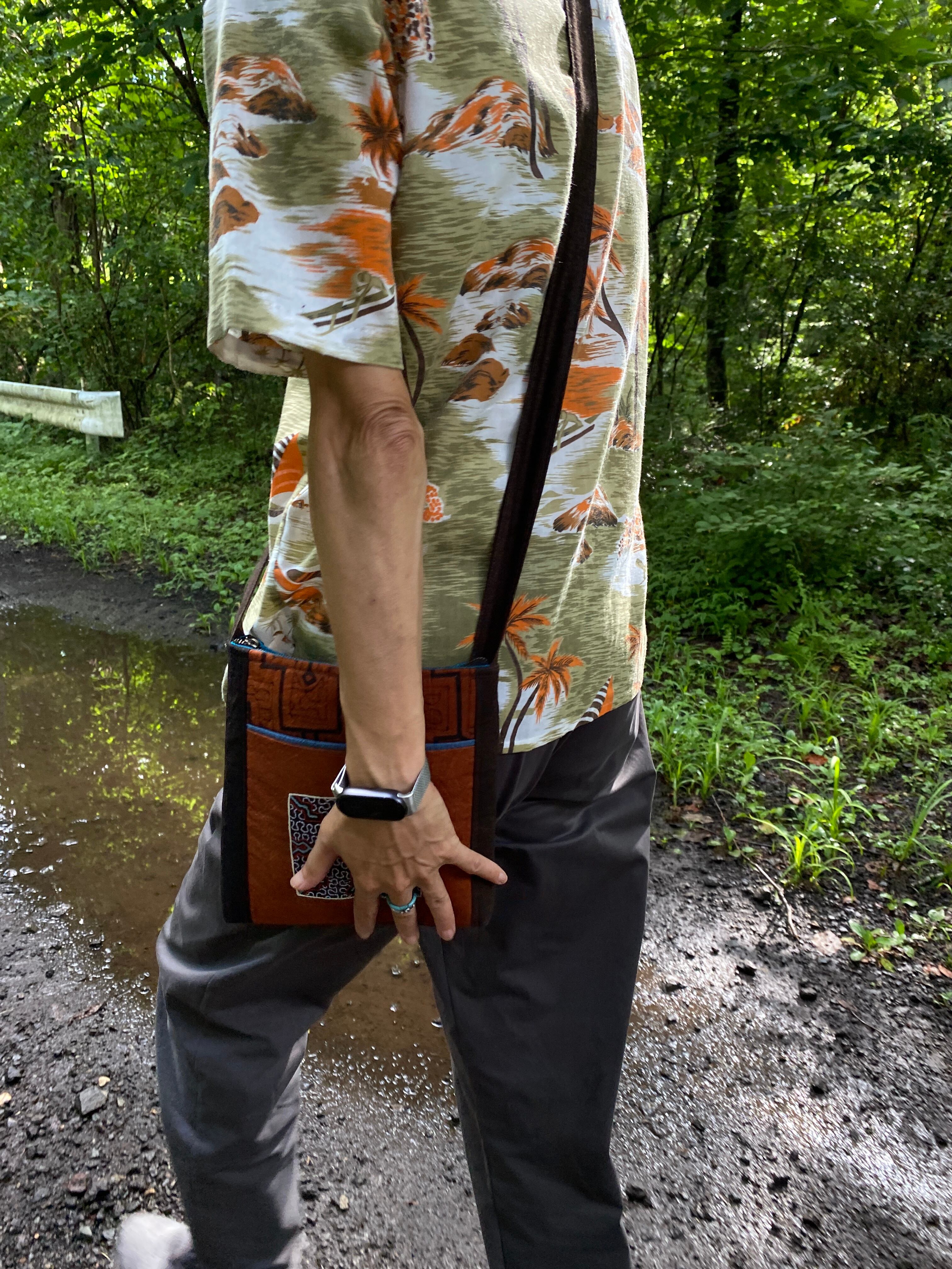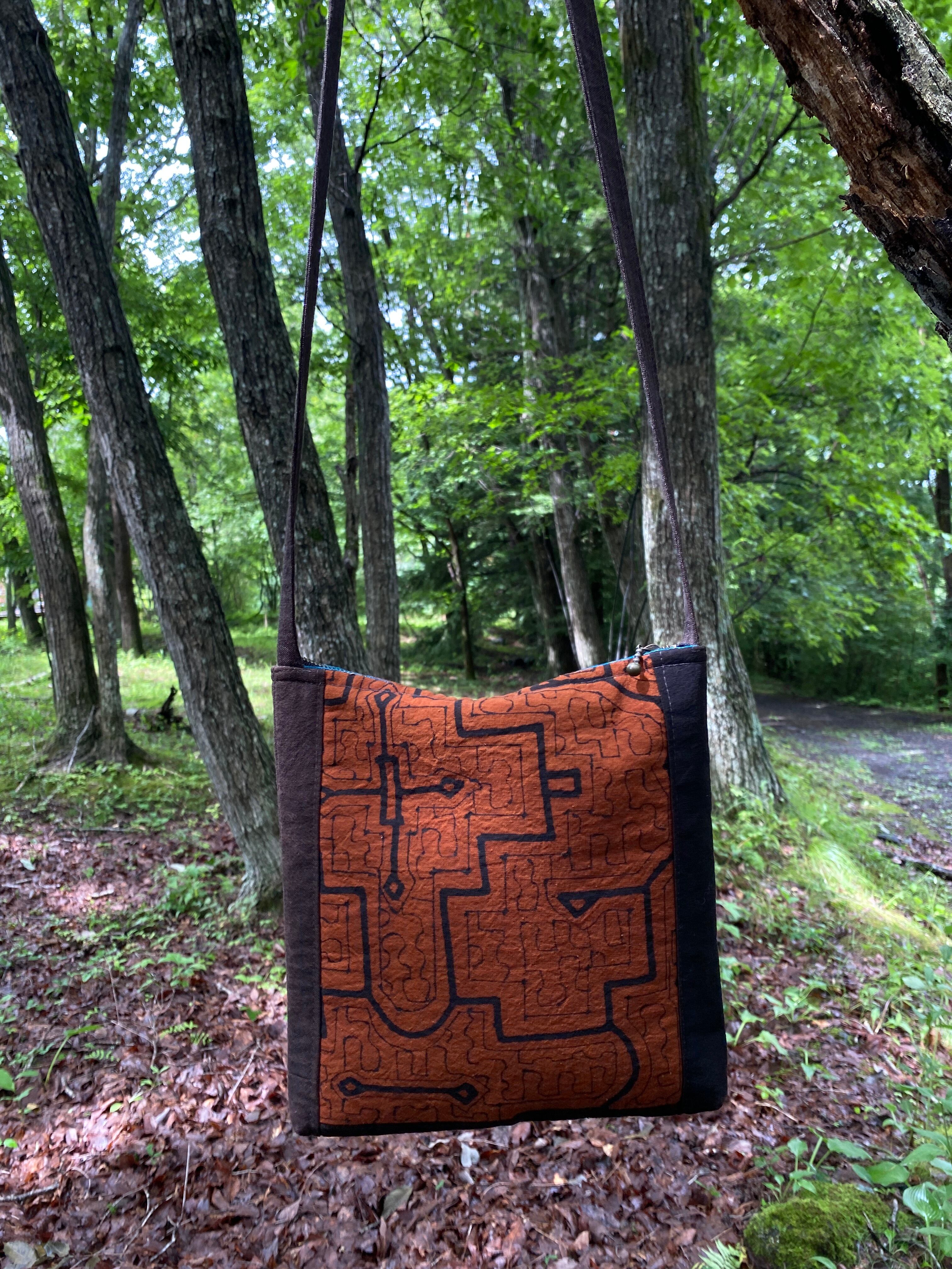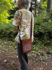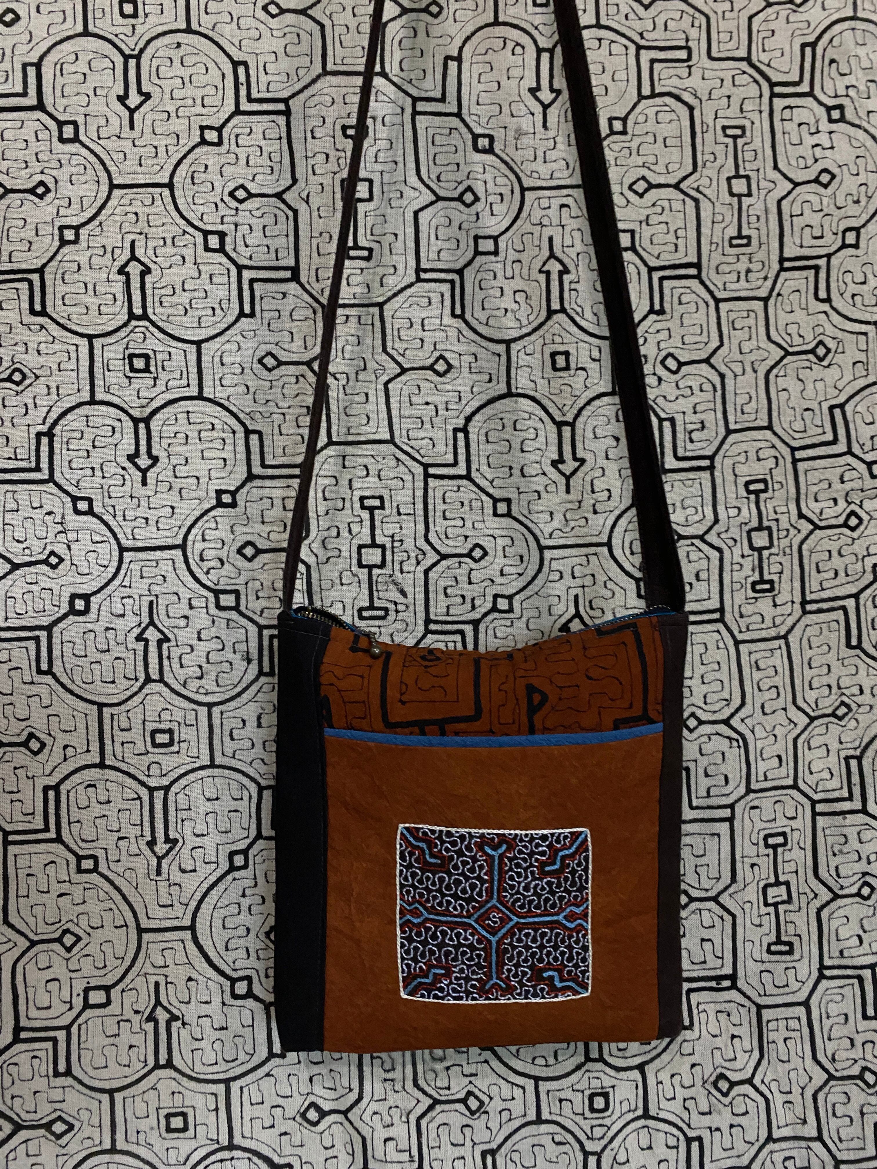 シピボ族により泥染めに刺繍した素材をポケットにしたファスナー付きポシェットで、裏側はシピボ族の手描き模様のデザインです。