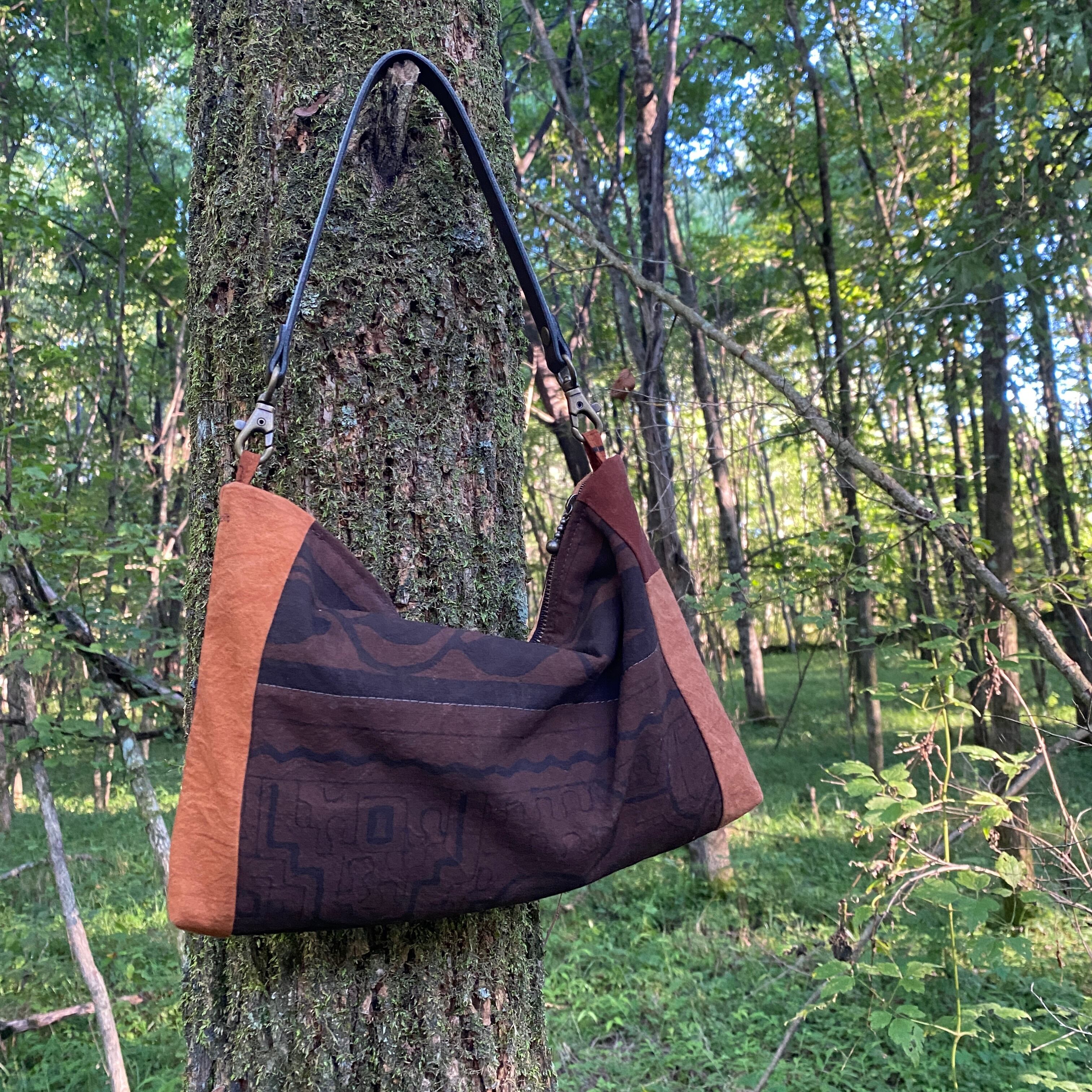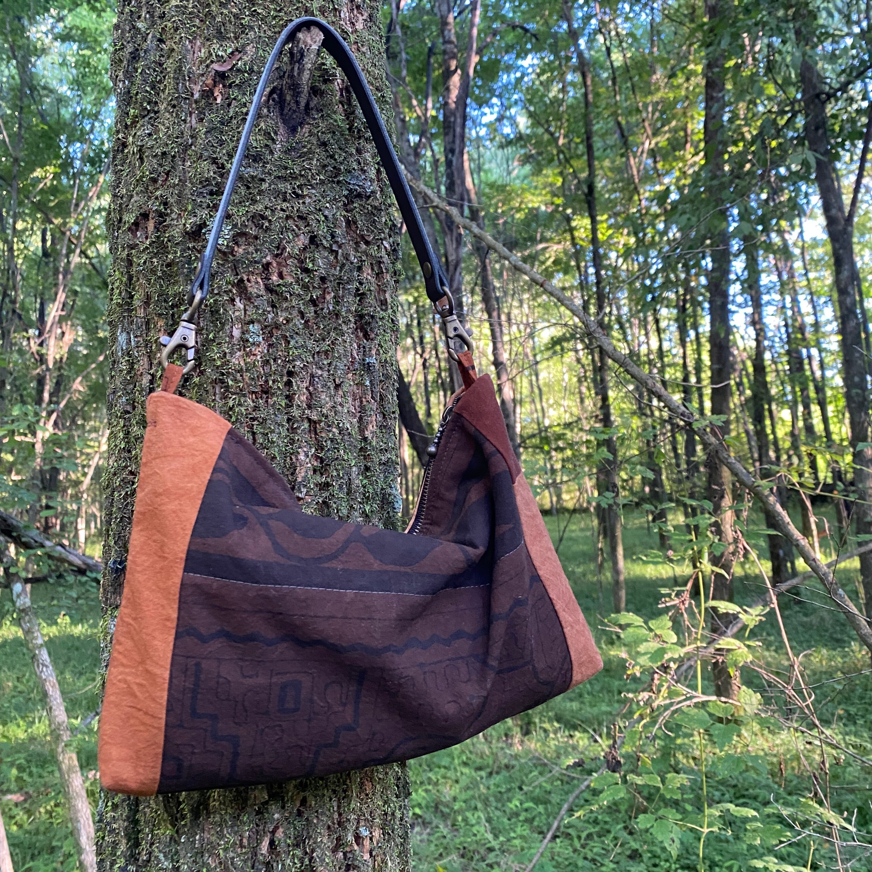 刺繍の周囲の黒い部分は泥染めで、一枚布に刺繍しています。