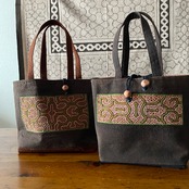 美しい刺繍素材を小柄な厚底バッグにした定番です。裏側は茶色染めにポケットをのせて2面とも主役級です。巾着蓋も持ち手もアマゾンの染め生地で全面的に材料にこだわり凝った豪華な作りになっています。