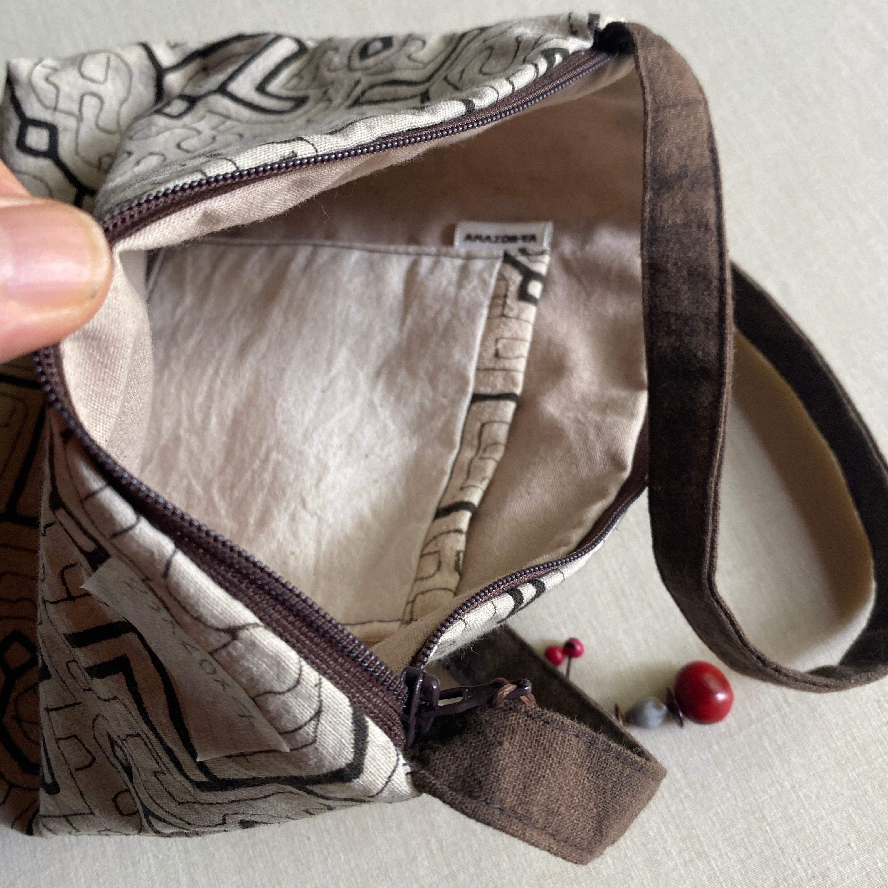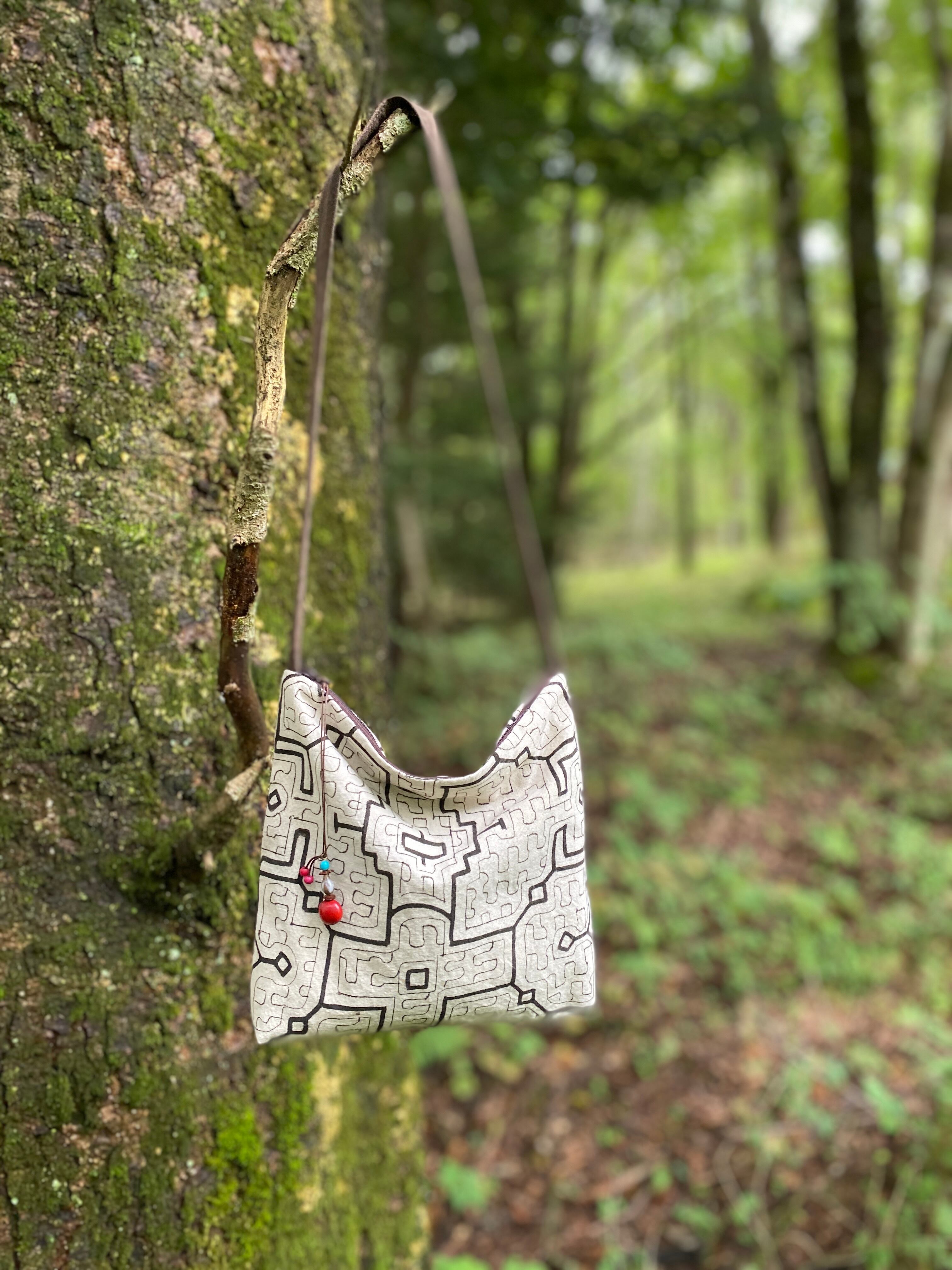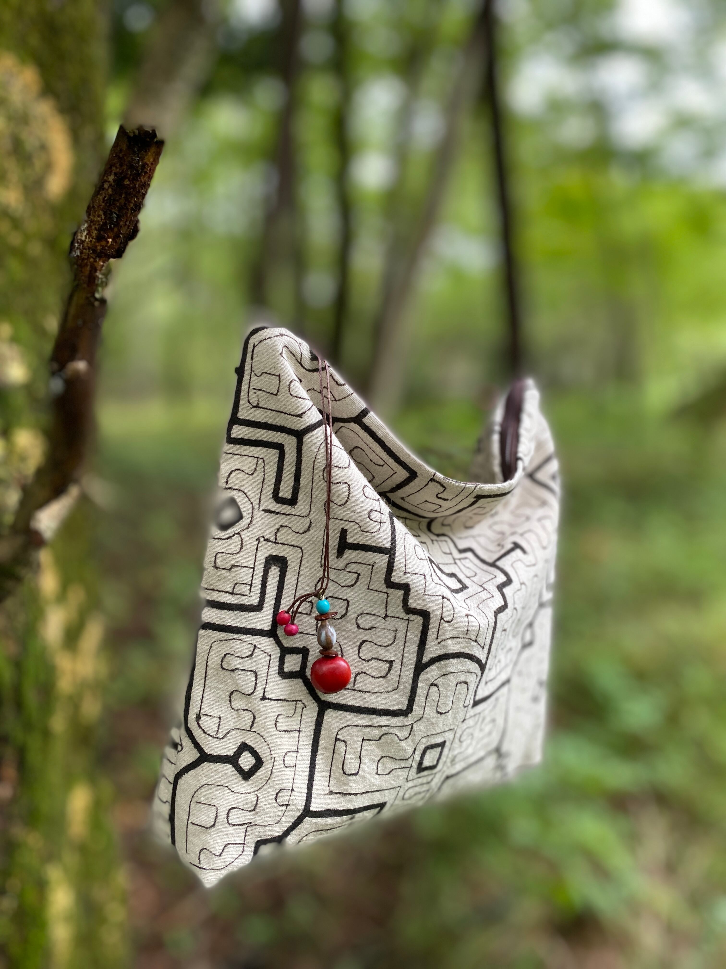 柔らかくて軽い、シピボ族による手描き模様染めのファスナー付きショルダー
