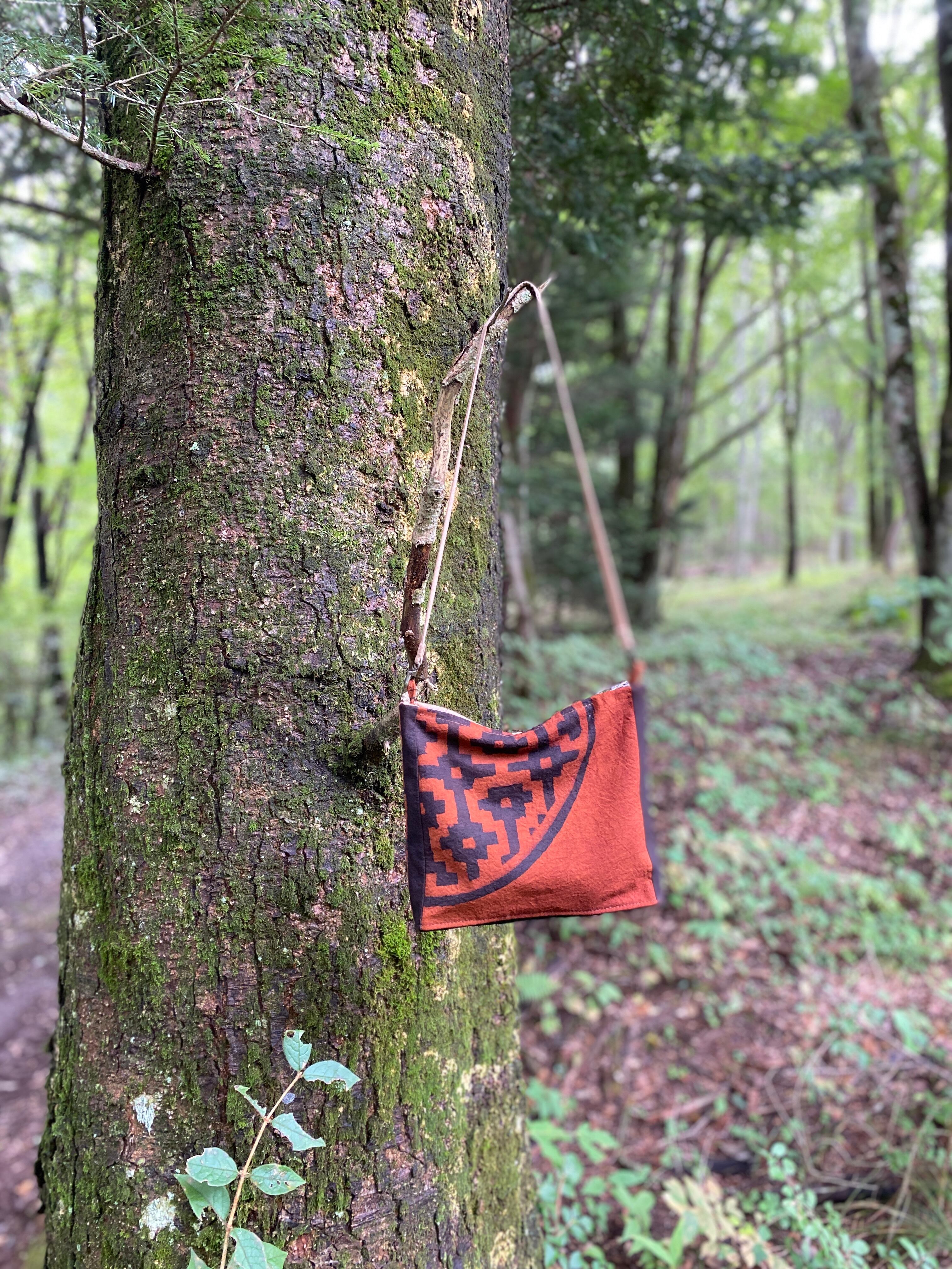 片側に途中図の太い模様のある円のパーツ、片側にポケット、取り外しができるショルダー付きです。細くて長いポシェット用か、太めで短いショルダー用のショルダー、市販の本革パーツと取り替えも可能です。