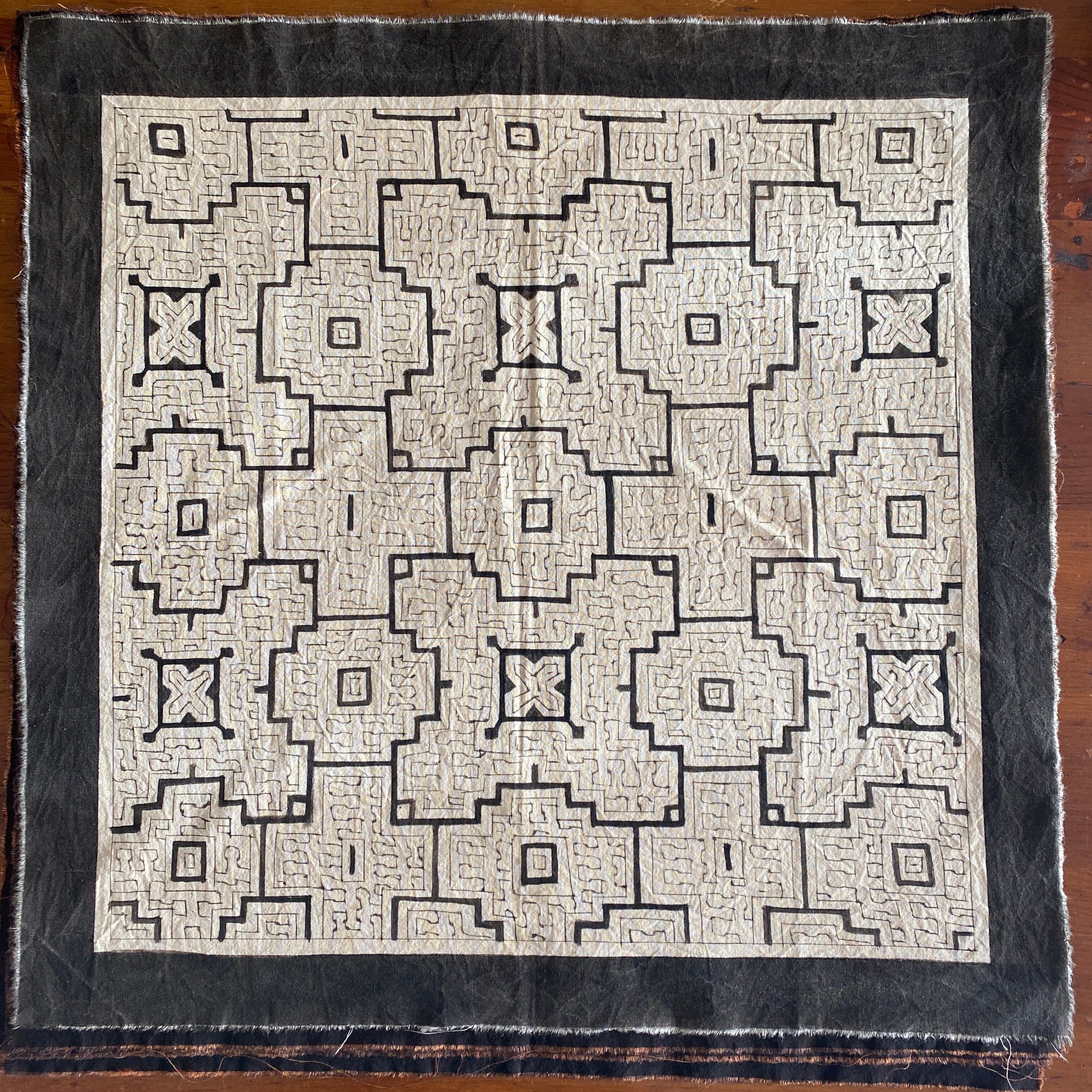 アマゾンの泥染めは、先住民族シピボ族の伝統工芸で、フリーハンドの幾何学模様を染める、希少価値の高い手工芸です。この布を使ってオーナー(AYACHI S)がバッグや布雑貨を手作りしています。 貴重な伝統工芸を少しでも長く作り続けて欲しいという想いから続けている活動です。