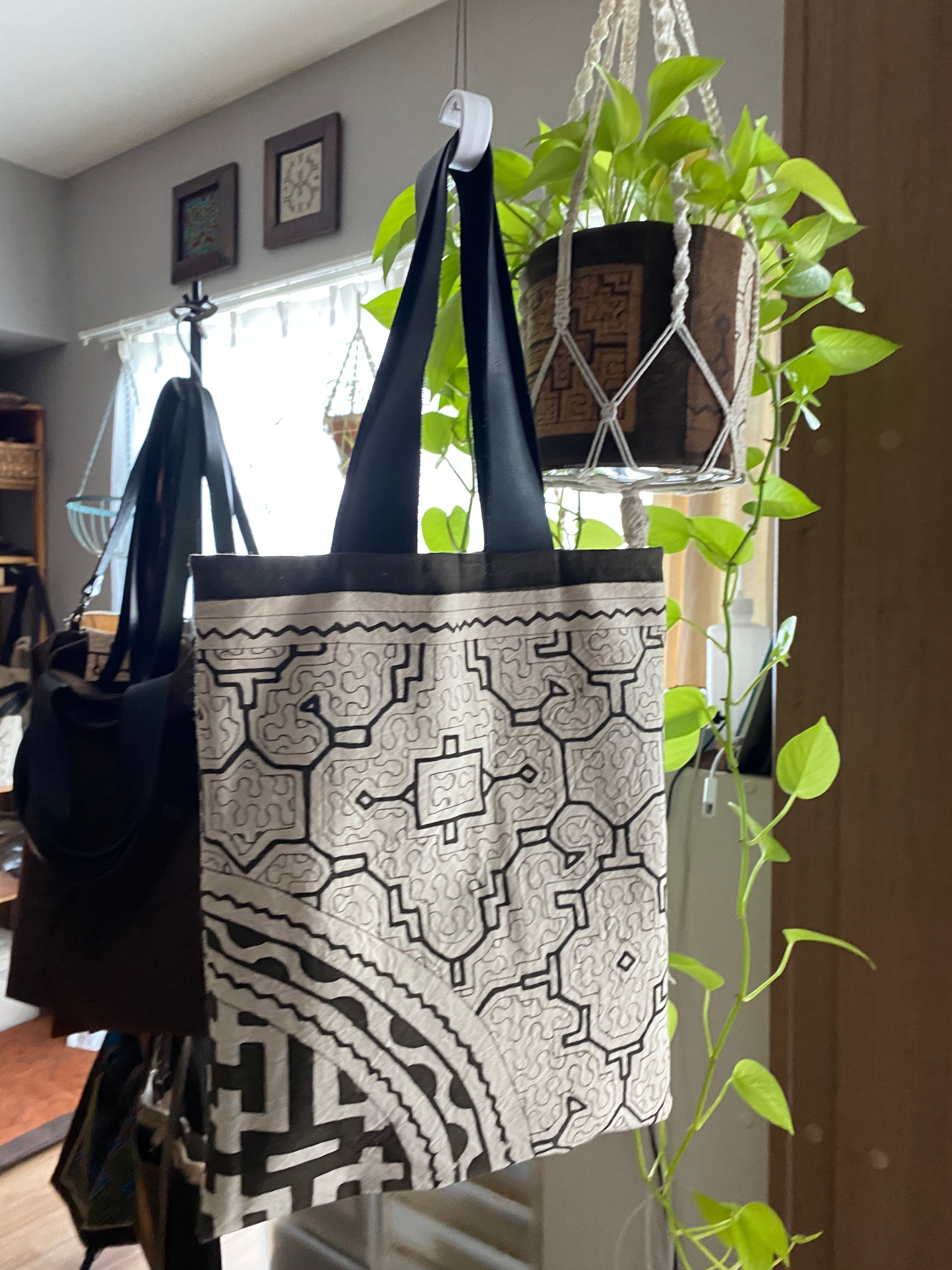 アマゾンの泥染めは、マホガニー樹皮に含まれるタンニンと泥の鉄分の反応によって模様を黒く染めるのが特徴です。シピボ族の女性によって描かれるフリーハンドの幾何学模様は、「天から降りてくる」と言われ、図案化されたものではありません。アマゾン大地の恵み、自然由来の深い色と風合いは神秘的な魅力を放ちます。