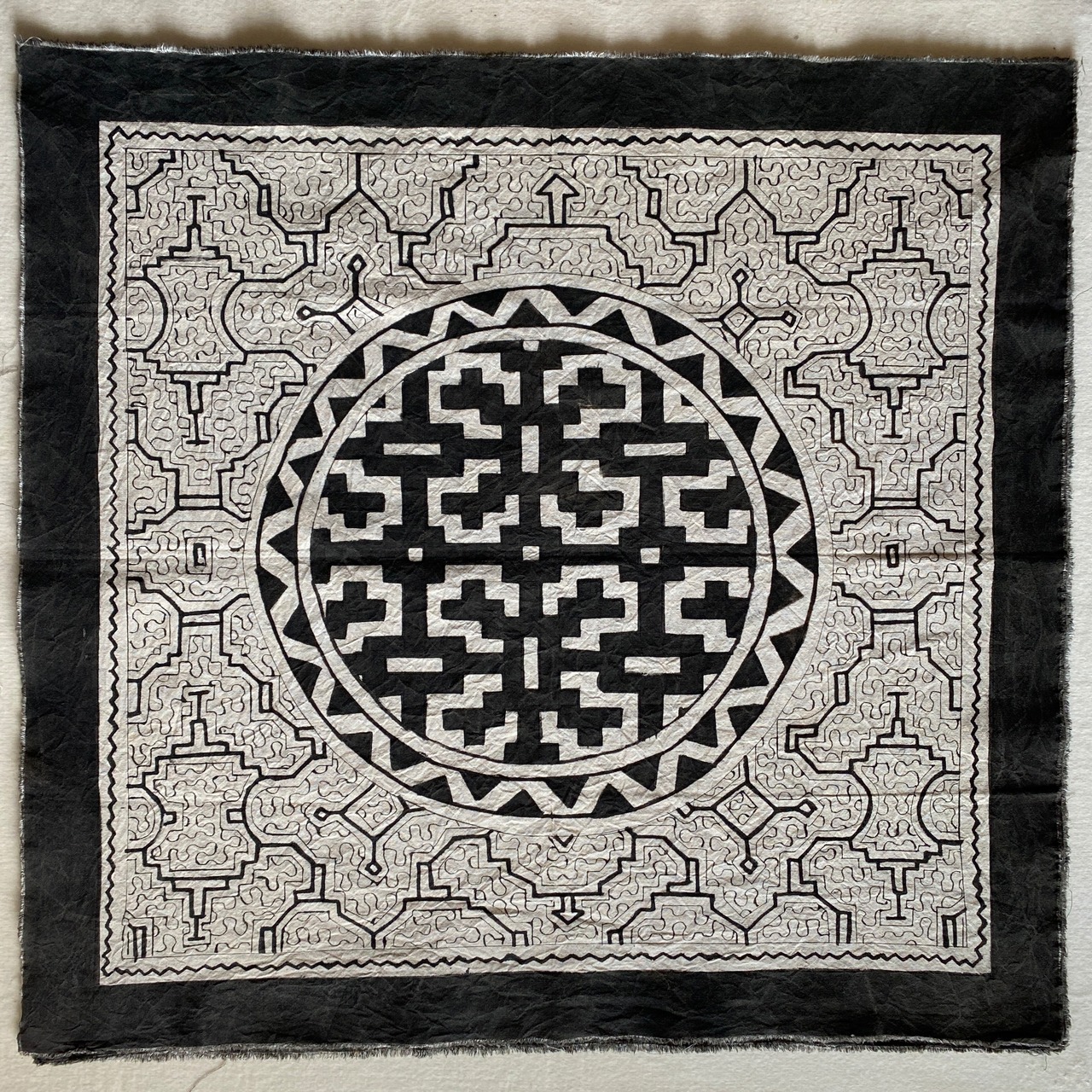 アマゾンの泥染めは、マホガニー樹皮に含まれるタンニンと泥の鉄分の反応によって模様を黒く染めるのが特徴です。シピボ族の女性によって描かれるフリーハンドの幾何学模様は、「天から降りてくる」と言われ、図案化されたものではありません。アマゾン大地の恵み、自然由来の深い色と風合いは神秘的な魅力を放ちます。
