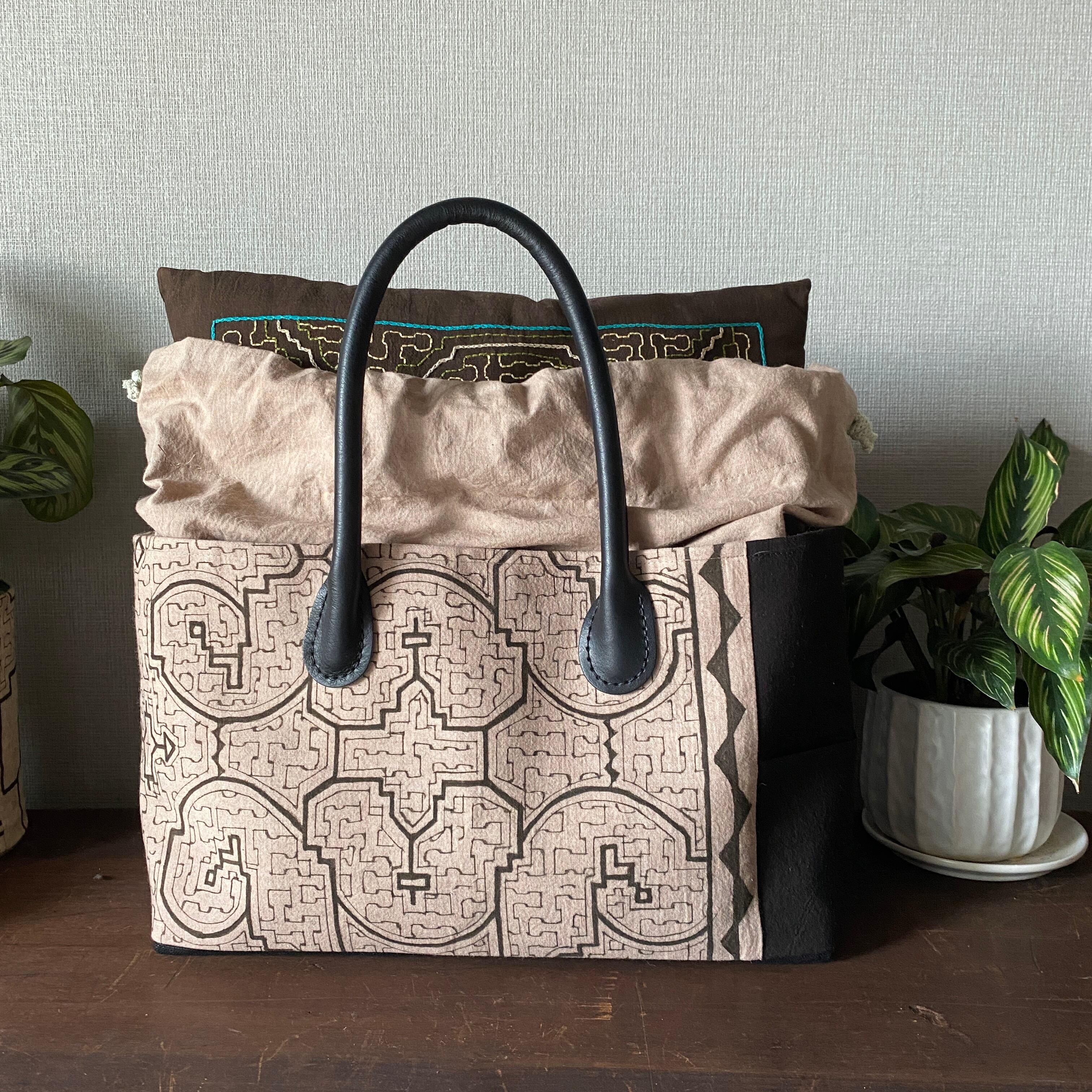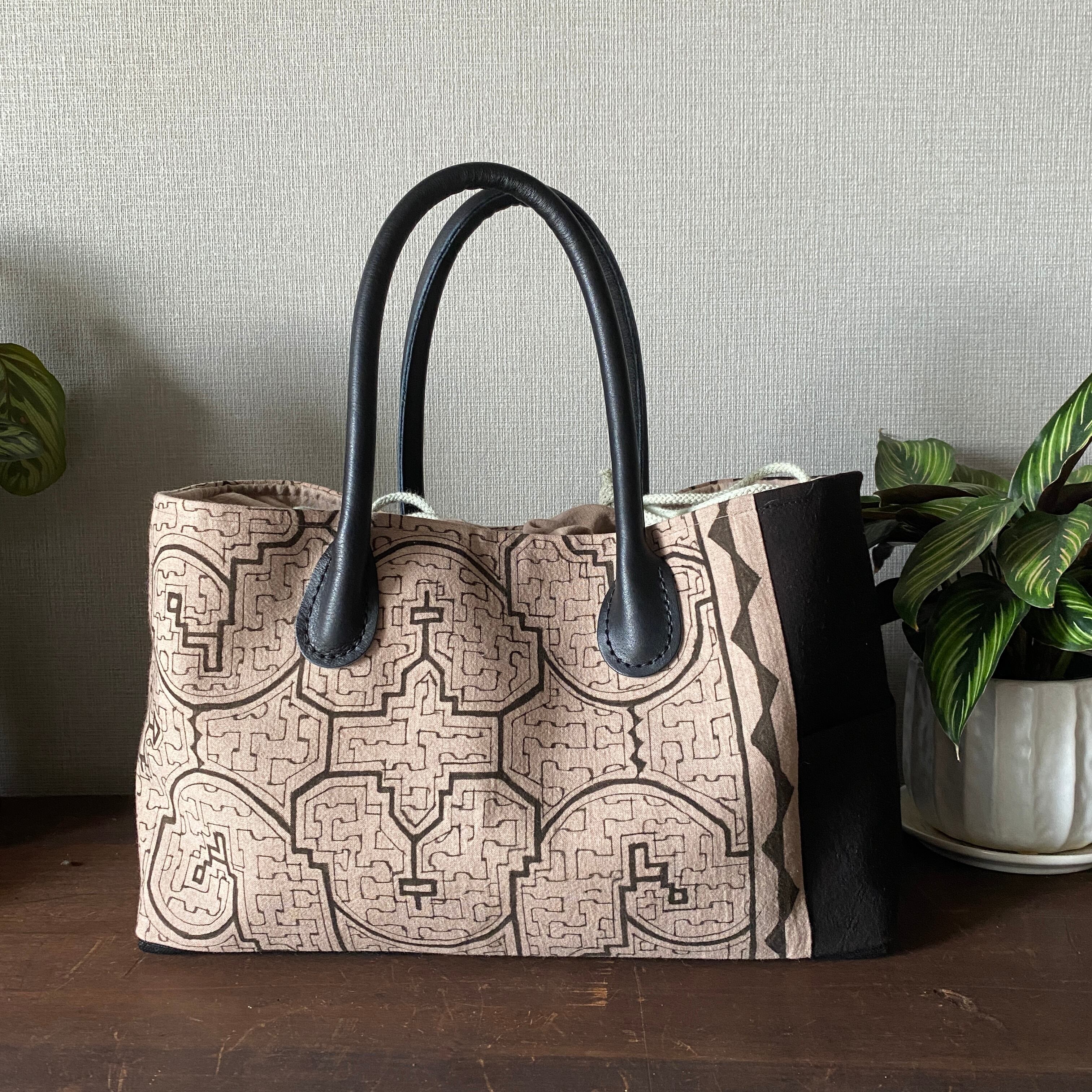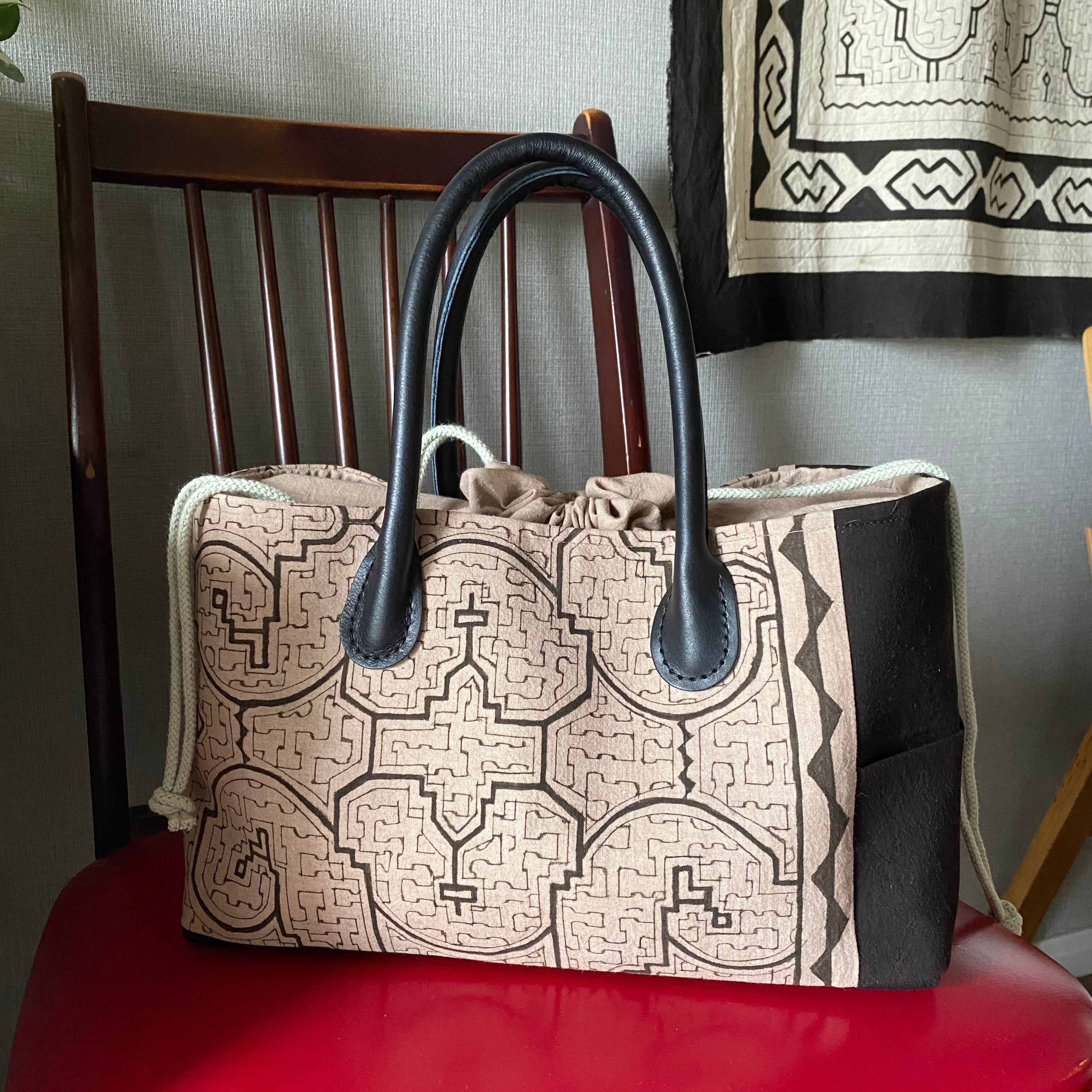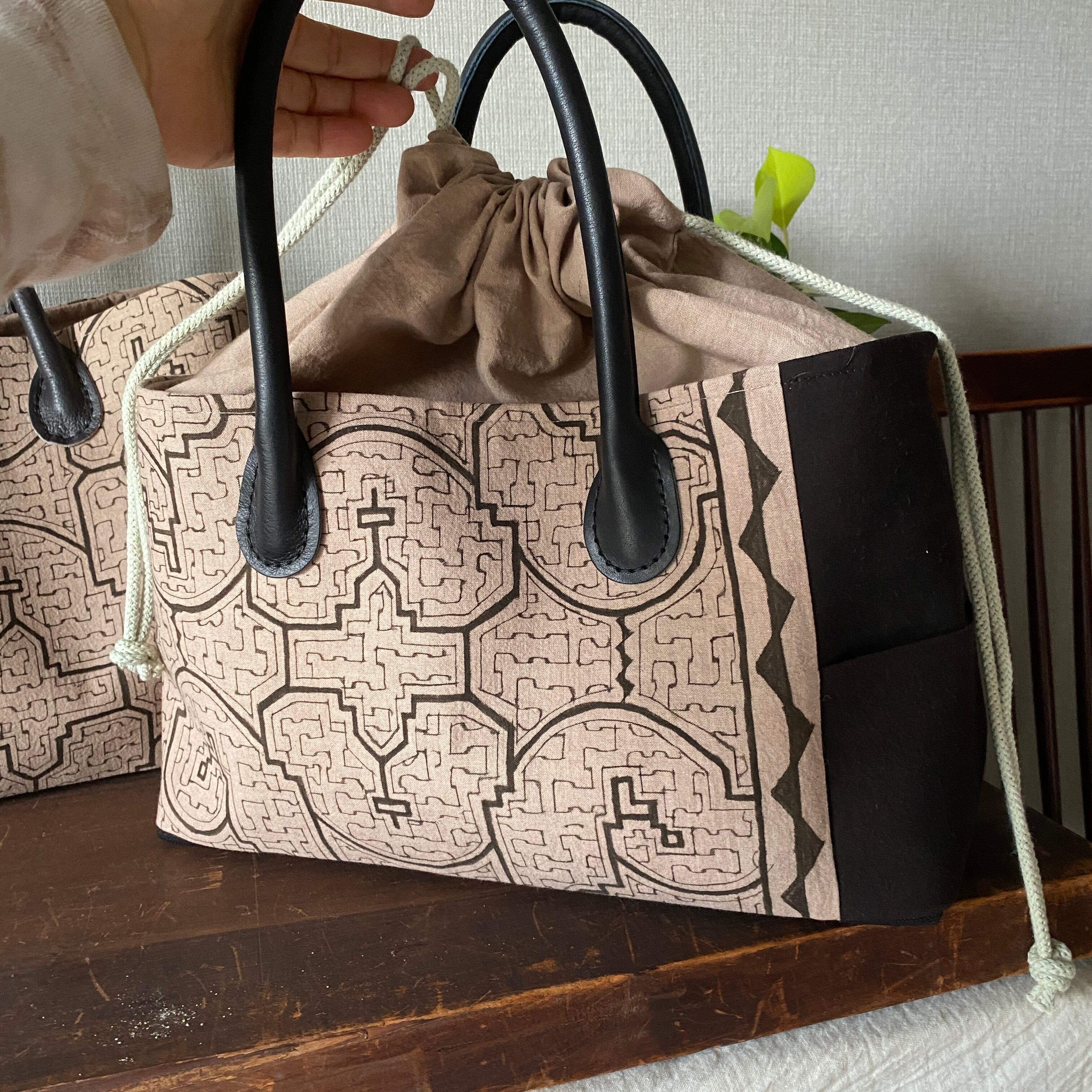 片側に黒の泥染めとバランスよくアレンジしたデザインバッグです。牛本革ソフトレザーの持ち手を手縫いで取り付けています。厚みの分中身が見えやすいので巾着部分がかぶさるアマゾン屋の定番バッグスタイルです。浅さくて横に長いので中身が見えやすく使いやすいバッグ。