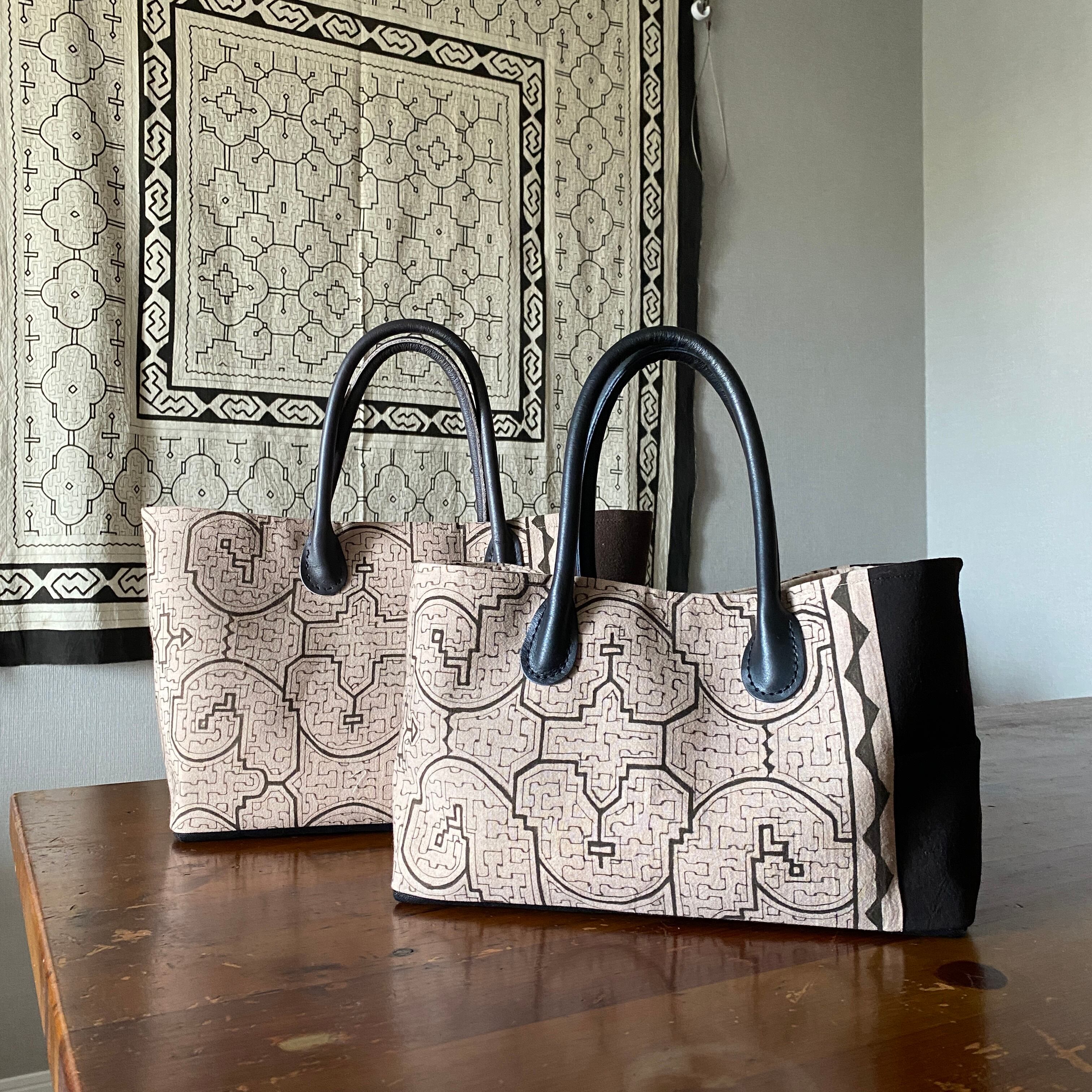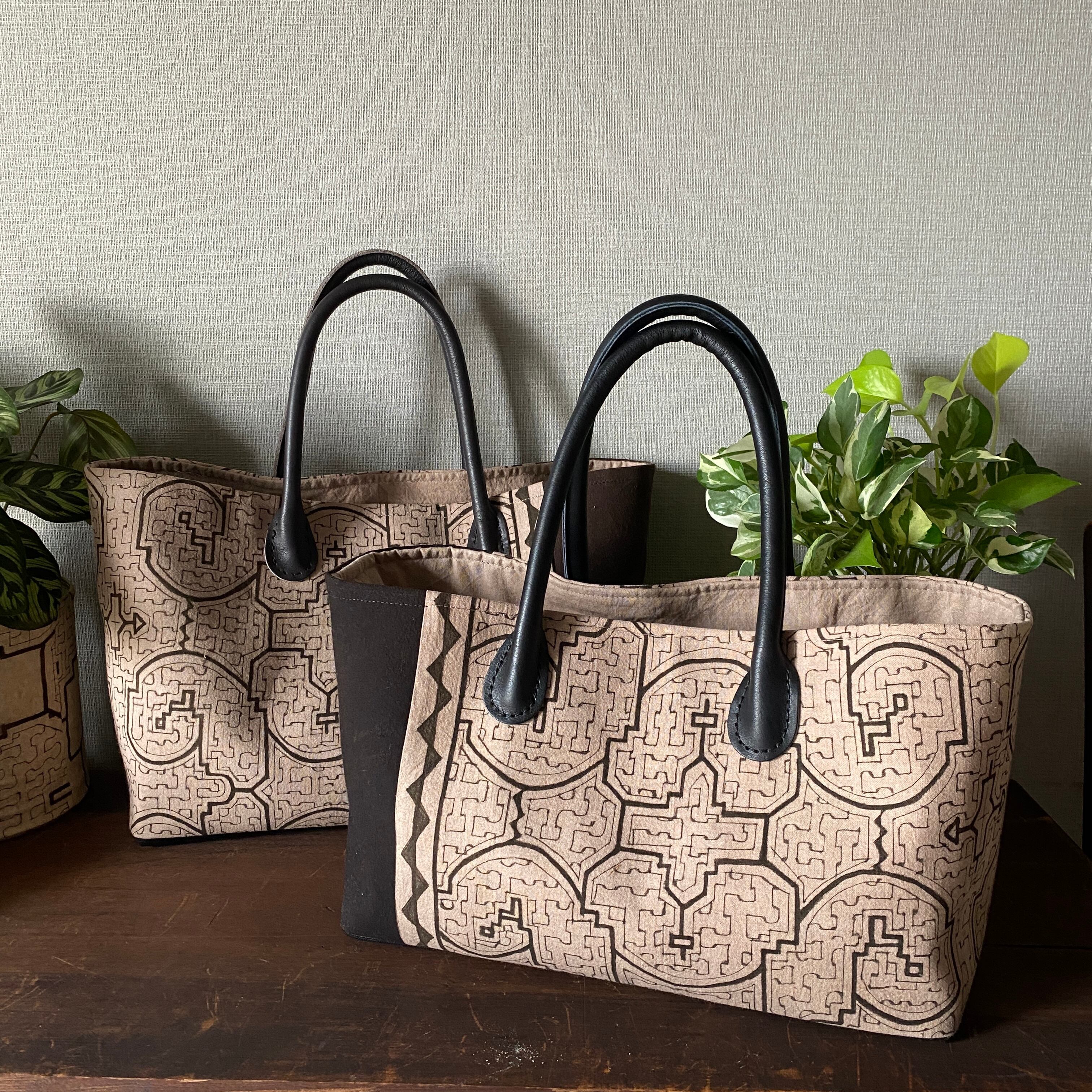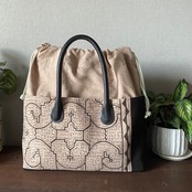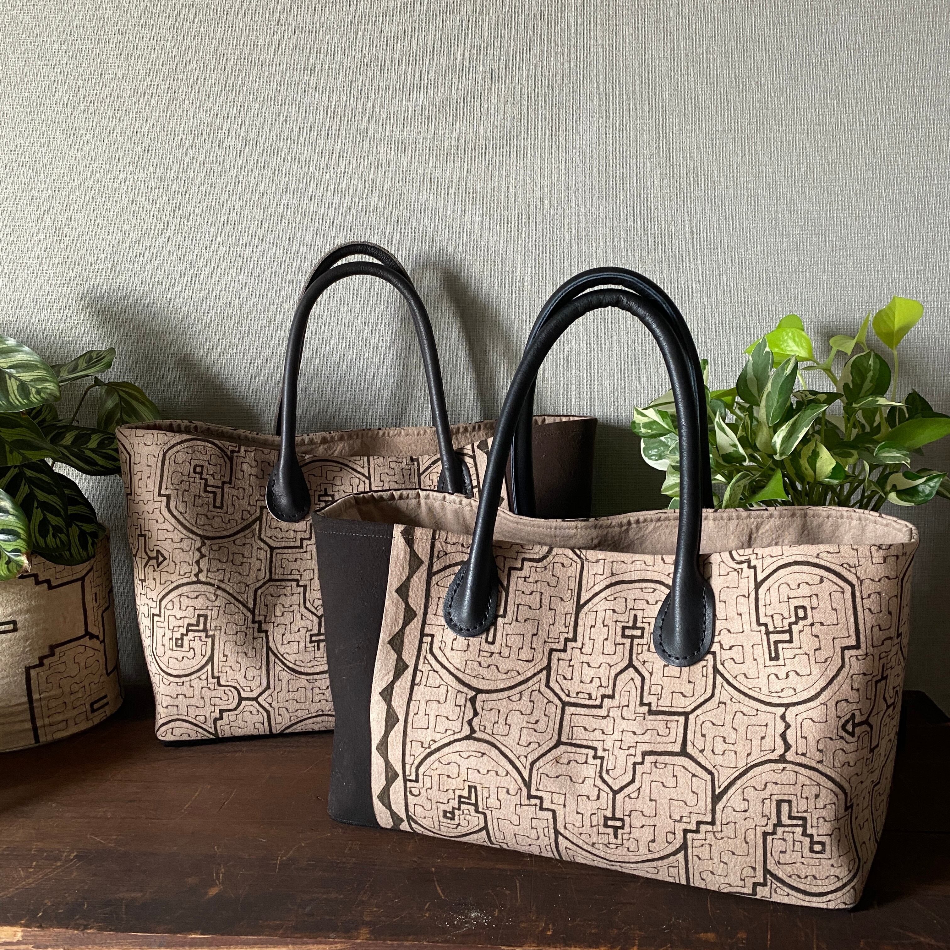 片側に黒の泥染めとバランスよくアレンジしたデザインバッグです。牛本革ソフトレザーの持ち手を手縫いで取り付けています。厚みの分中身が見えやすいので巾着部分がかぶさるアマゾン屋の定番バッグスタイルです。浅さくて横に長いので中身が見えやすく使いやすいバッグ。
