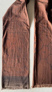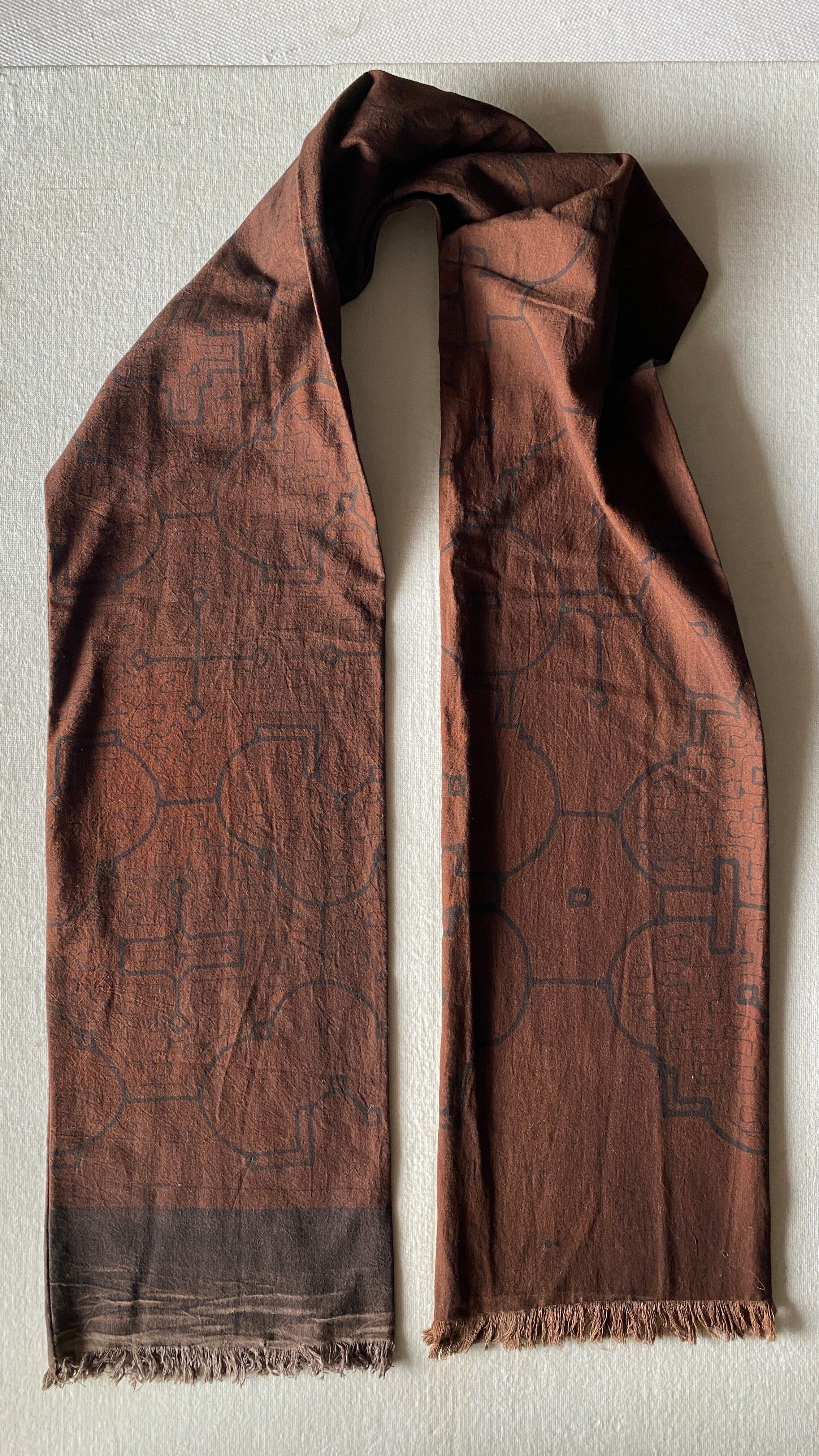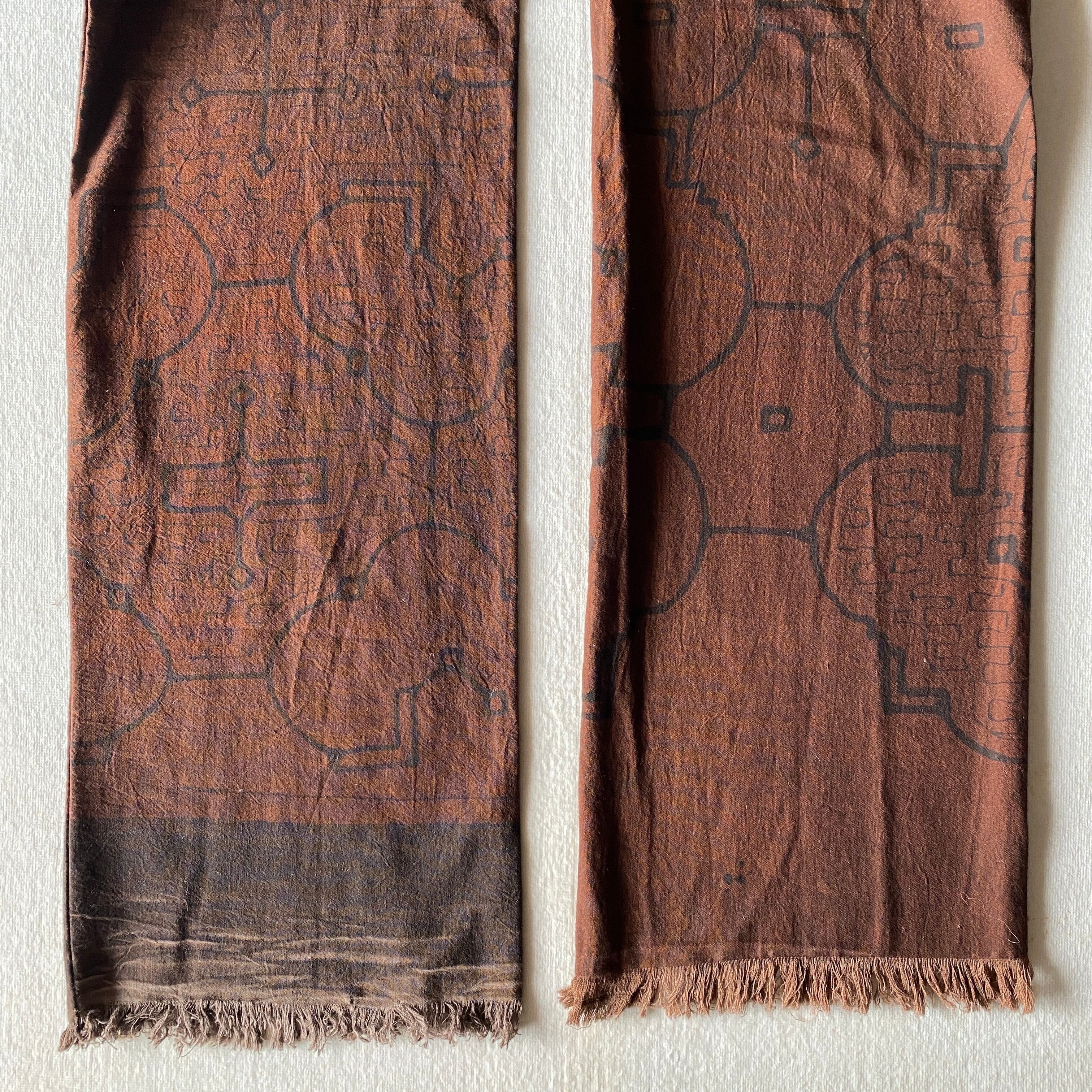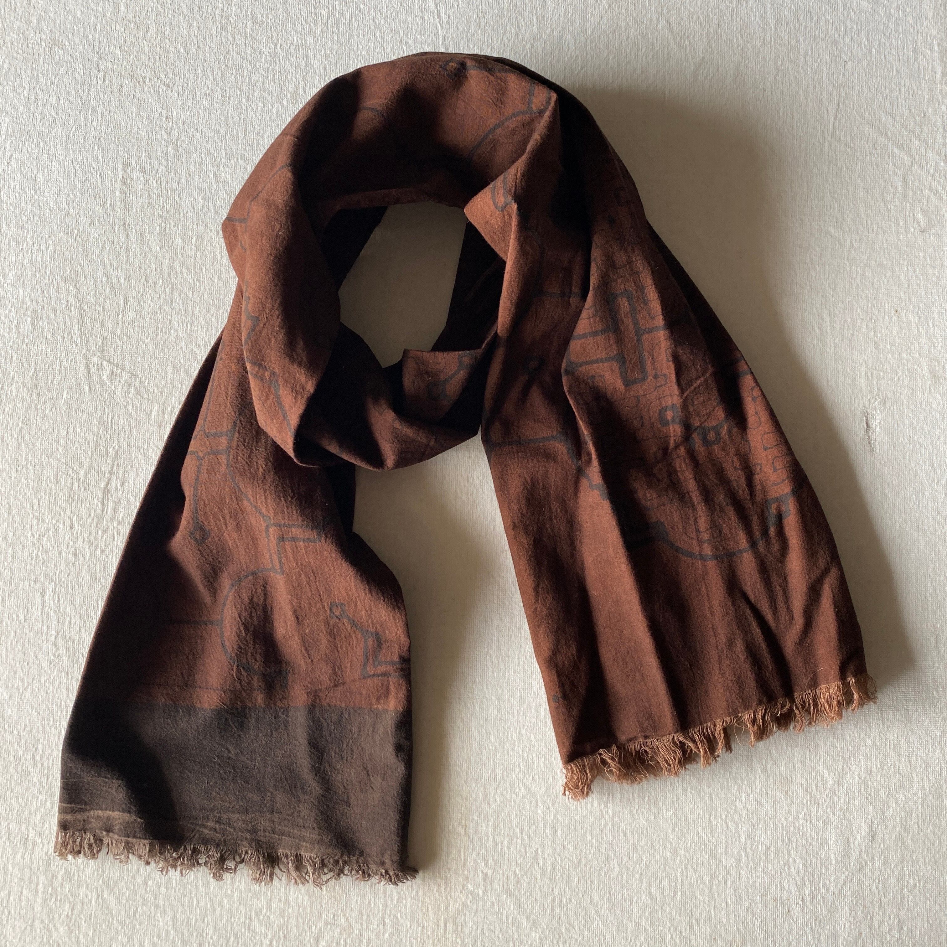 柔らかく肌に馴染むコットン素材で茶染めに二度めの泥染めをして泥染めの鉄分で焦茶を深くしているので色落ちはほとんどありません。地色が濃いので写真では見えにくいですが