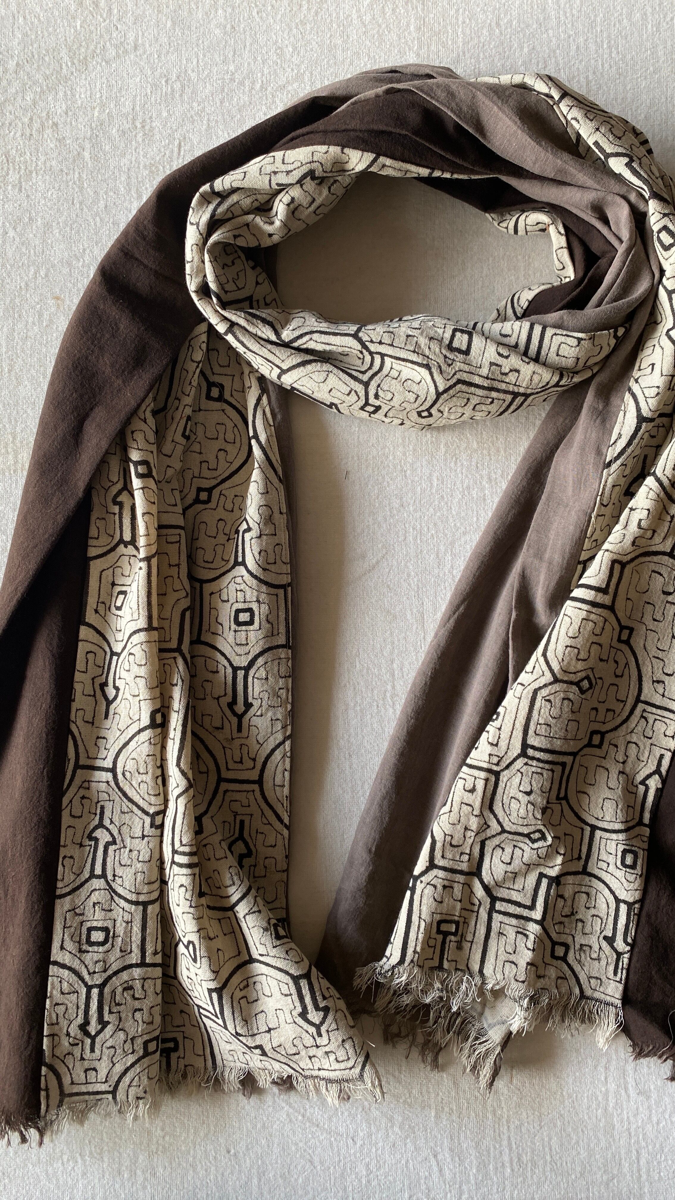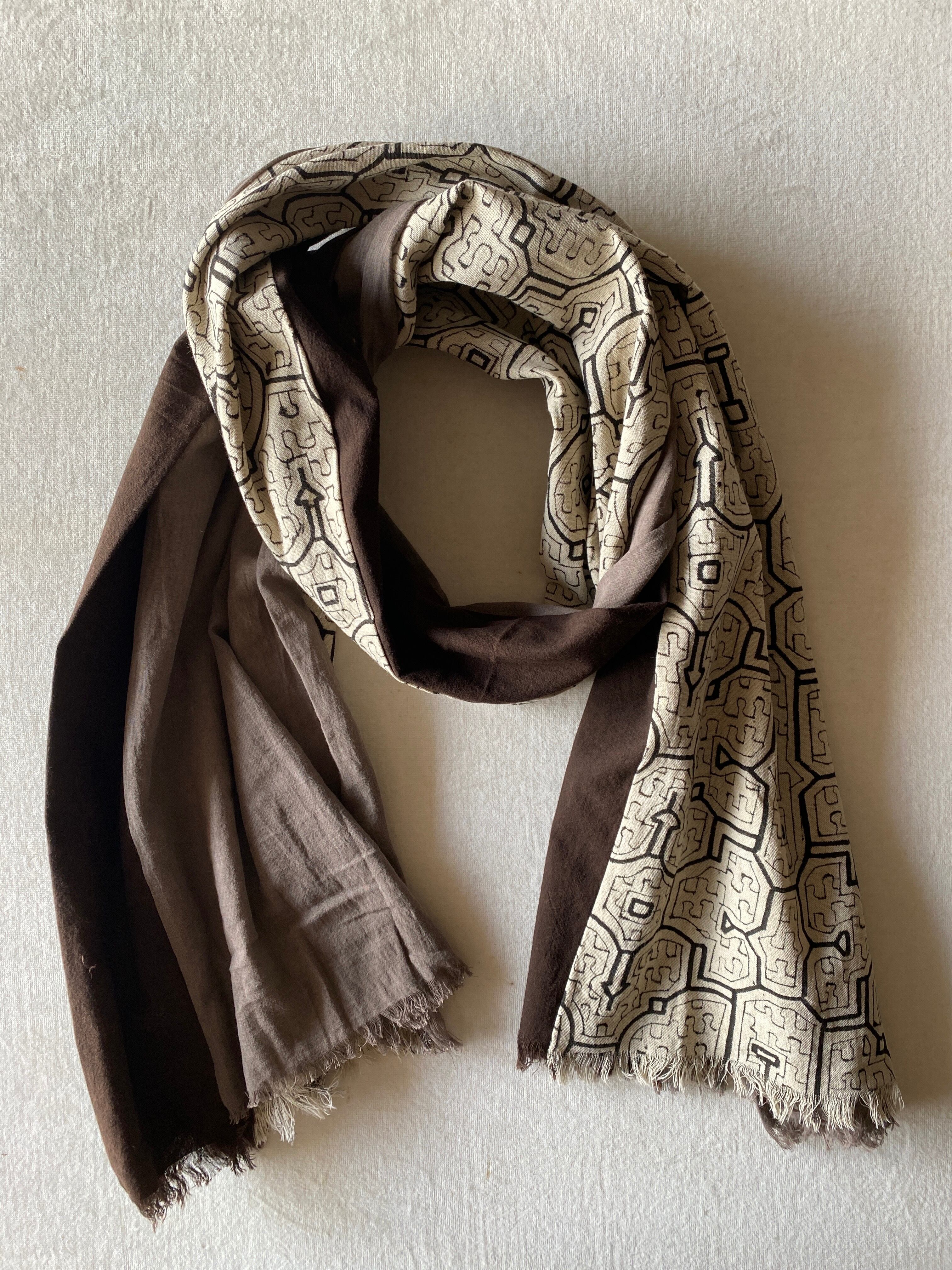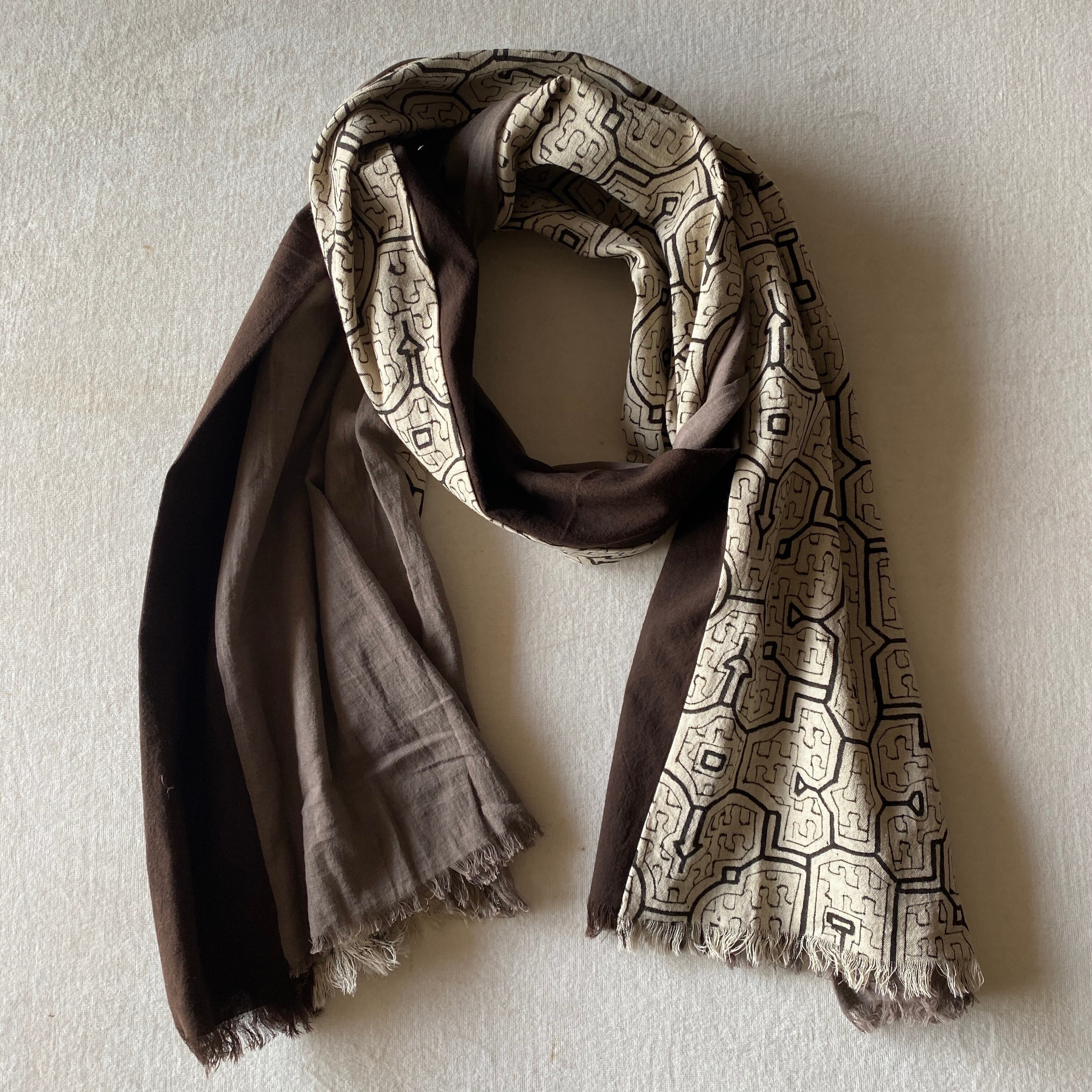超特大サイズの大判を細長く使用して黒とグレーのアマゾンの泥染めを贅沢に合わせた最も贅沢な組み合わせ。また色々に合わせやすく、模様を出しても裏にして無地で使ったり色々に楽しめる