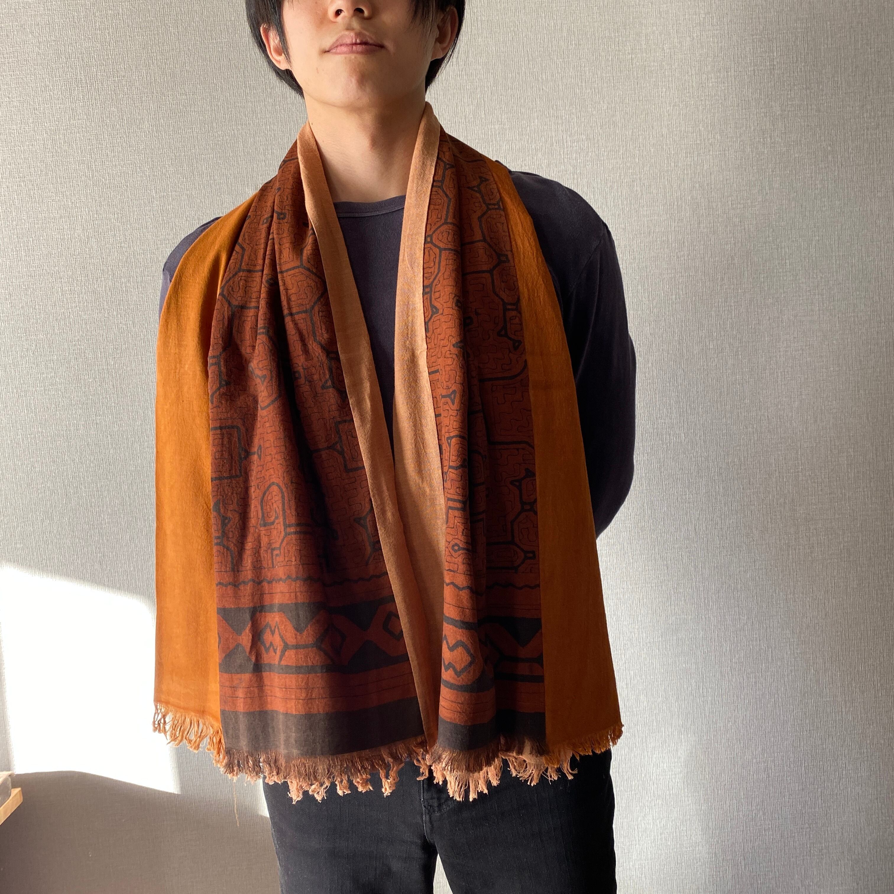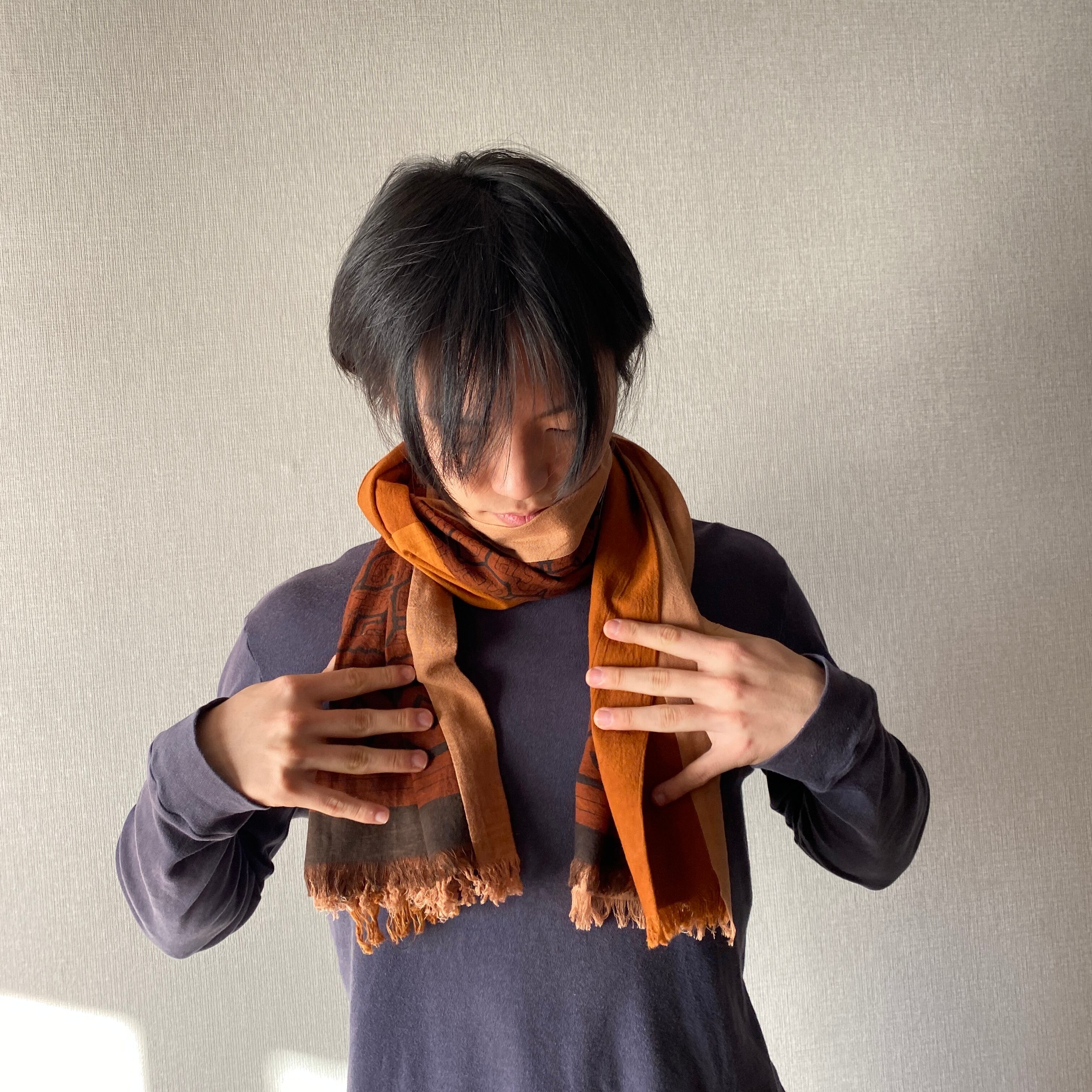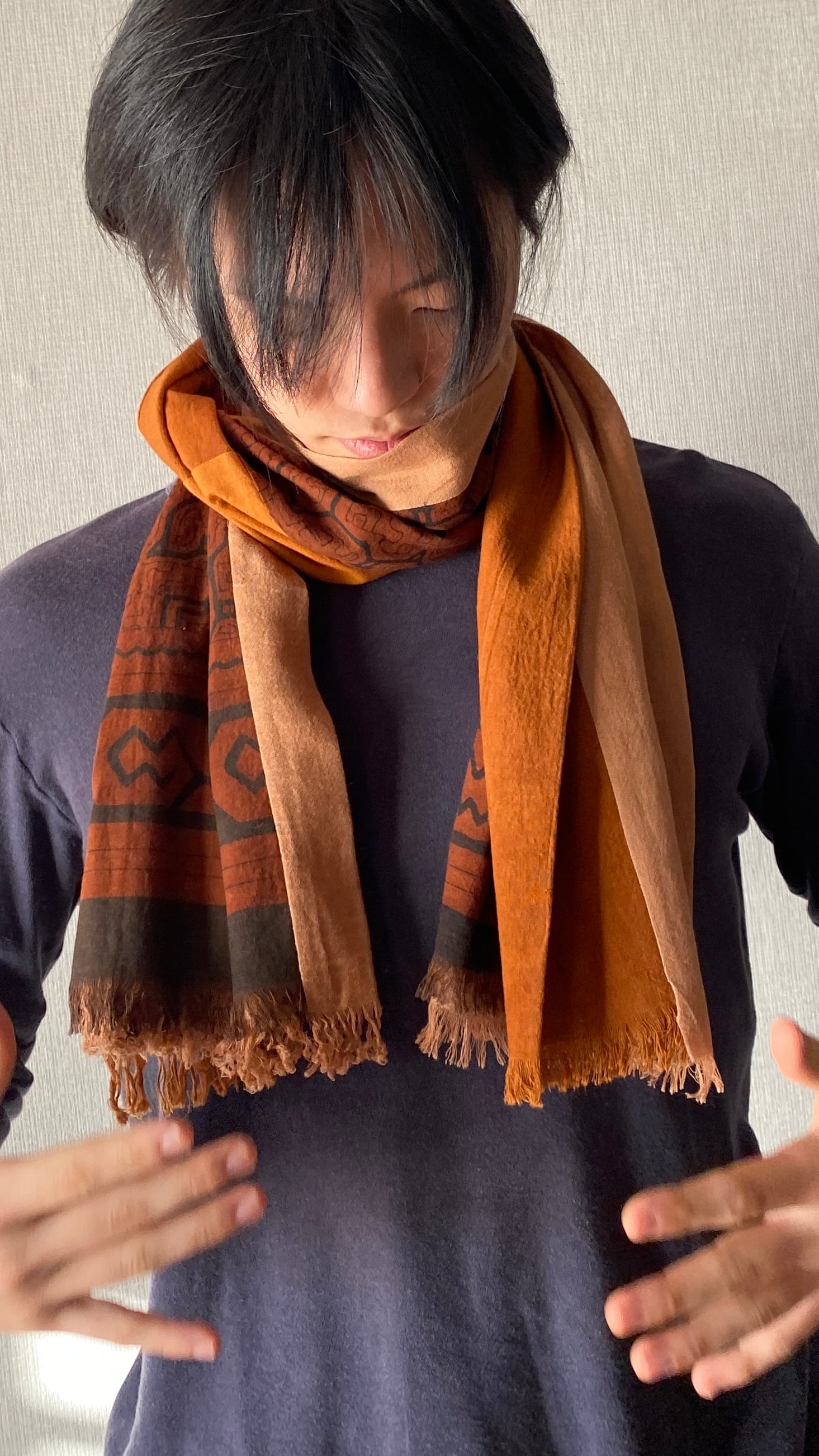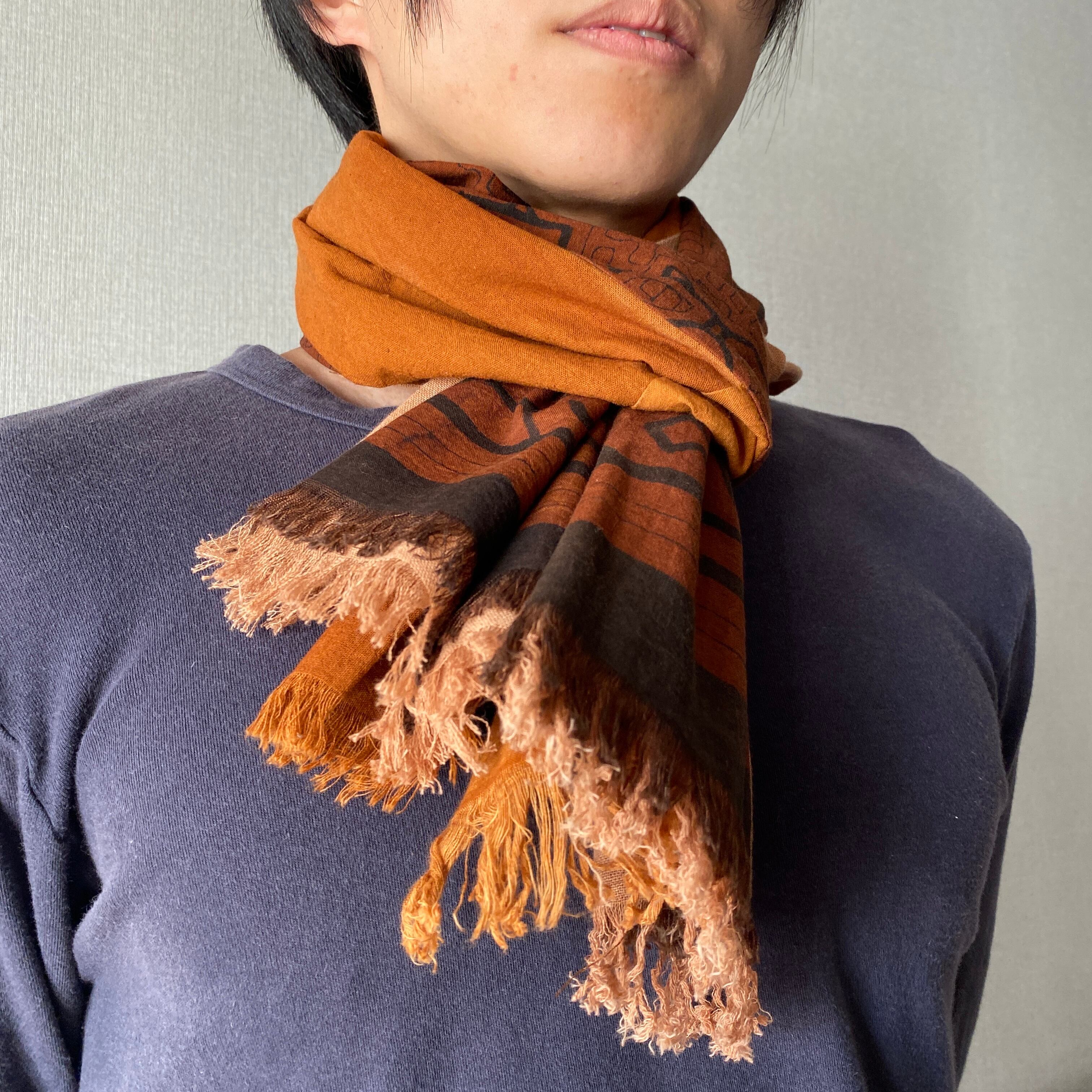 無地明るい茶の生地が特にしっかり目で、長さ150cmで幅が広く布がたっぷりで全体的にずっしり感があり、首に巻くとキツいくらいなので、少し無地部分を減らしてリメイク、調整しようかと考え中。もちろんこのままでもボリュームがあってとても良い。