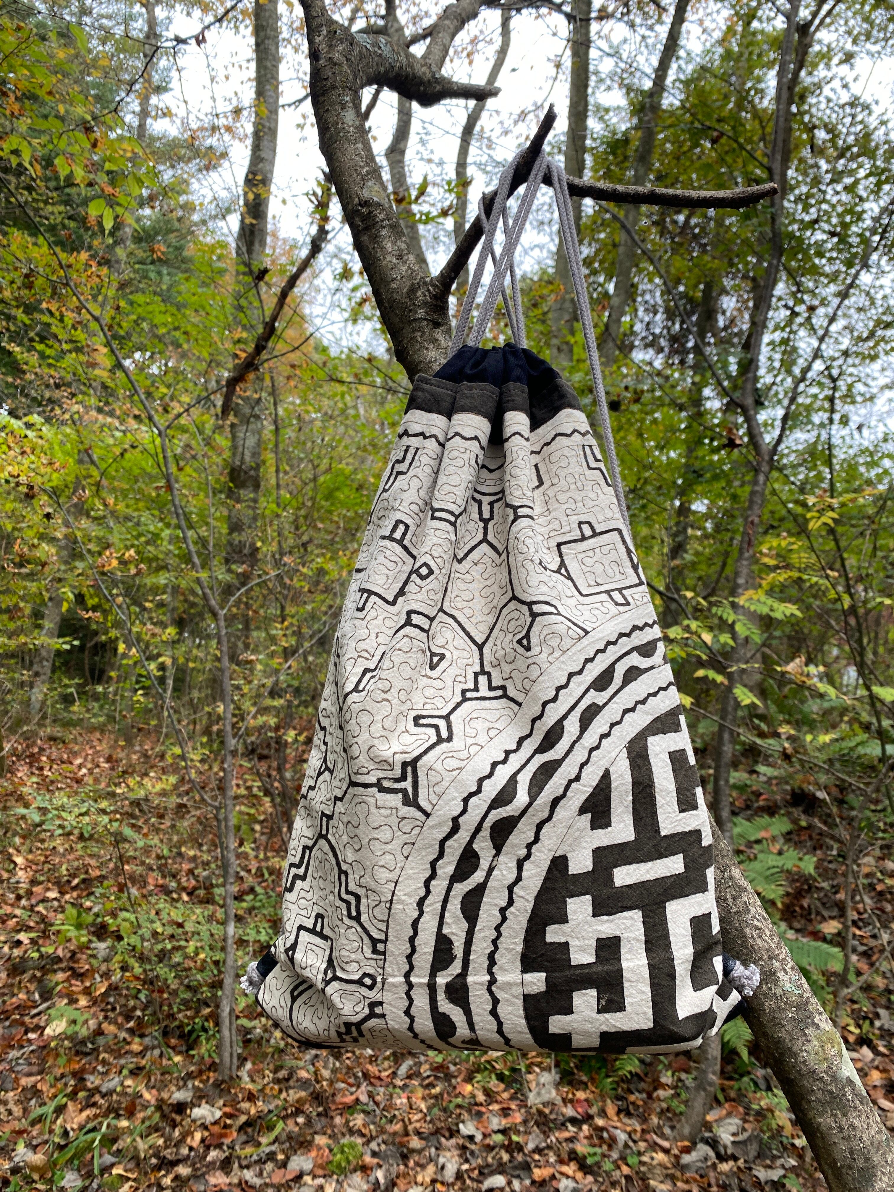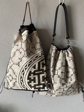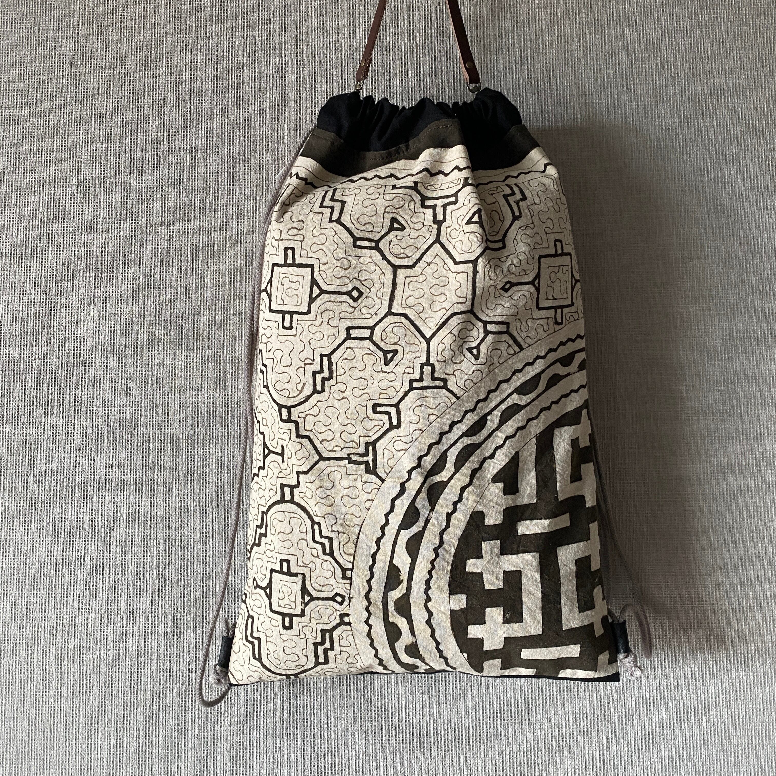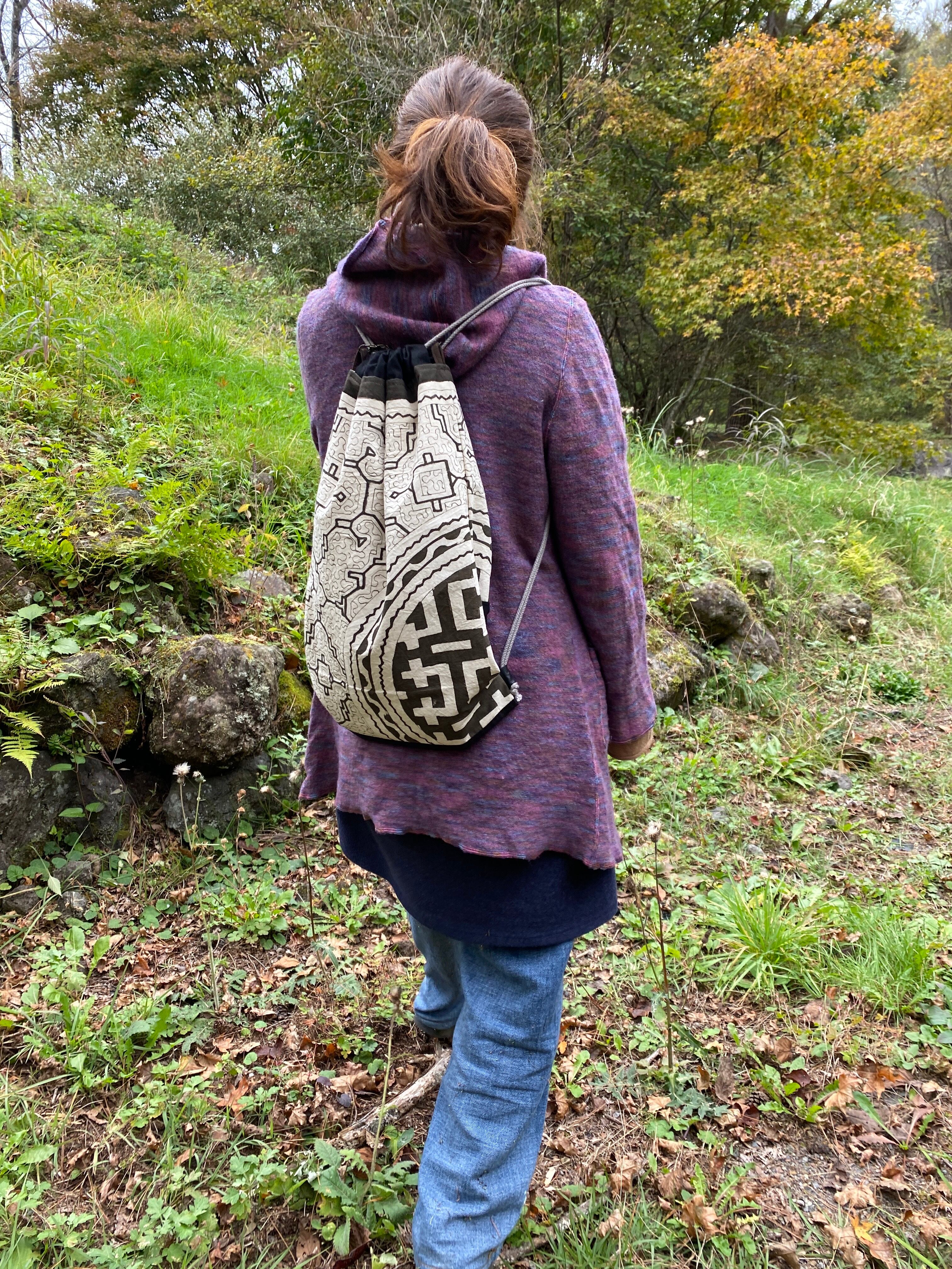 円に太い線のある個性的な中型布を半分使用して作ったナップサックで、持ち手をつけてショルダーにもなります。畳んでエコバッグとして持ち歩くことができ、背負っても細身で体に張り付く感じで使いやすいと思います。旅行や自転車の時のお買い物にも。片面に目立つポケットにしましたが希望によりますう。円に太線デザインの素材でセミオーダー可能。お問い合わせください。