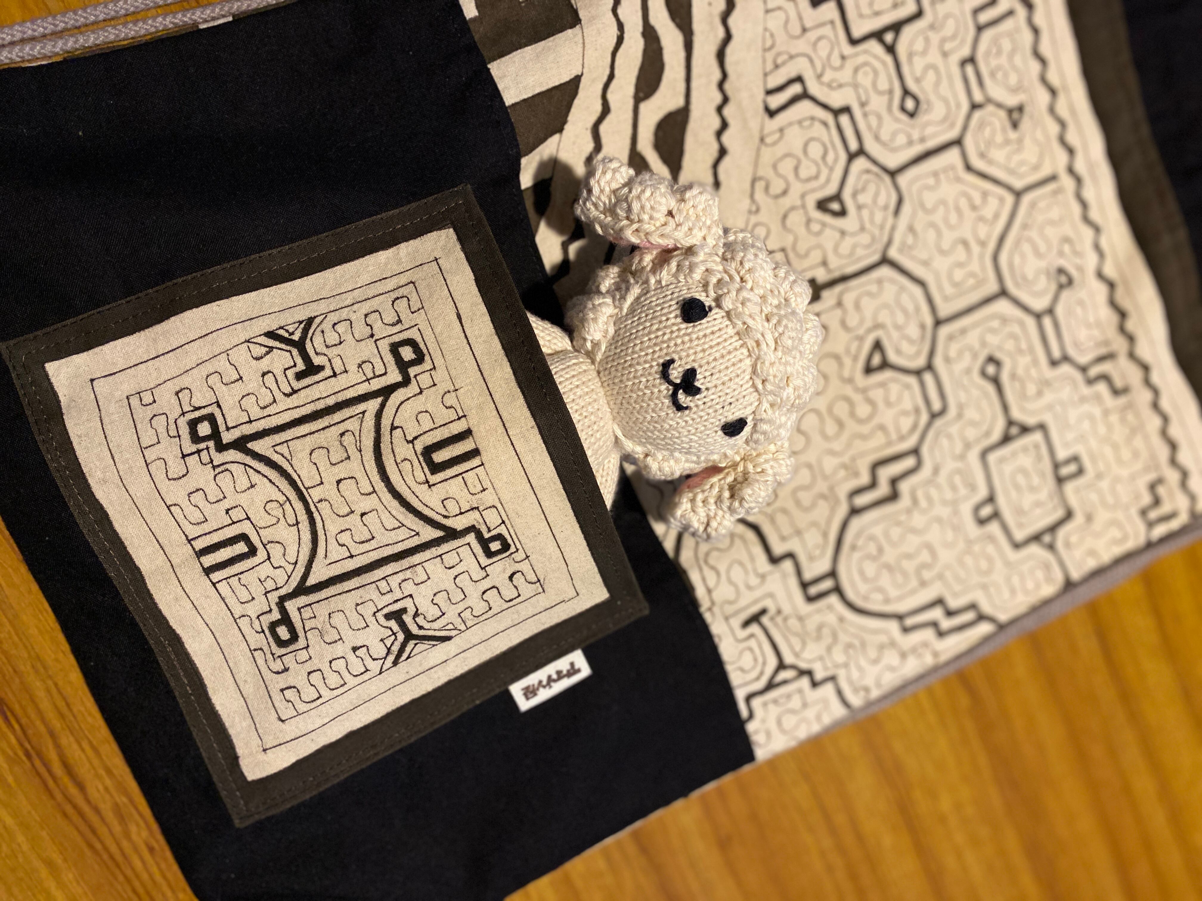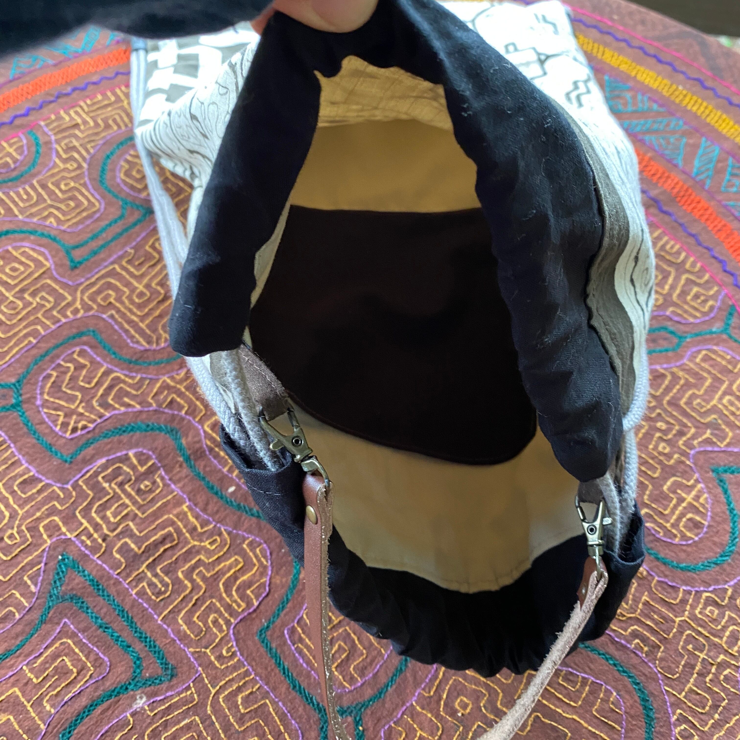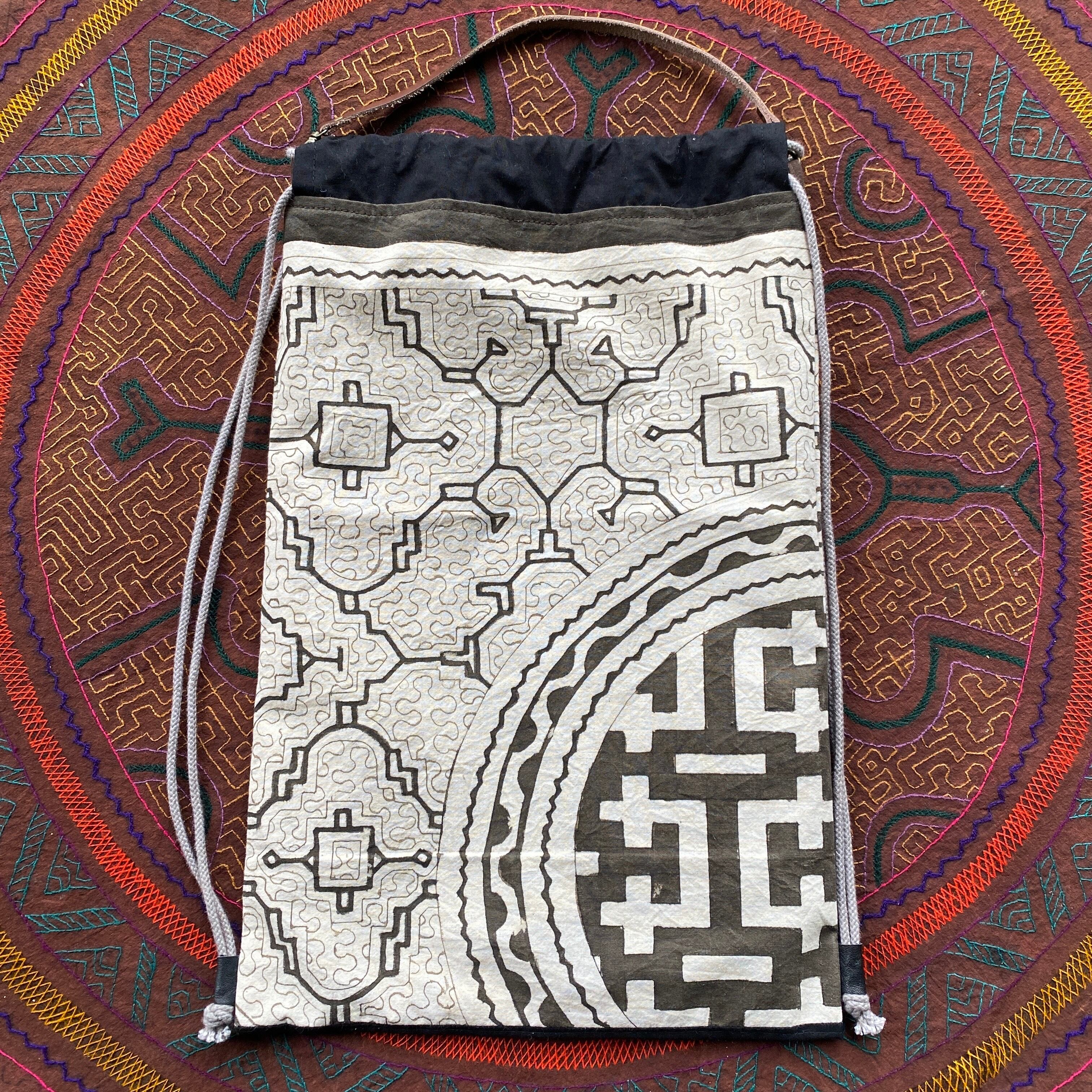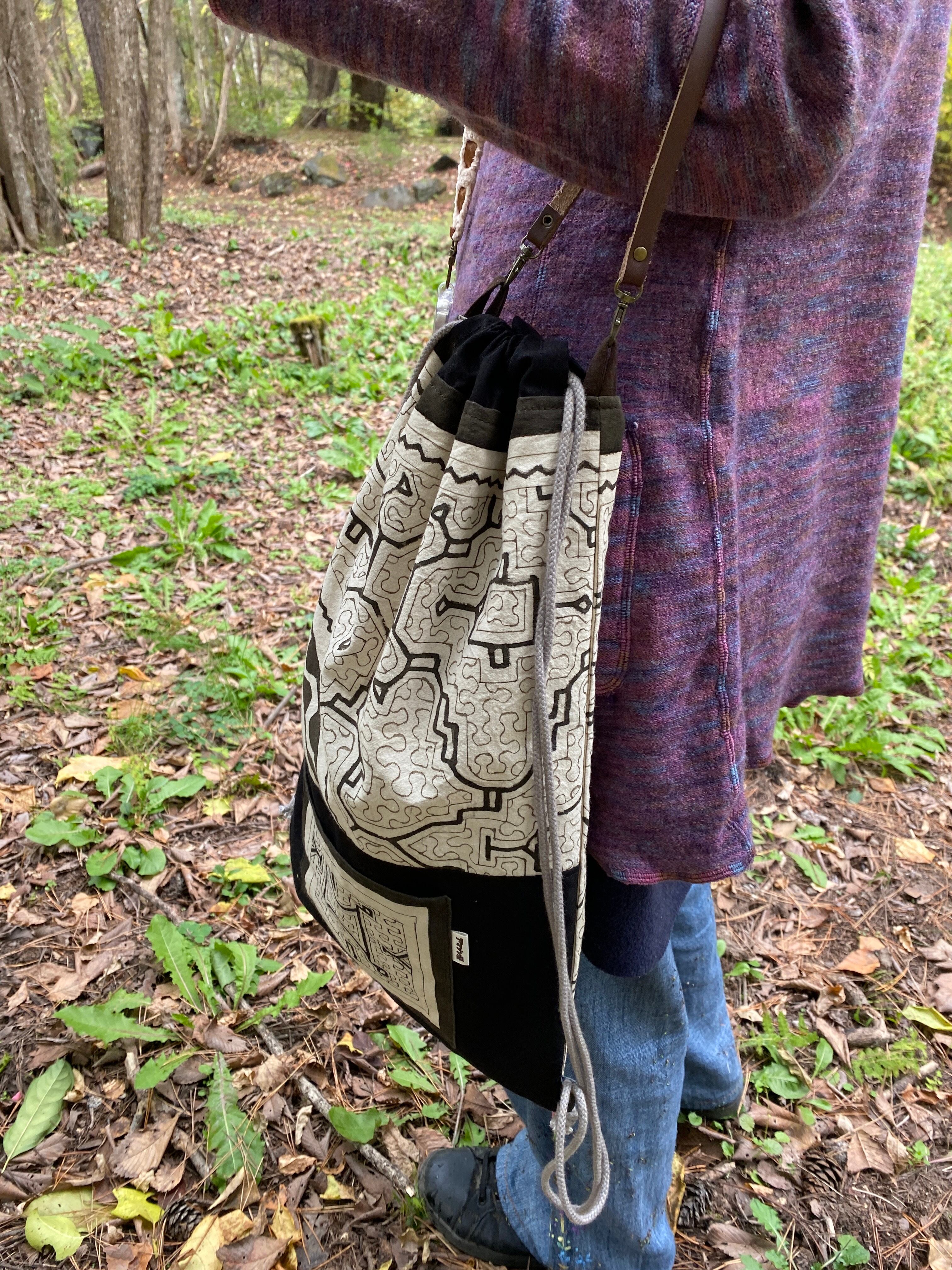 円に太い線のある個性的な中型布を半分使用して作ったナップサックで、持ち手をつけてショルダーにもなります。畳んでエコバッグとして持ち歩くことができ、背負っても細身で体に張り付く感じで使いやすいと思います。旅行や自転車の時のお買い物にも。片面に目立つポケットにしましたが希望によりますう。円に太線デザインの素材でセミオーダー可能。お問い合わせください。