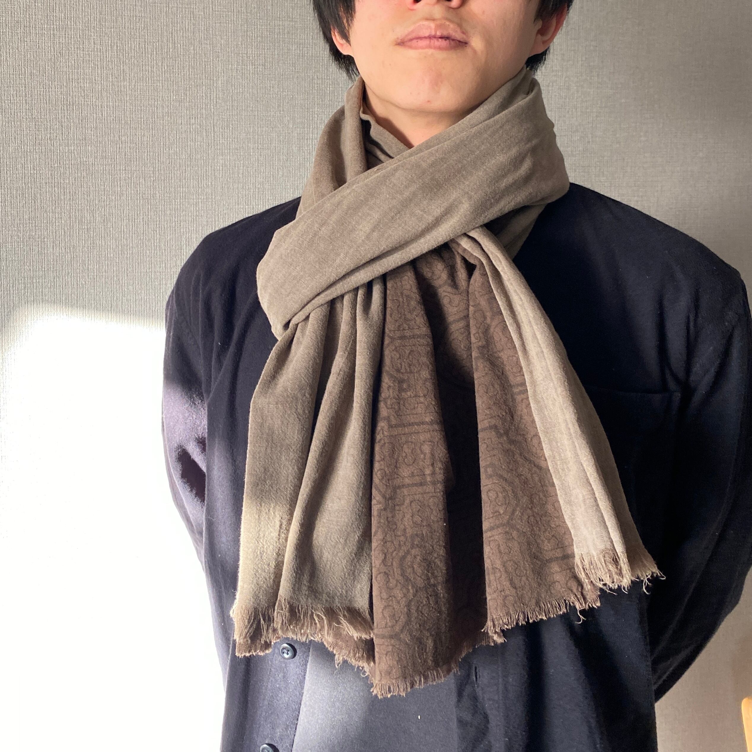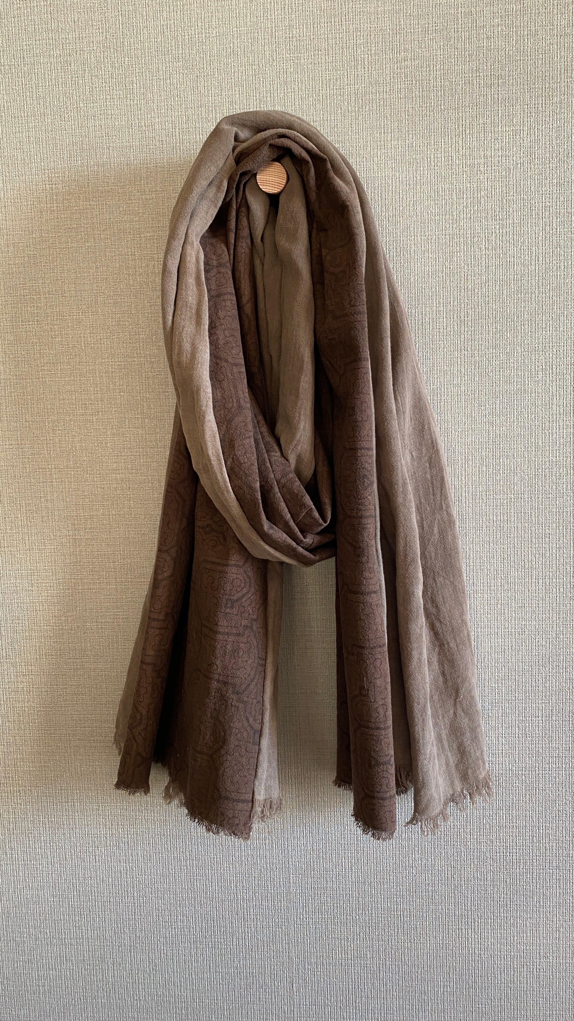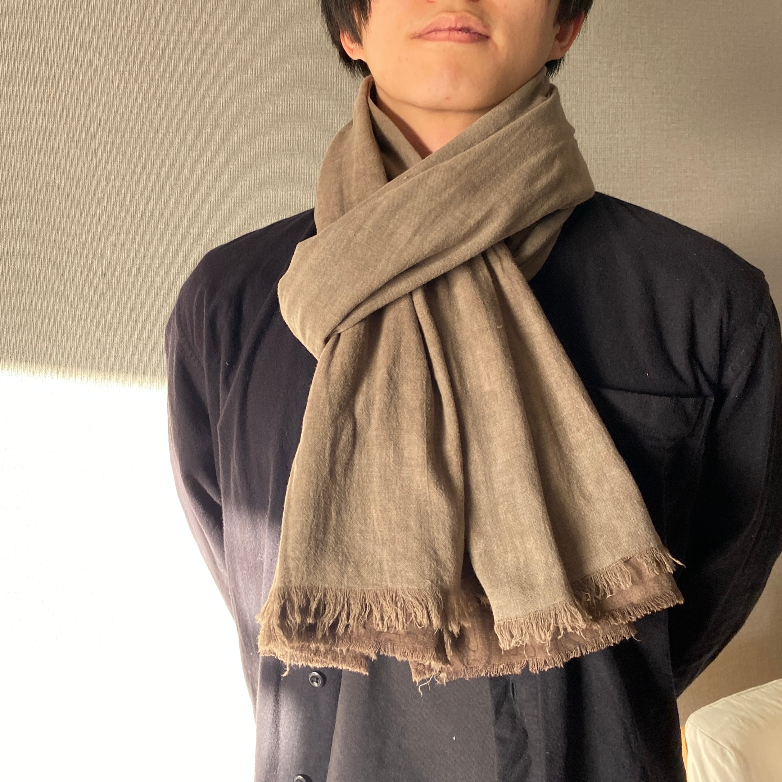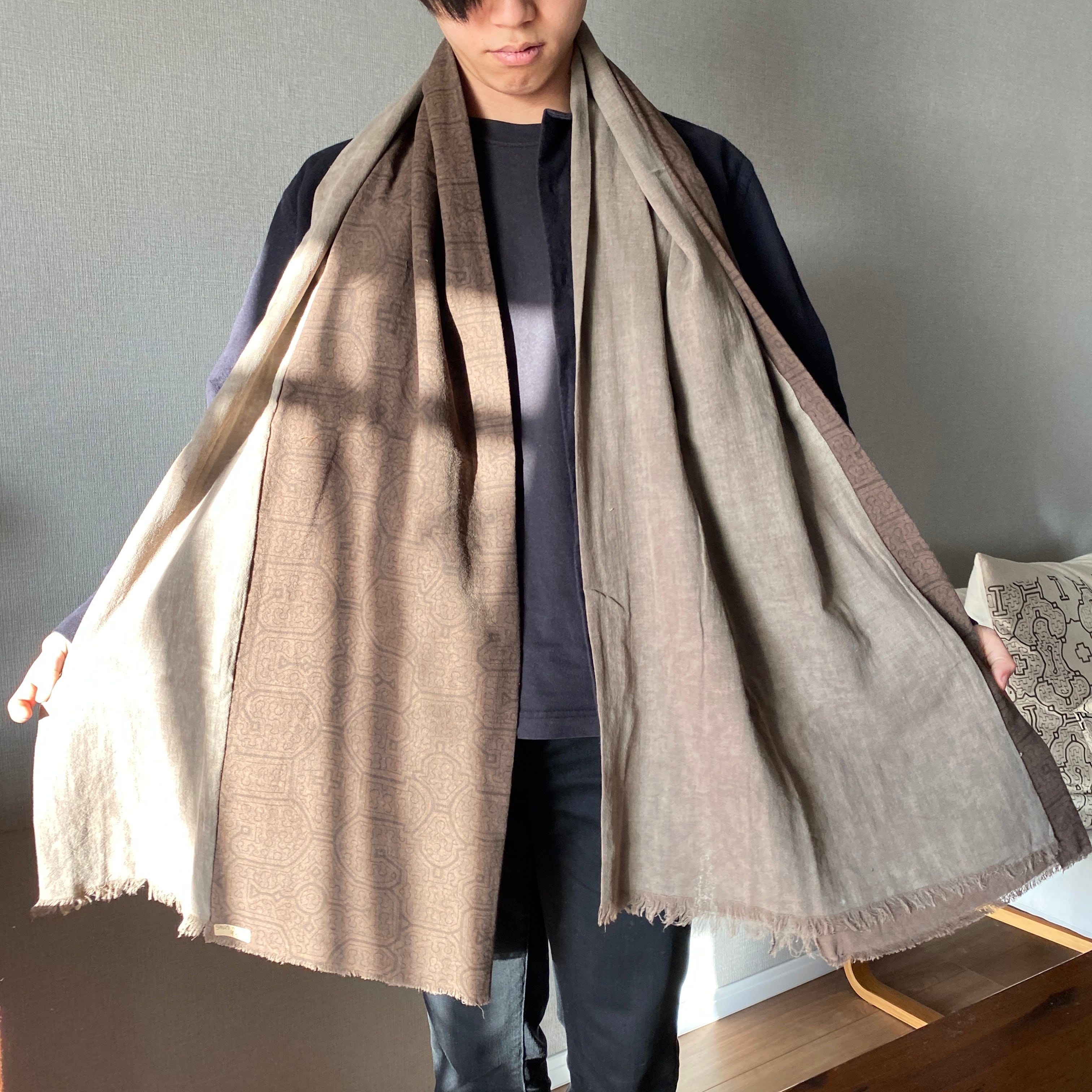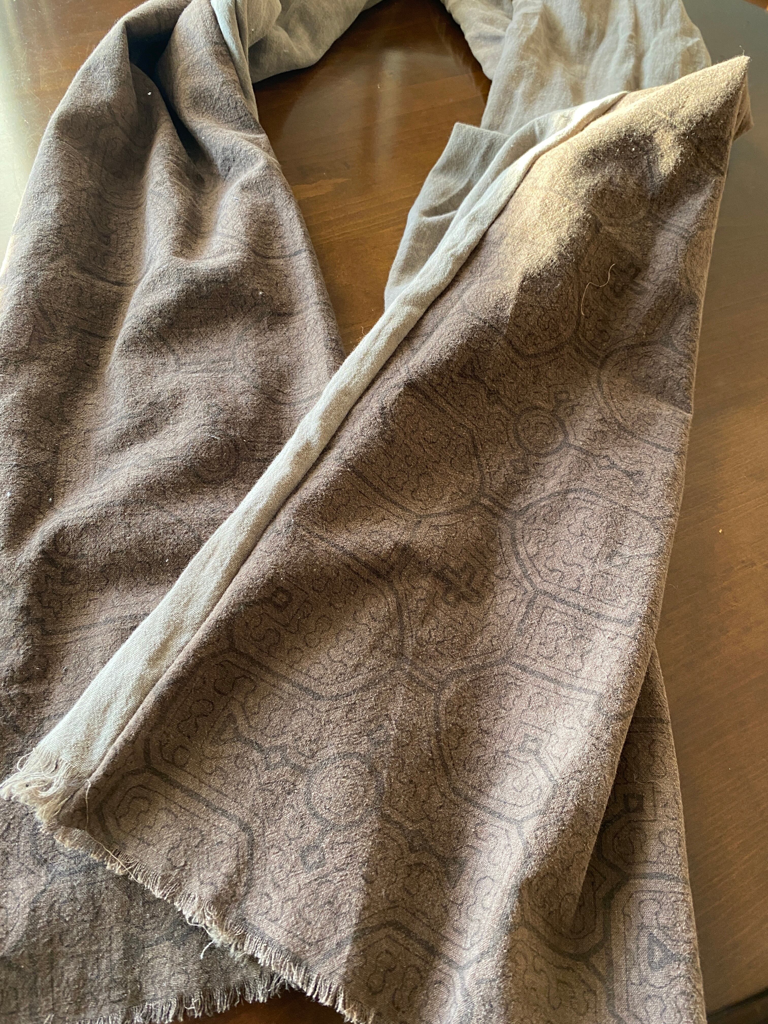 柔らかい生地だったので色味のあう泥染めのグレーと合わせてたっぷりめストールにしてみました。二度とできないストールです