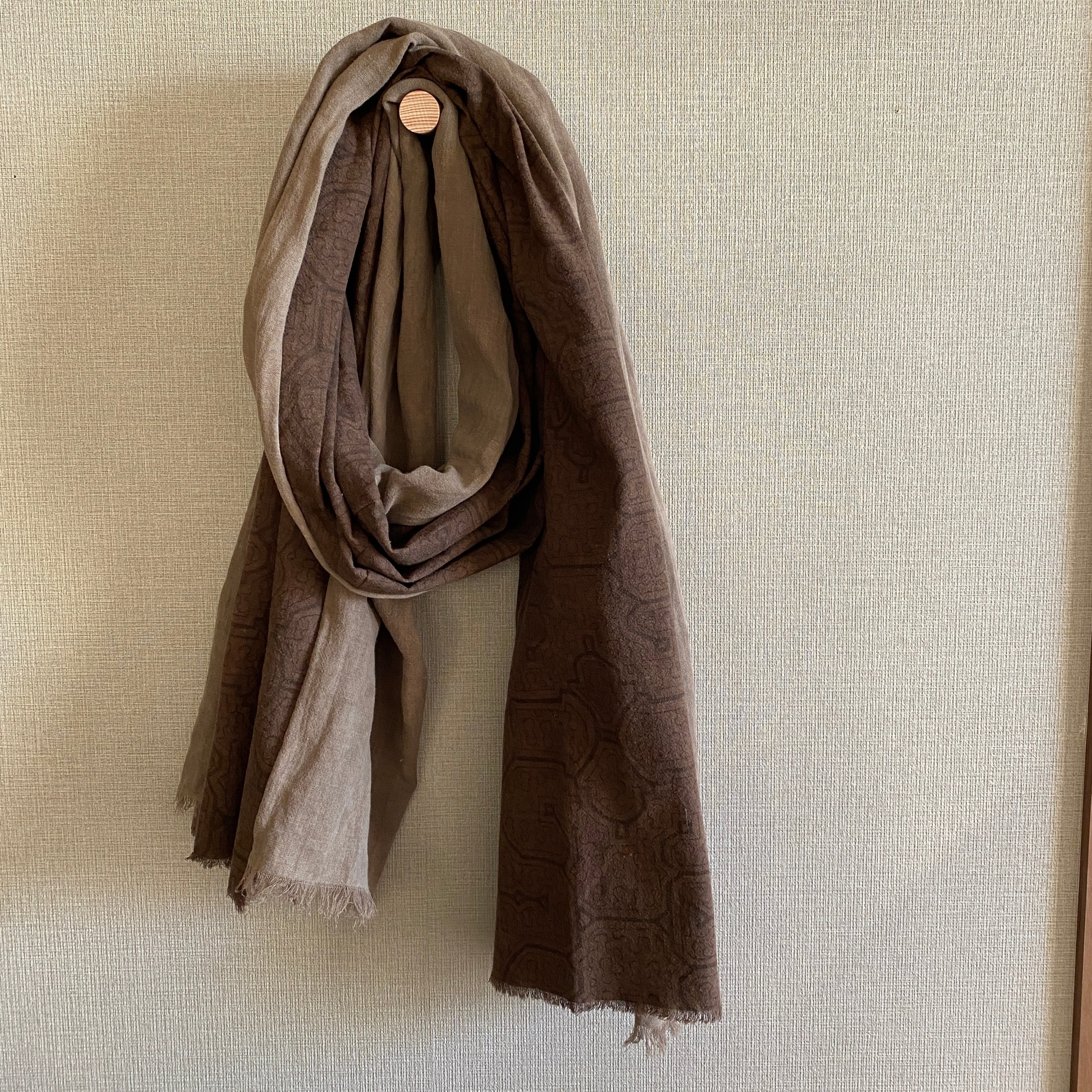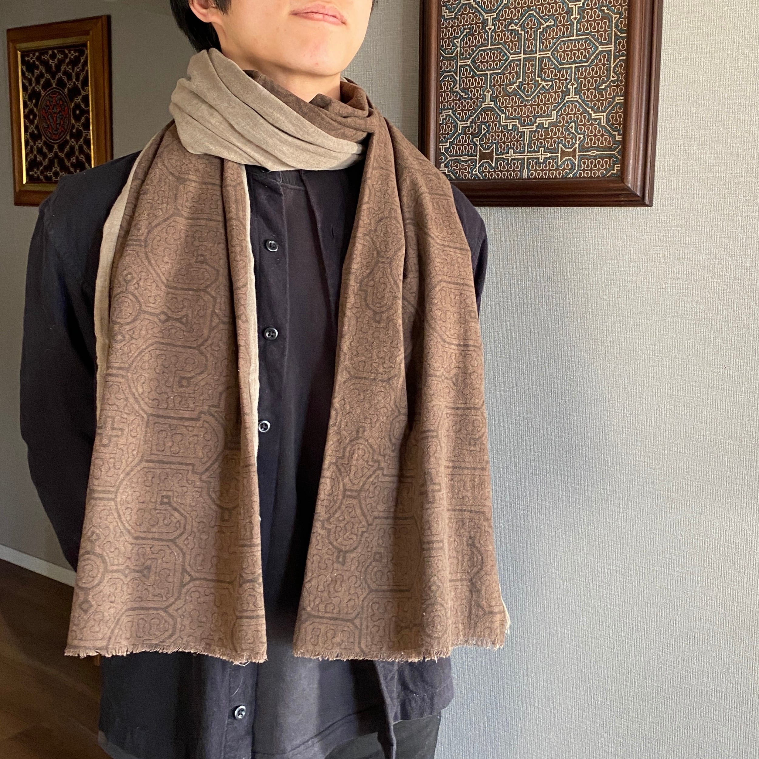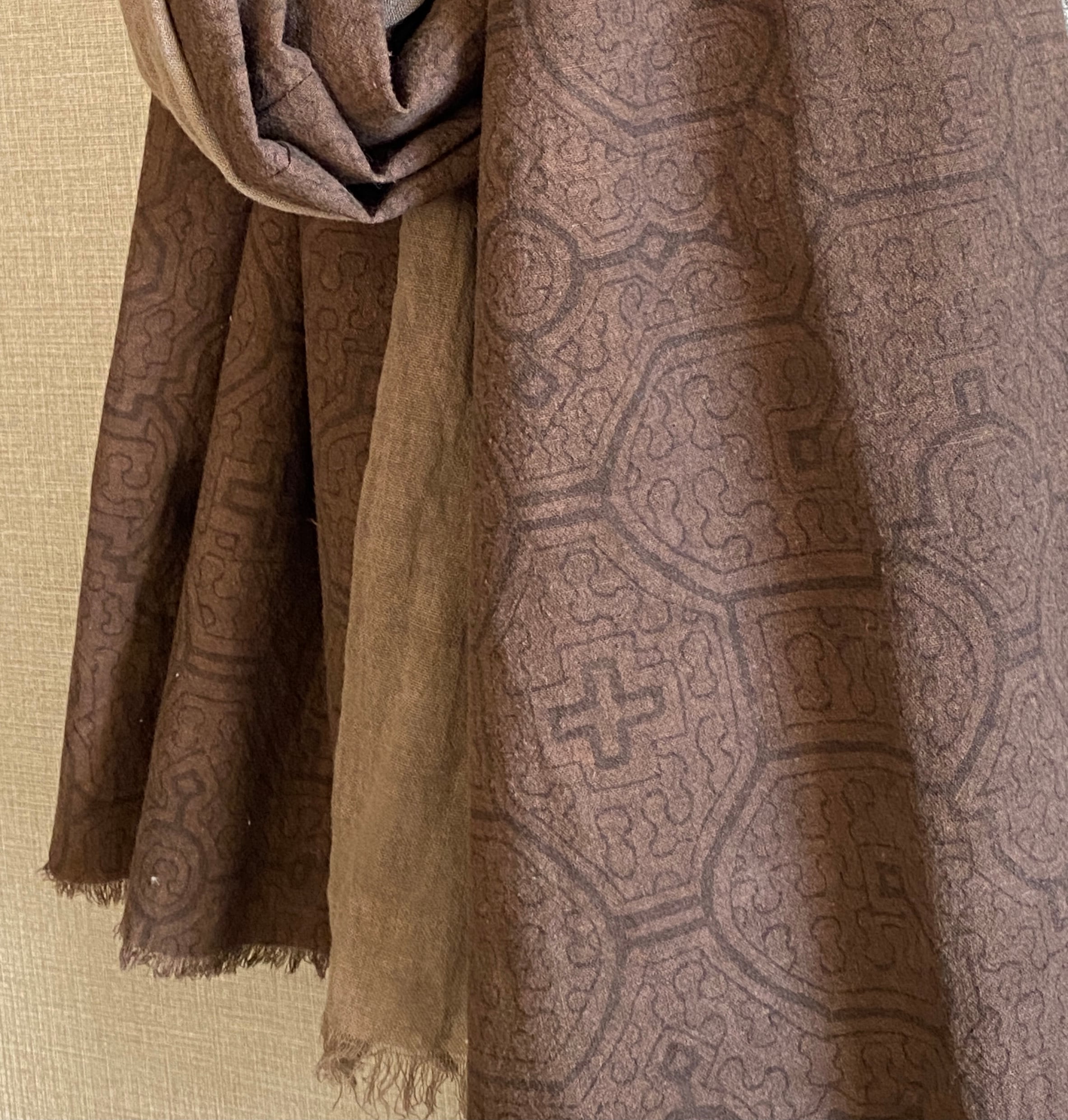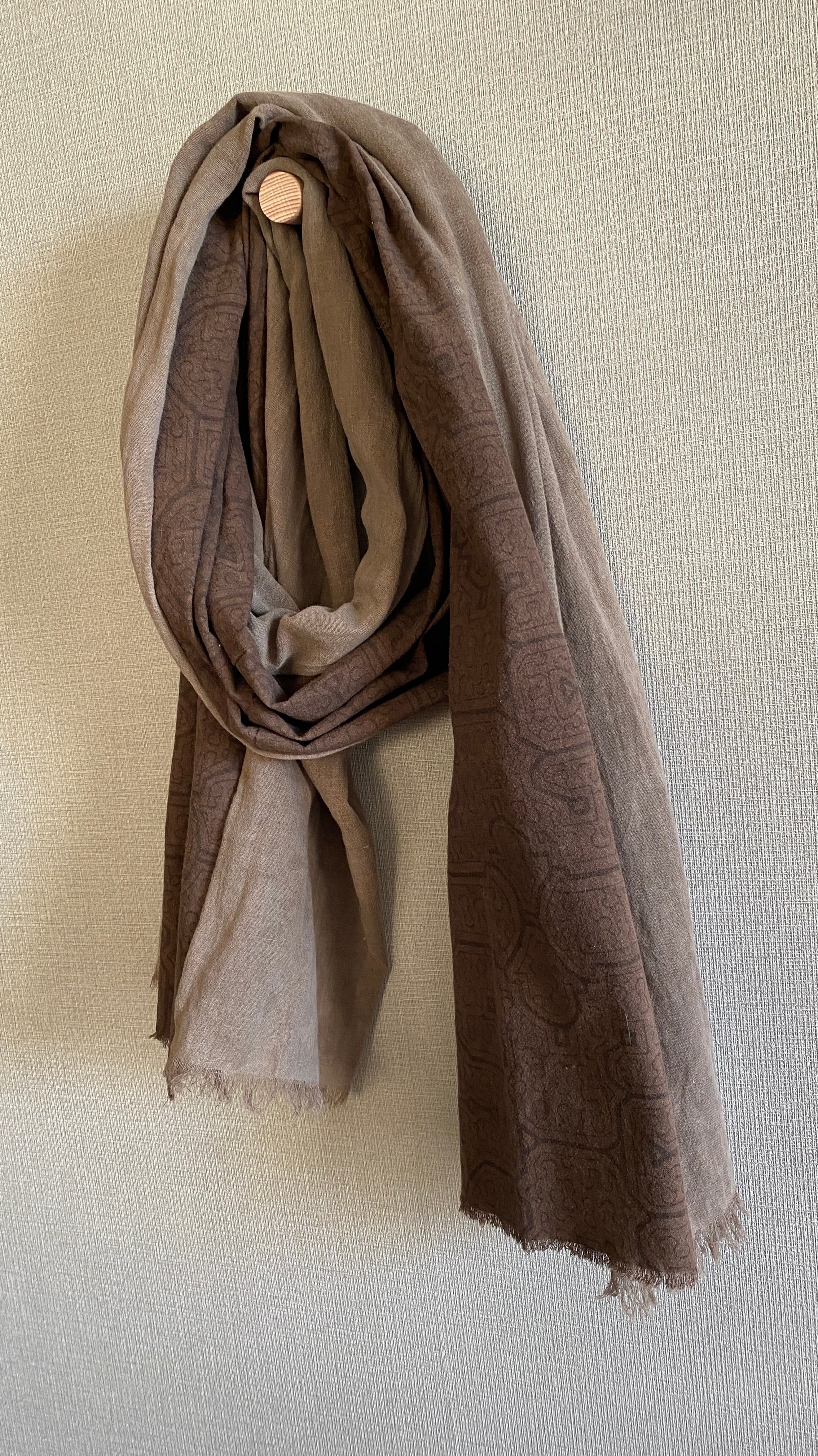 柔らかい生地だったので色味のあう泥染めのグレーと合わせてたっぷりめストールにしてみました。二度とできないストールです