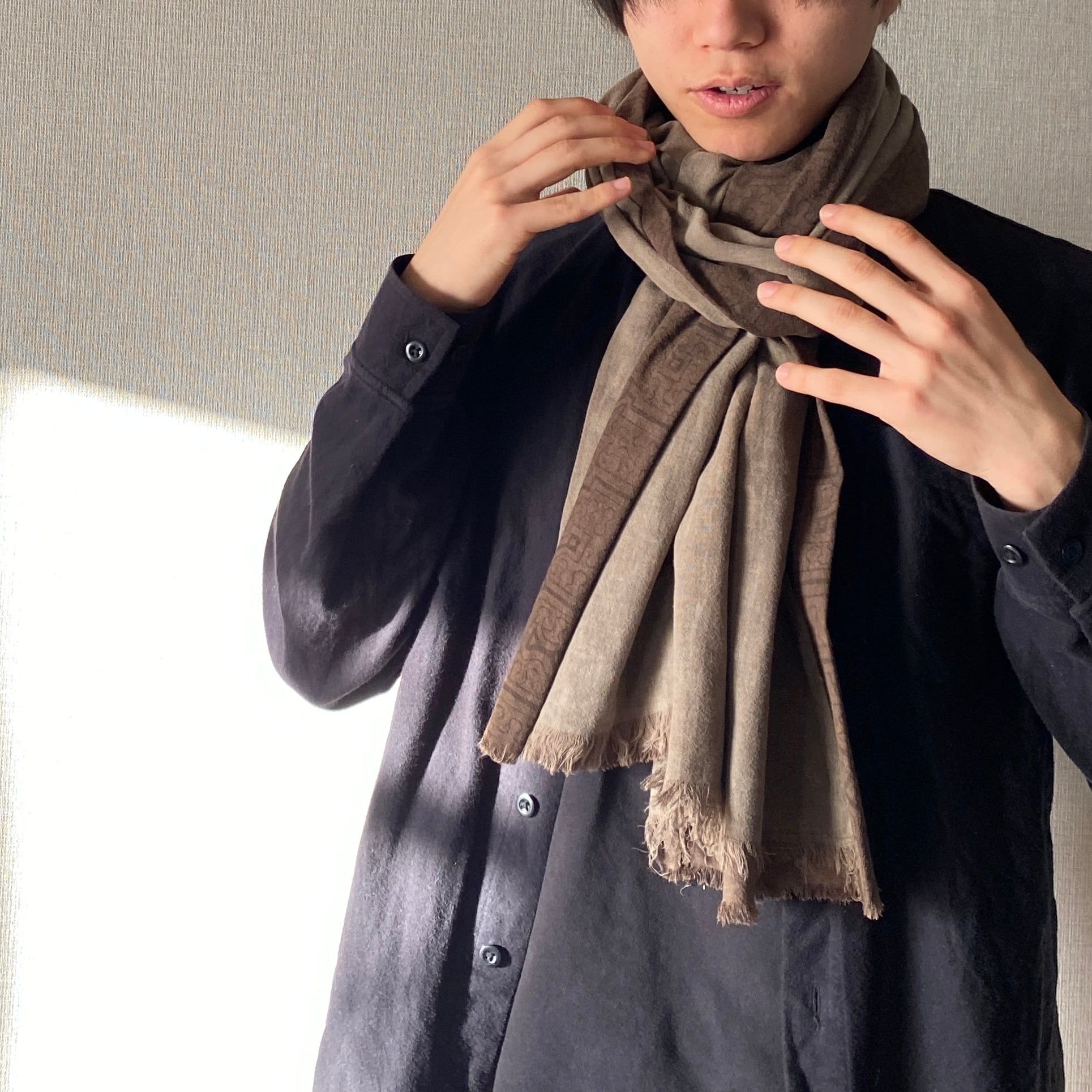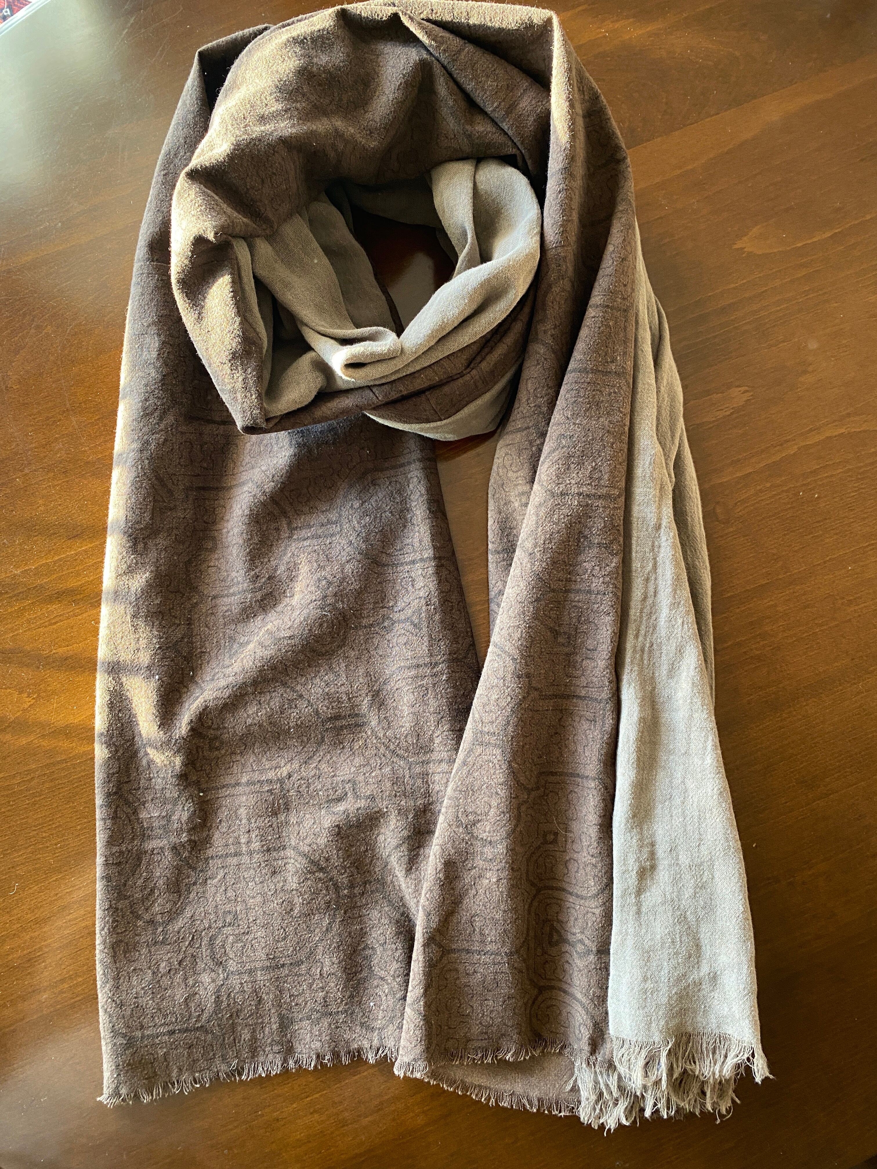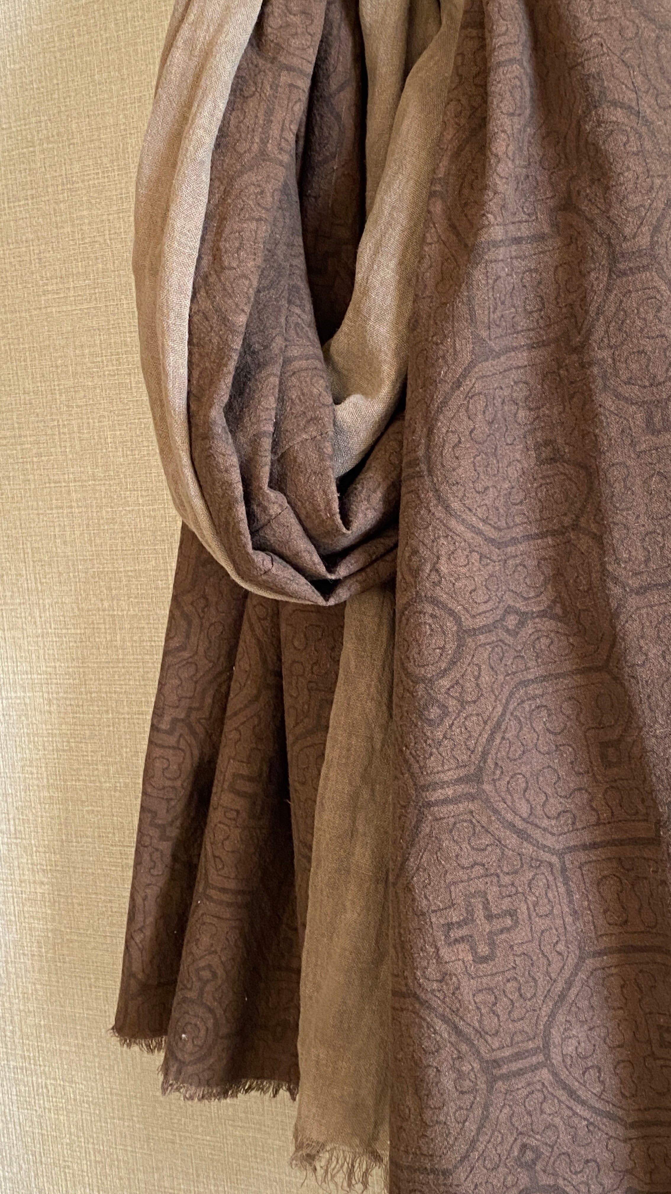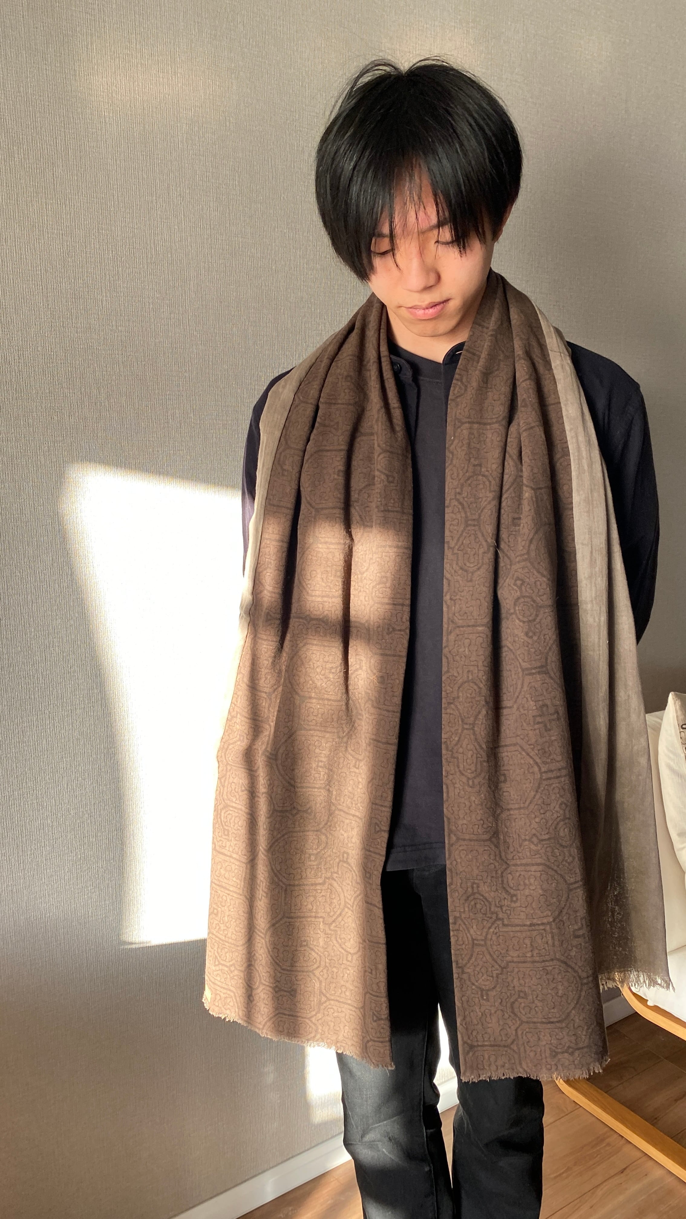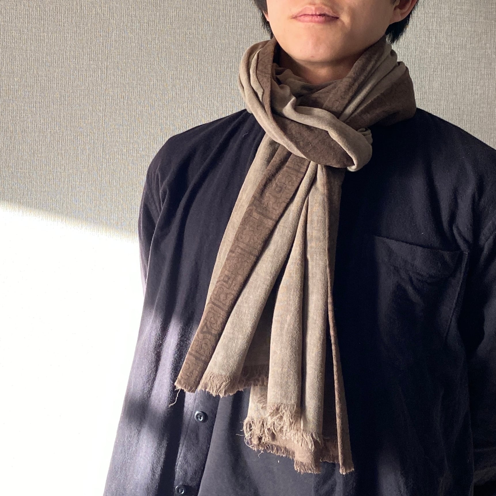 柔らかい生地だったので色味のあう泥染めのグレーと合わせてたっぷりめストールにしてみました。二度とできないストールです