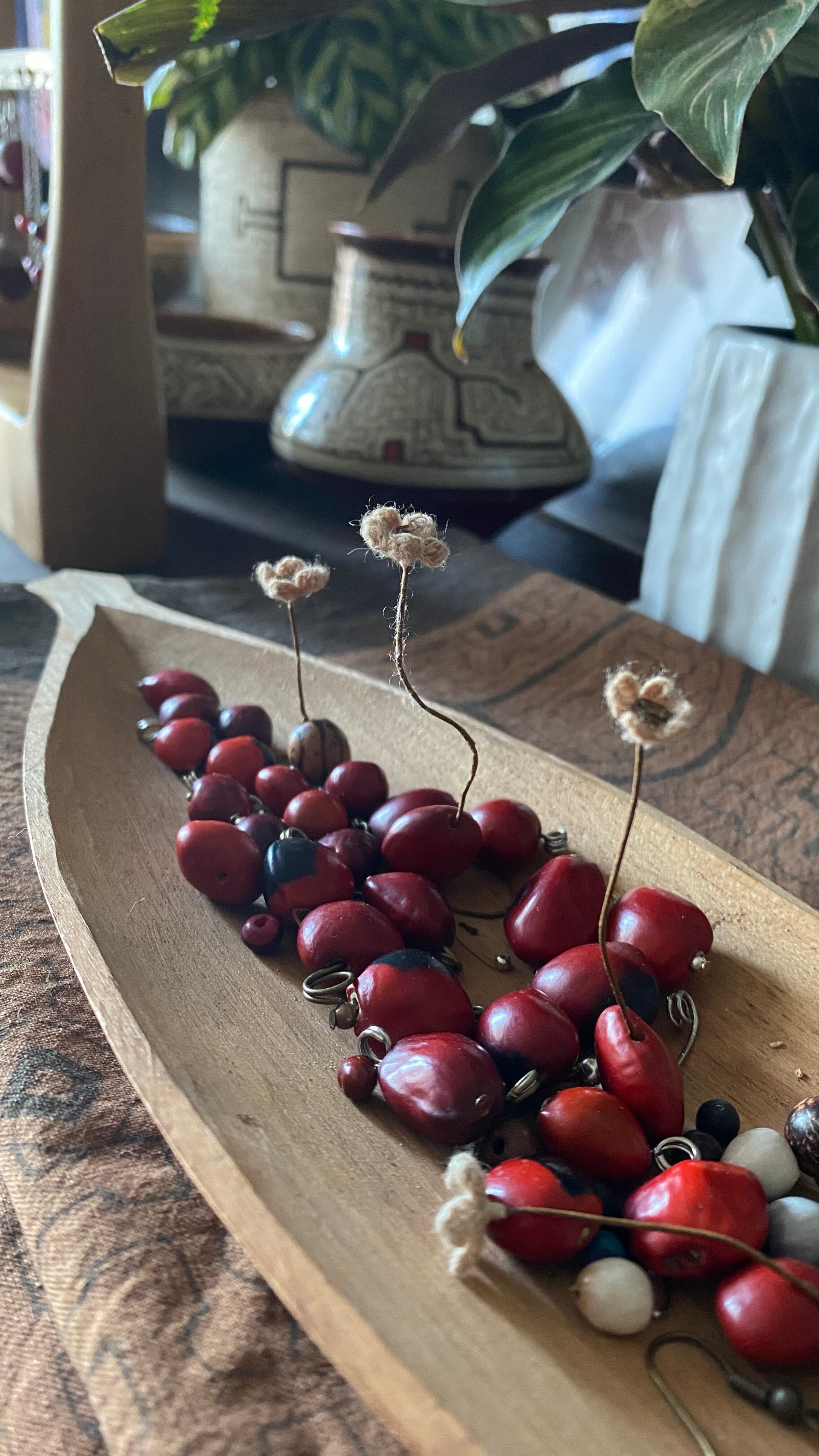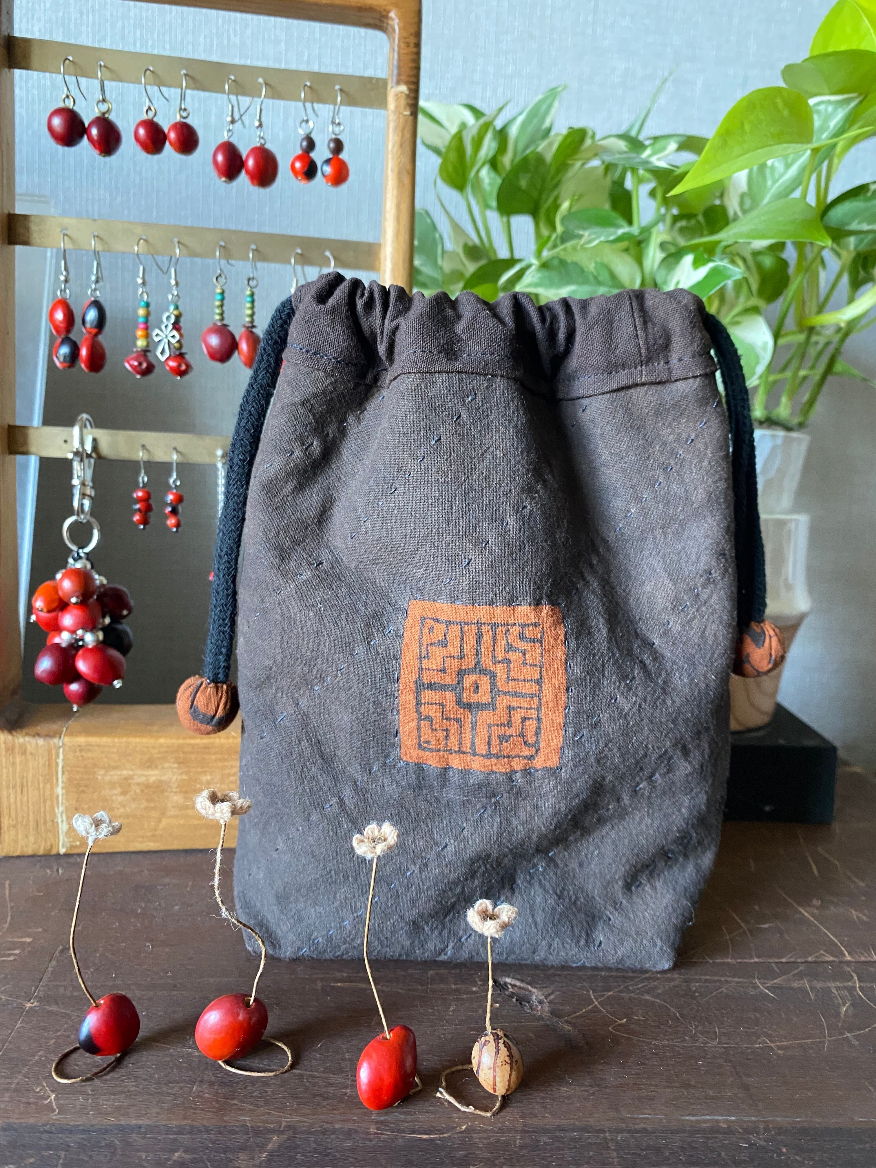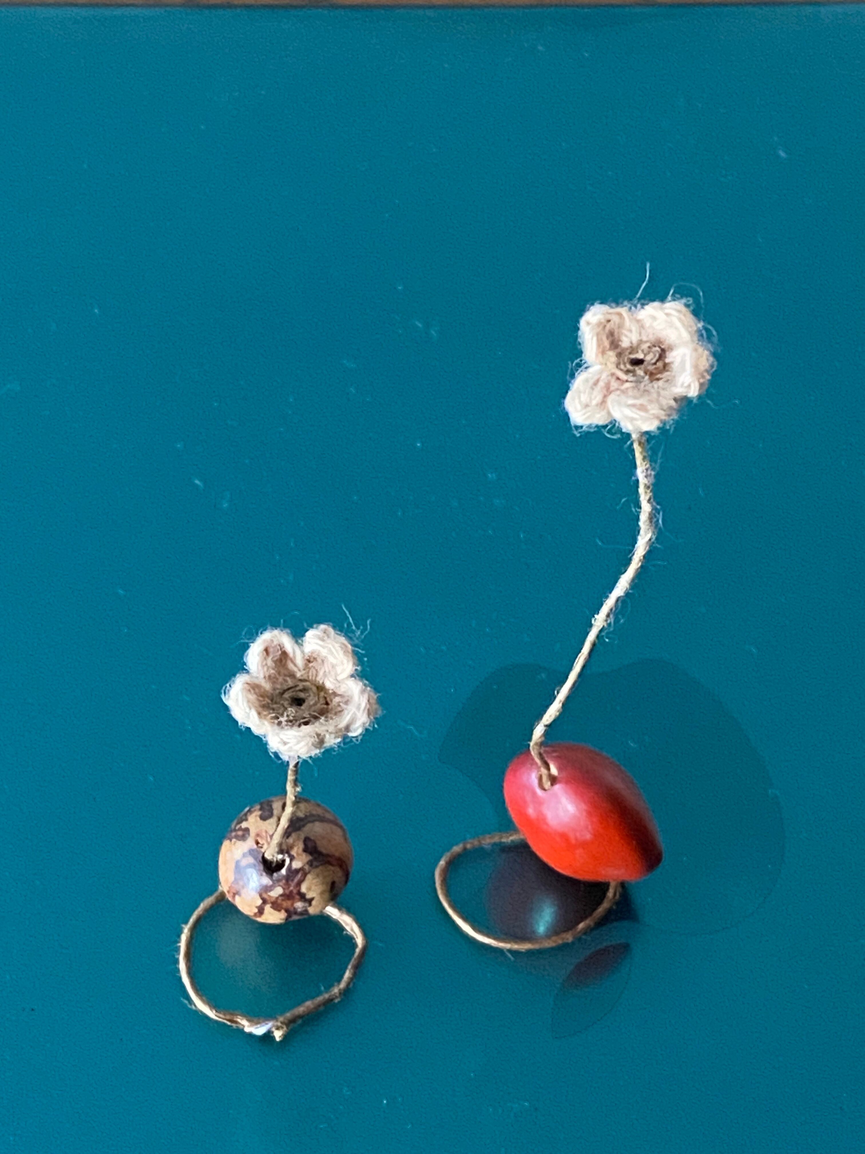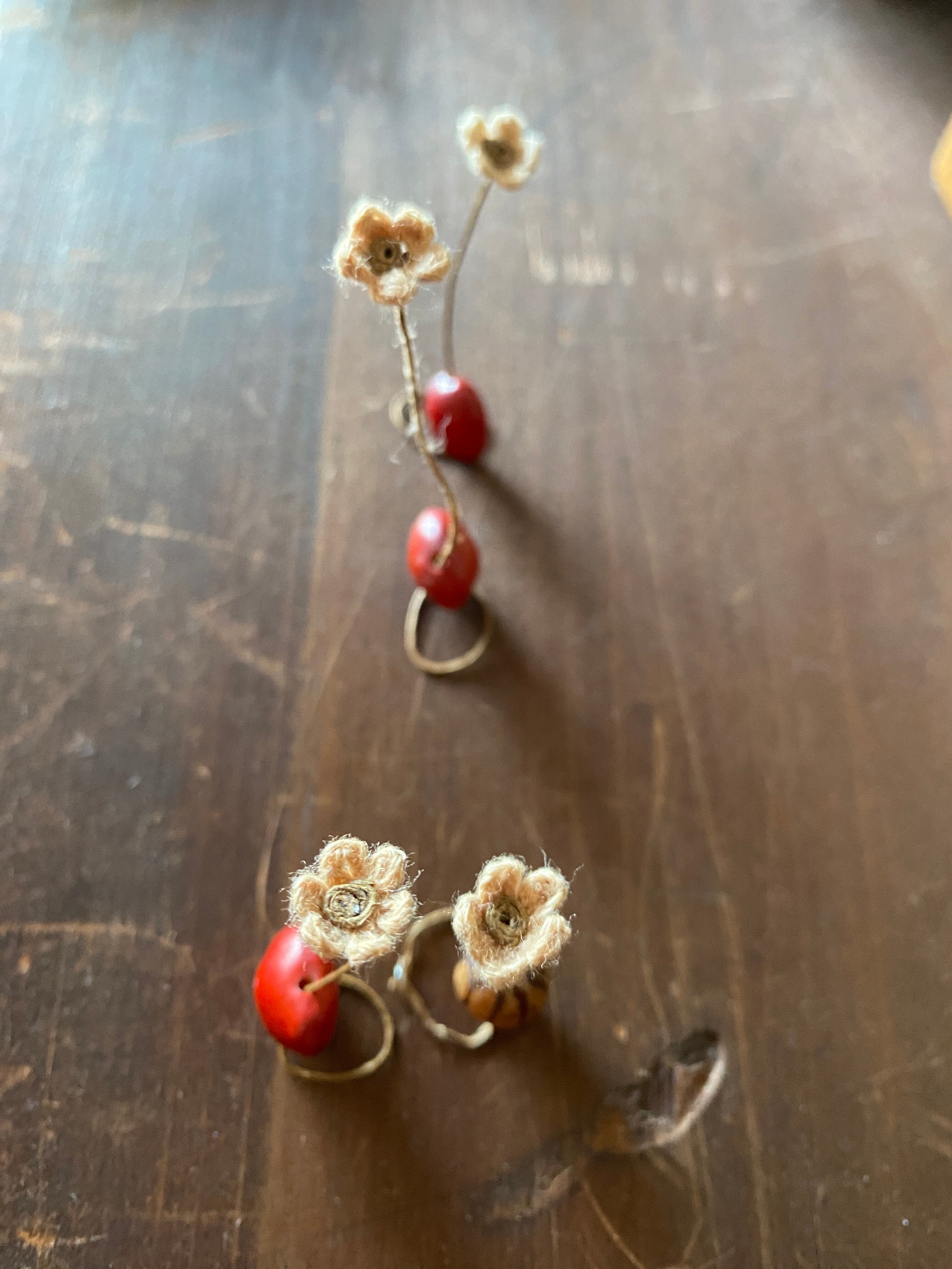 アマゾンの泥染めガーゼ、草木染めの淡い色のコットンで手編みしたちっさい小花をアマゾンの木の実と一緒に合わせて一本ずつ立ち上がるようになりました。
