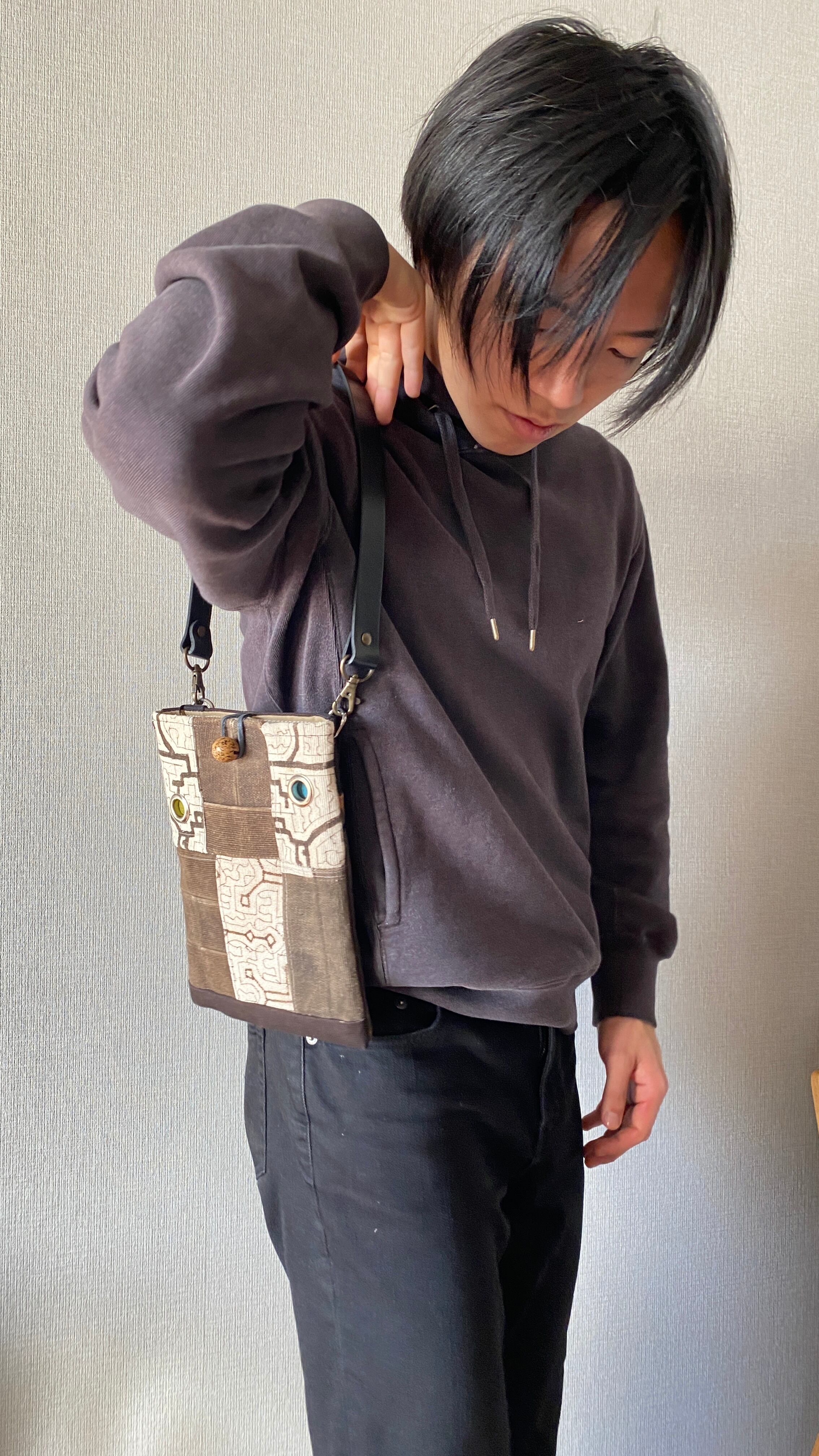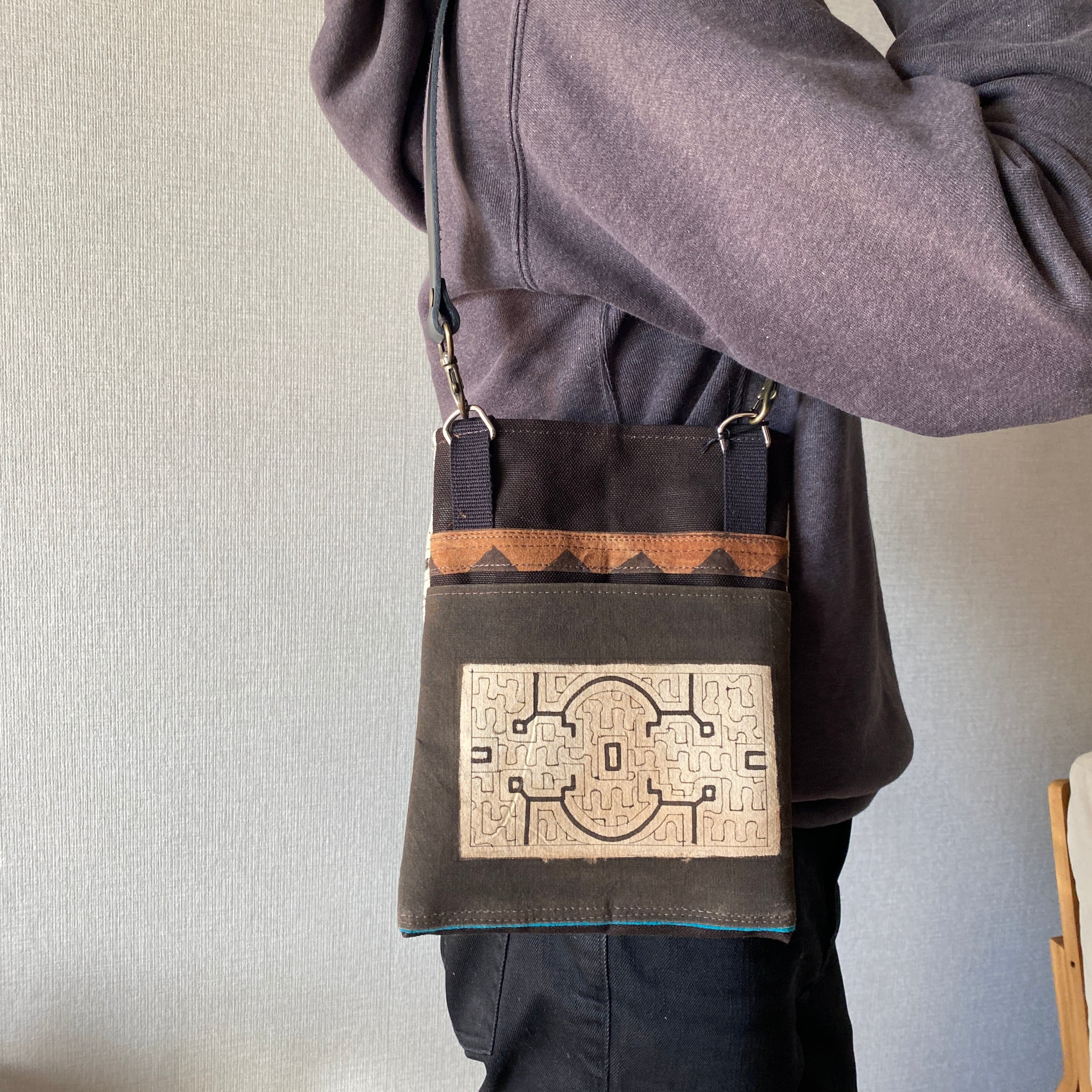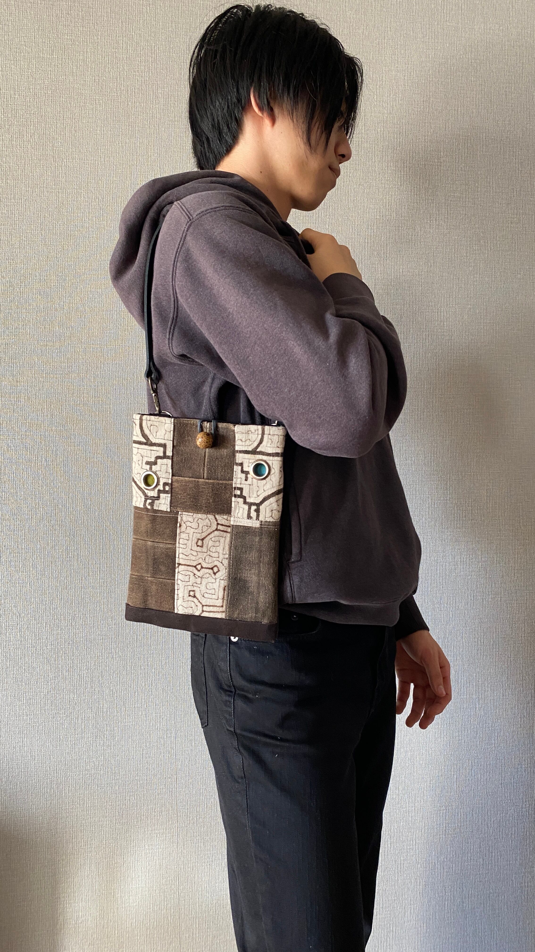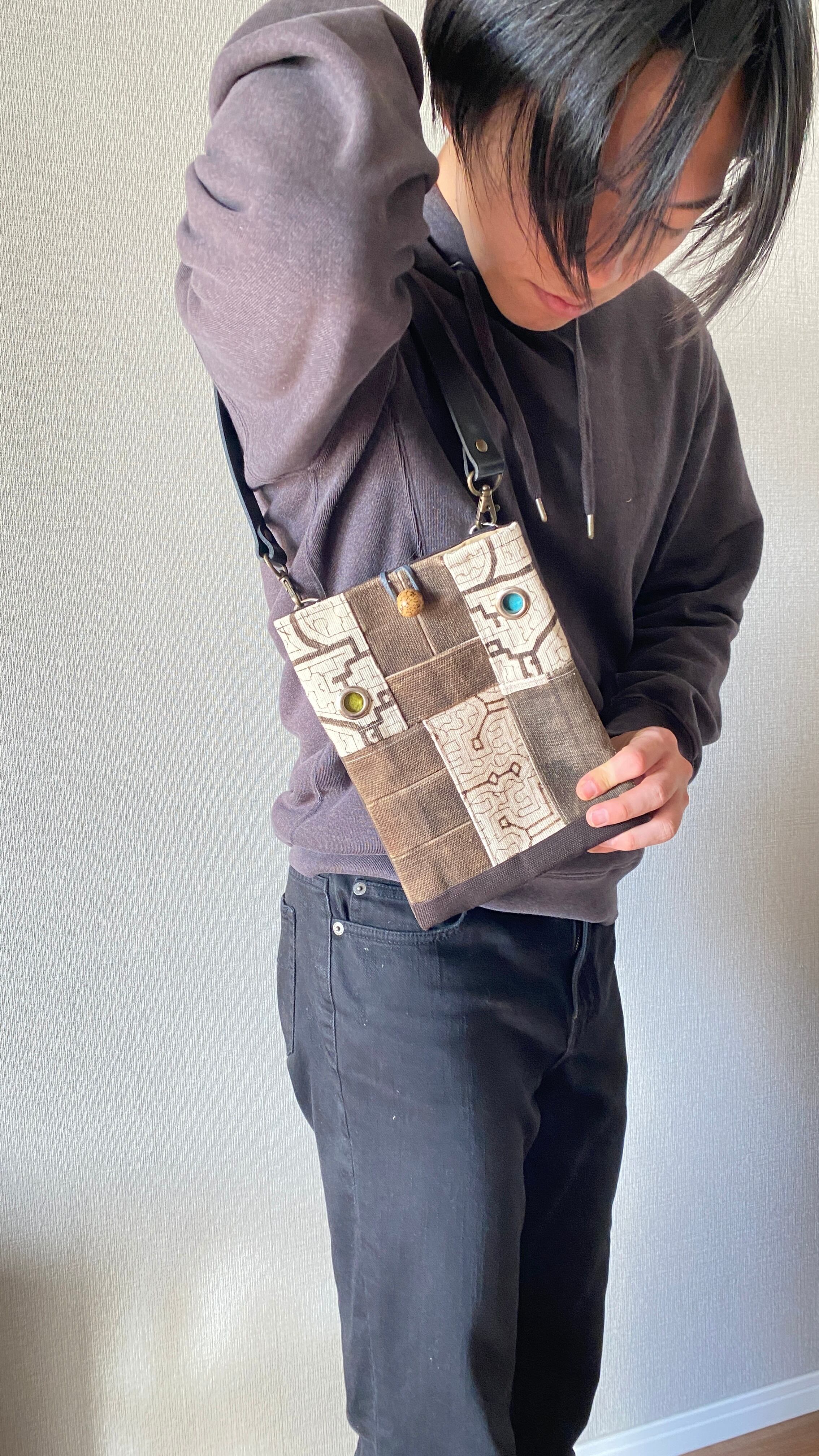 19x24cm 分厚い帆布生地に泥染めの模様を染めた素材の貴重なハギレを繋いで、分厚くてしっかりしたポーチを作りました。裏側にベルトを通すループがあり、ウエストポーチにもなります。