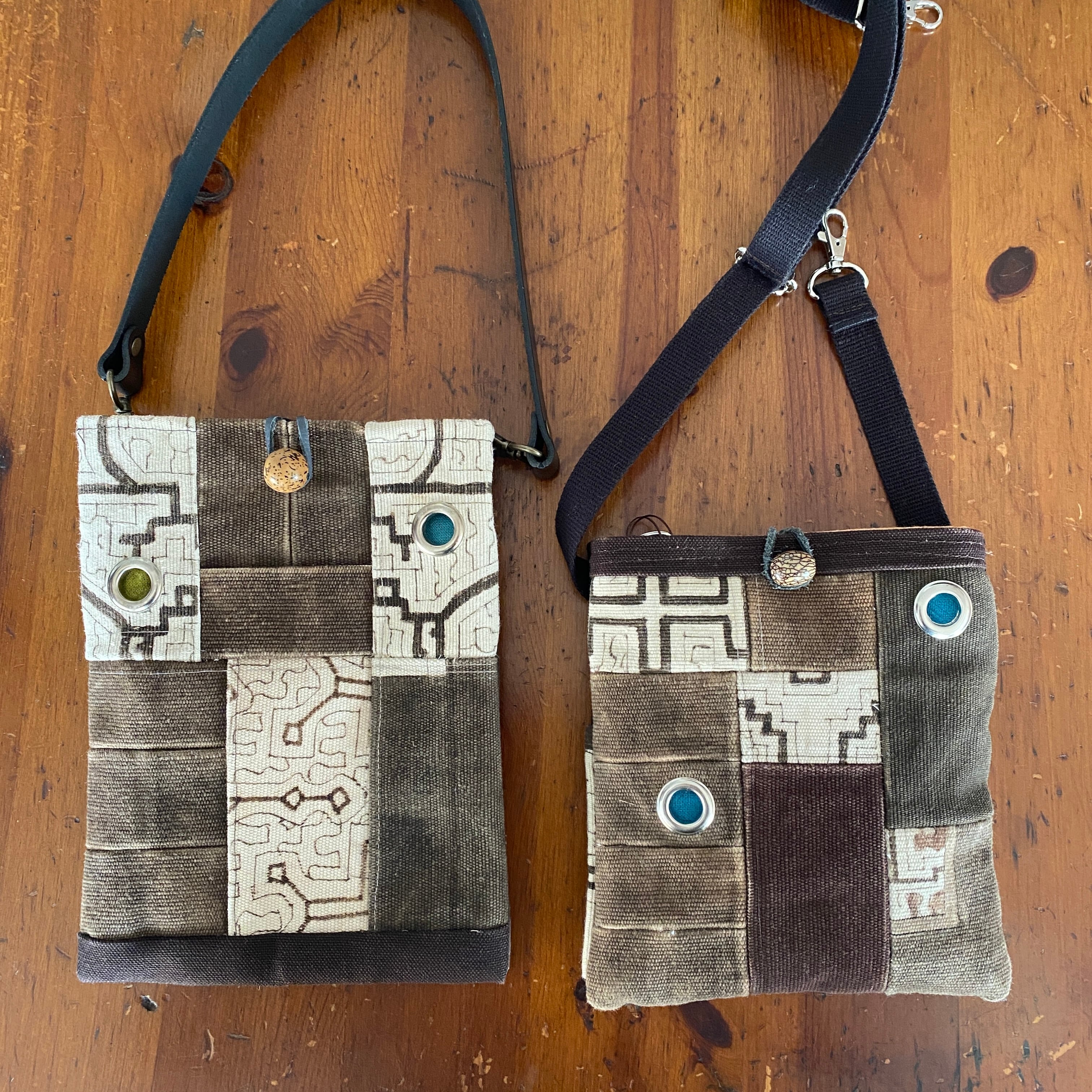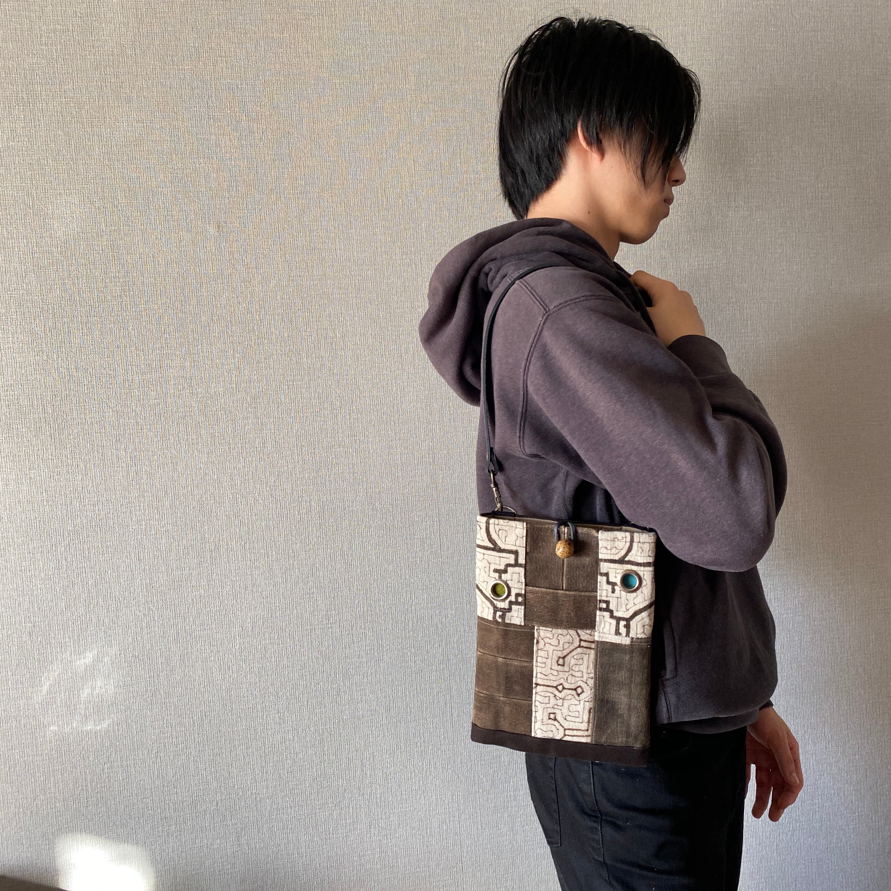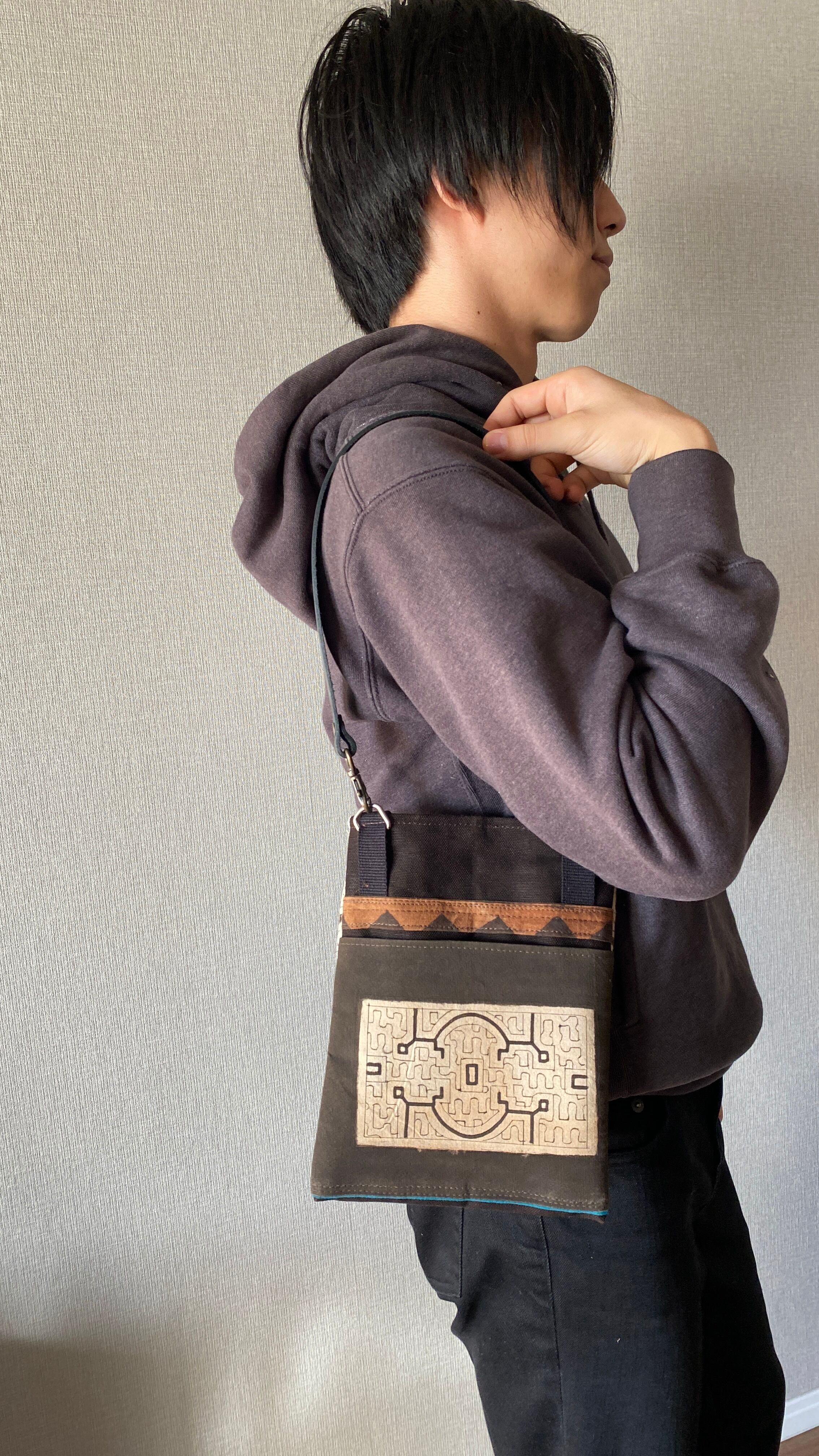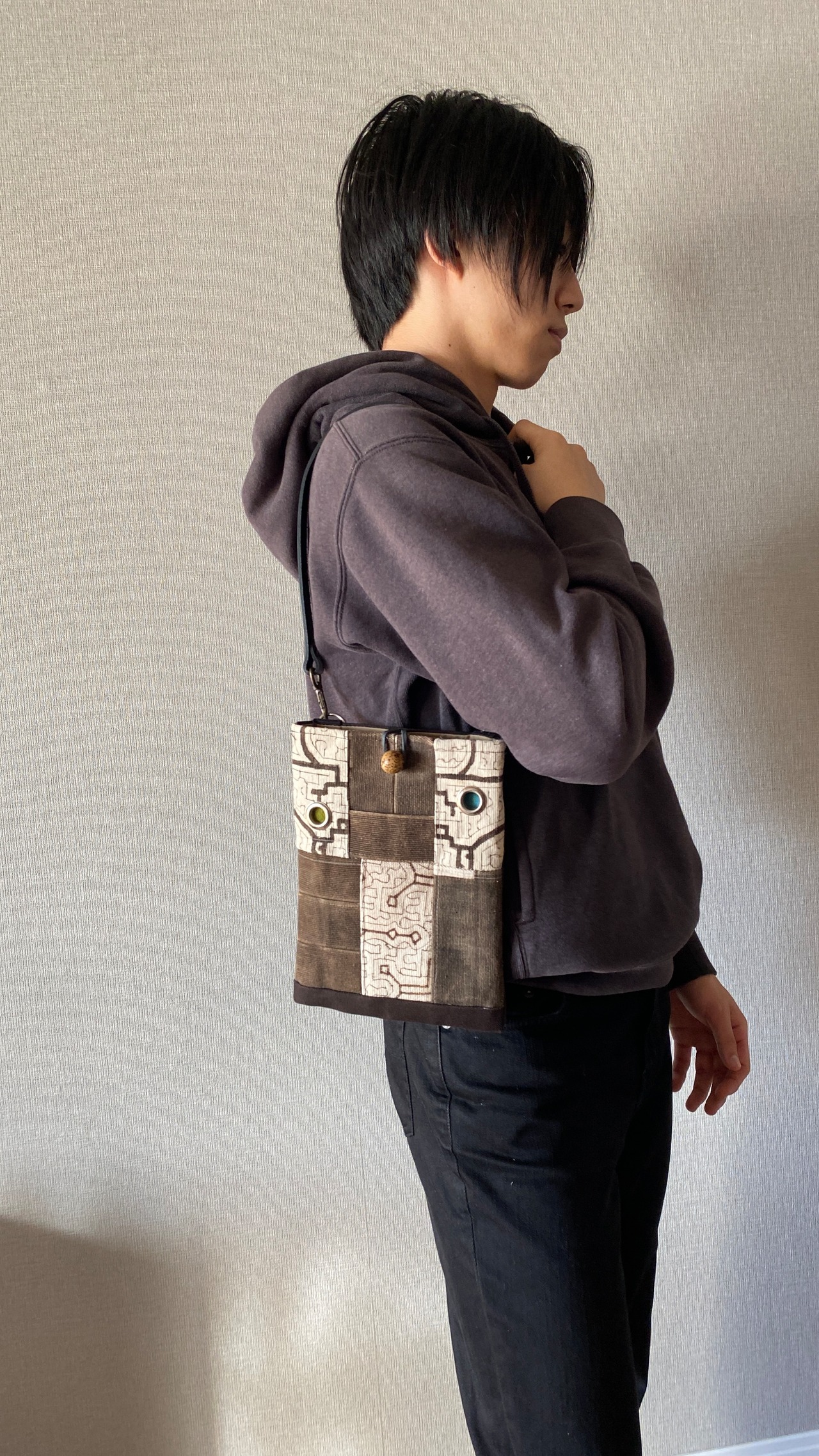 19x24cm 分厚い帆布生地に泥染めの模様を染めた素材の貴重なハギレを繋いで、分厚くてしっかりしたポーチを作りました。裏側にベルトを通すループがあり、ウエストポーチにもなります。