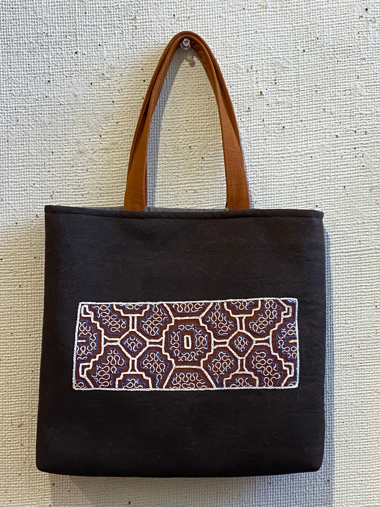 Bag 泥染め刺繍バッグ 白と青の刺繍と裏は隠れ模様 茶色の持ち手