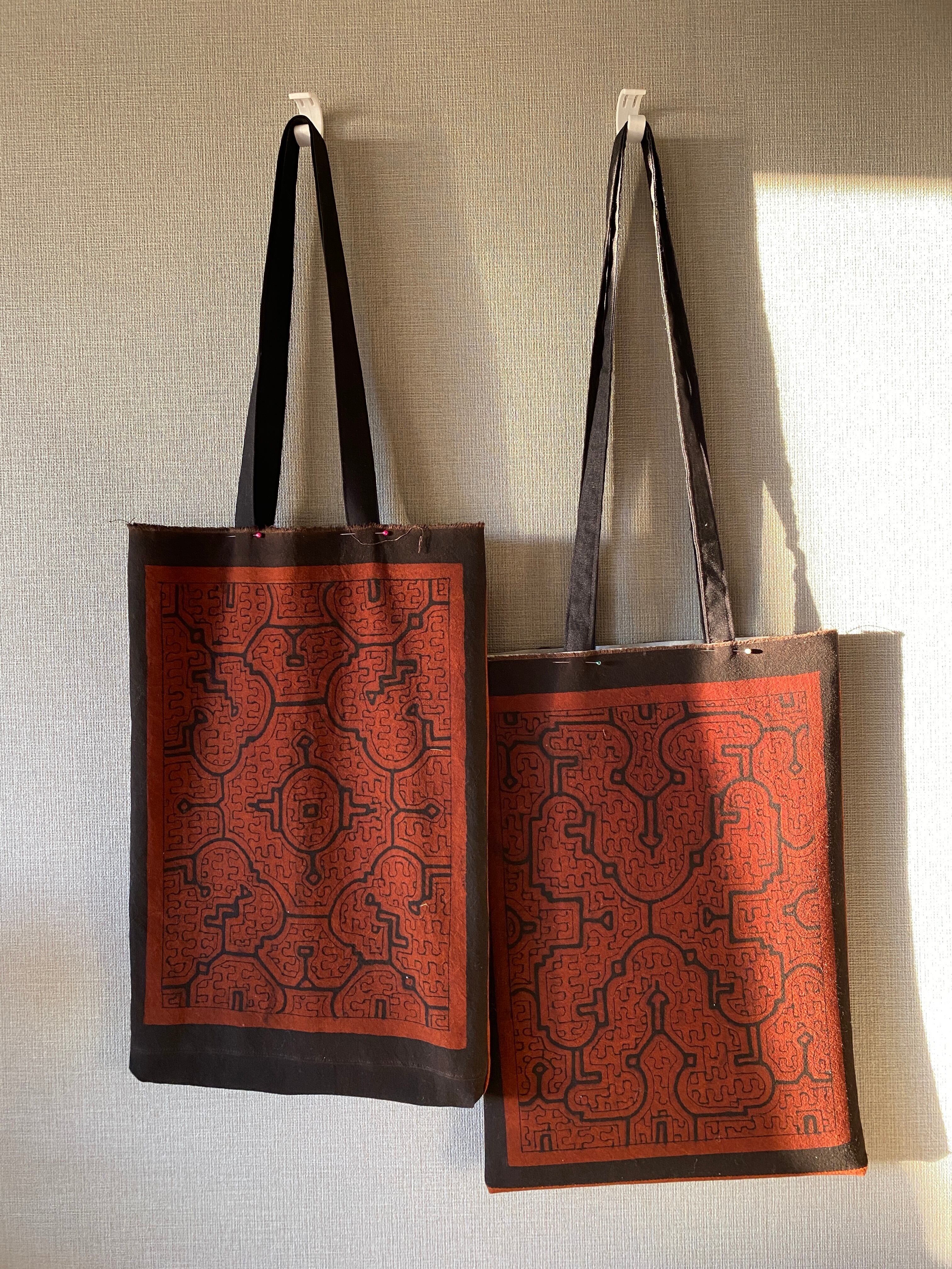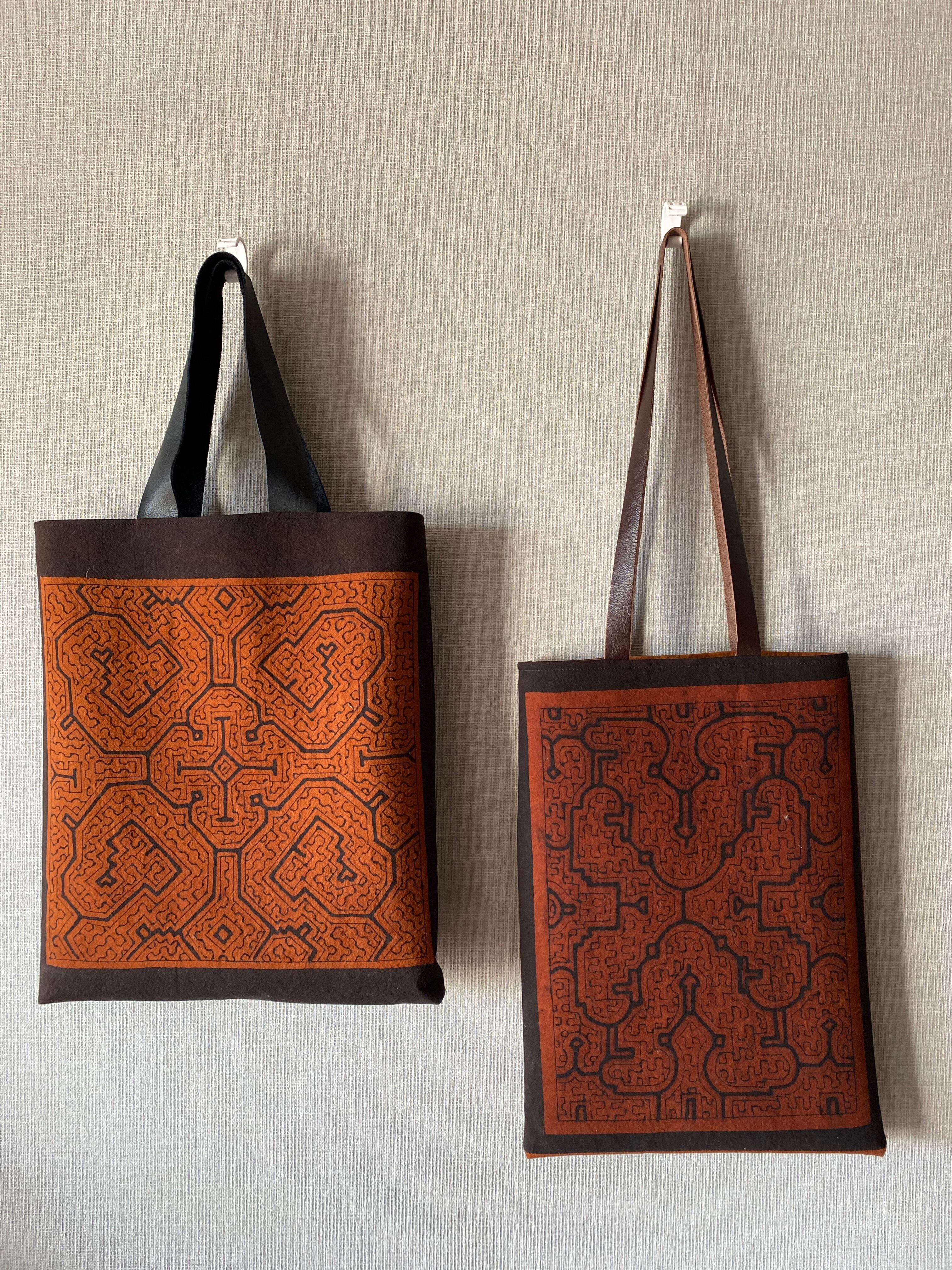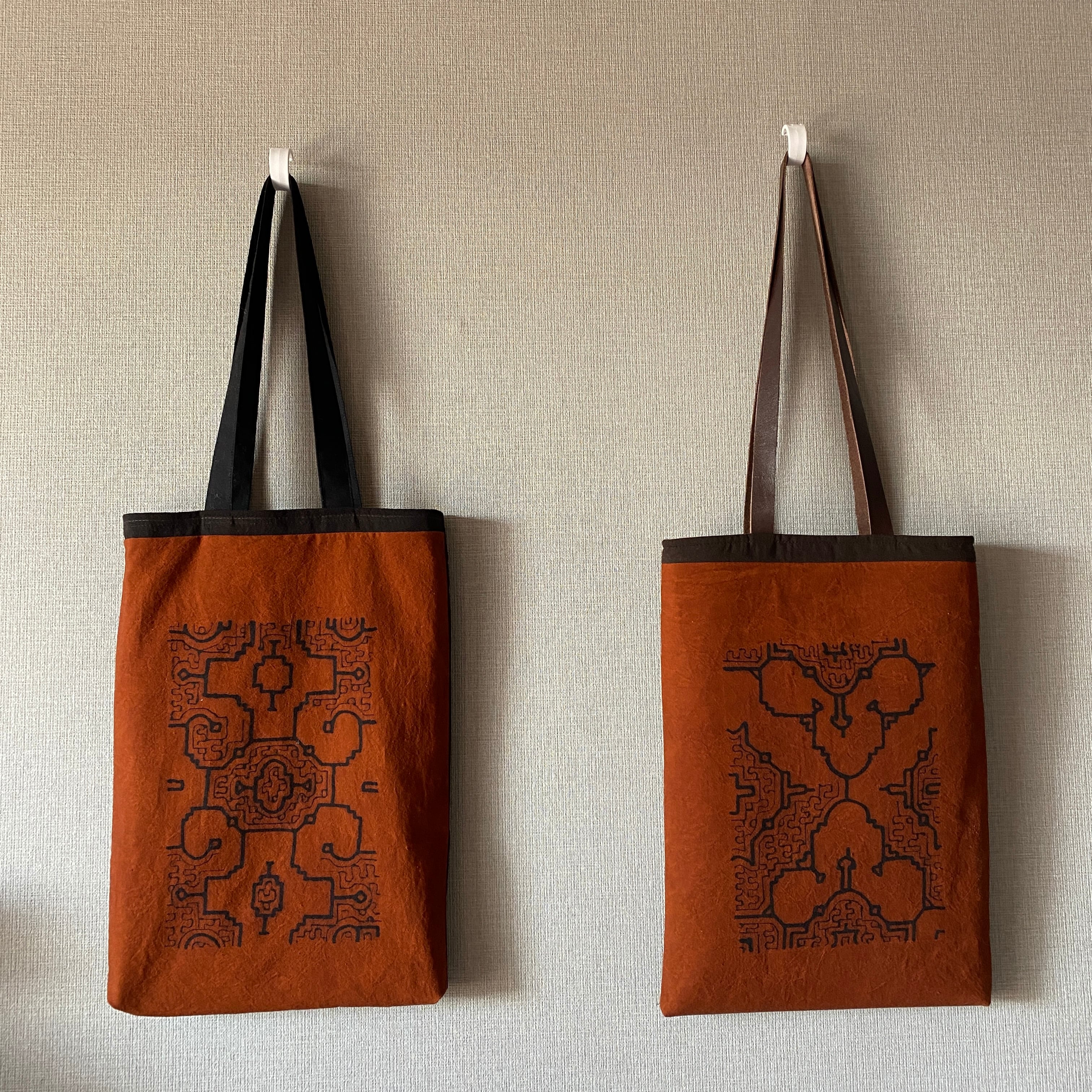 片面はクッションサイズを利用した模様を反対側に合わせて一回り大きくしたバッグ。
