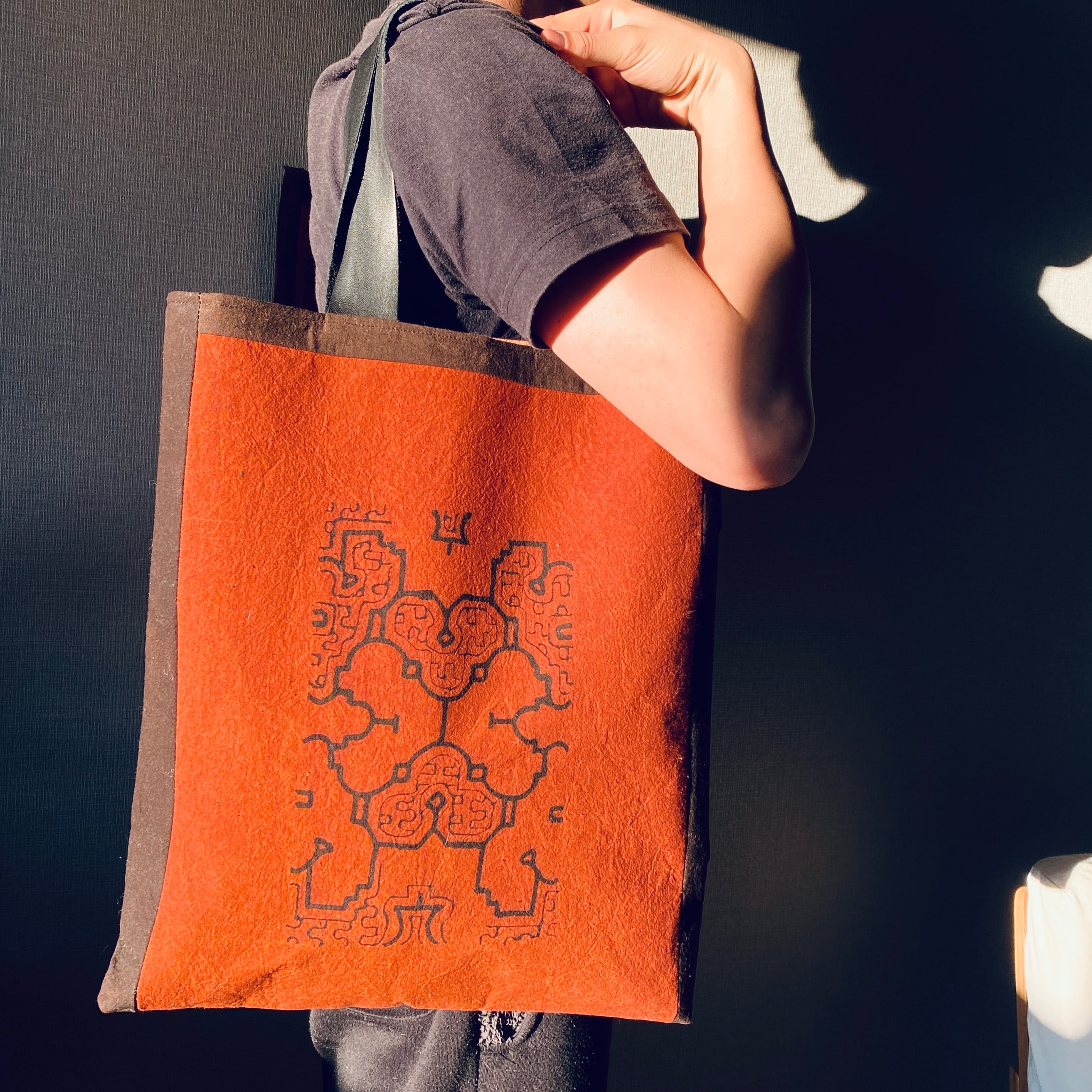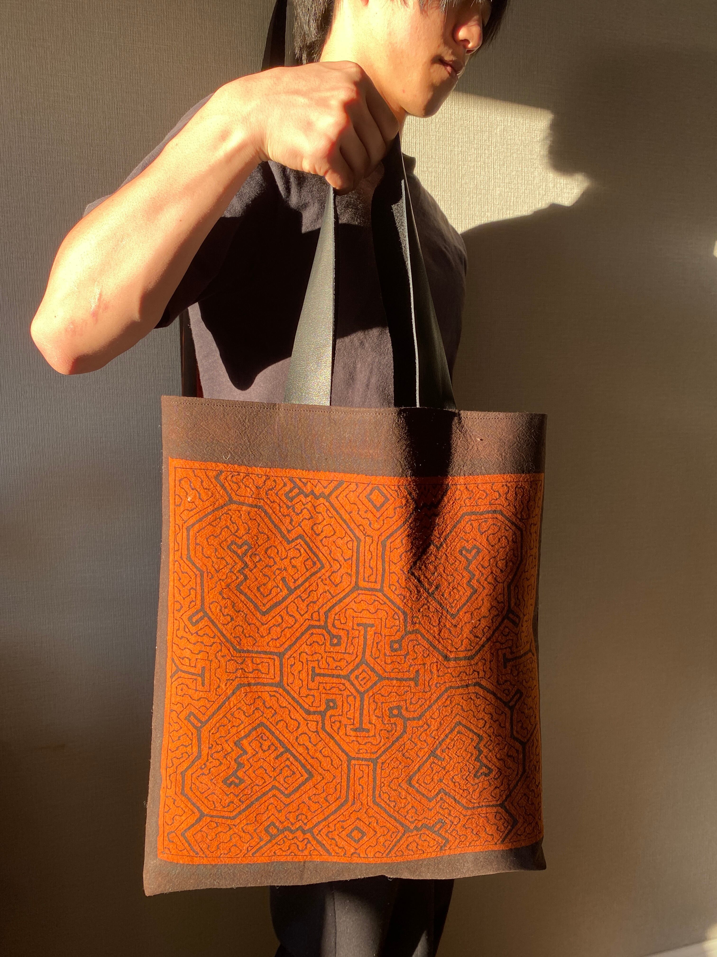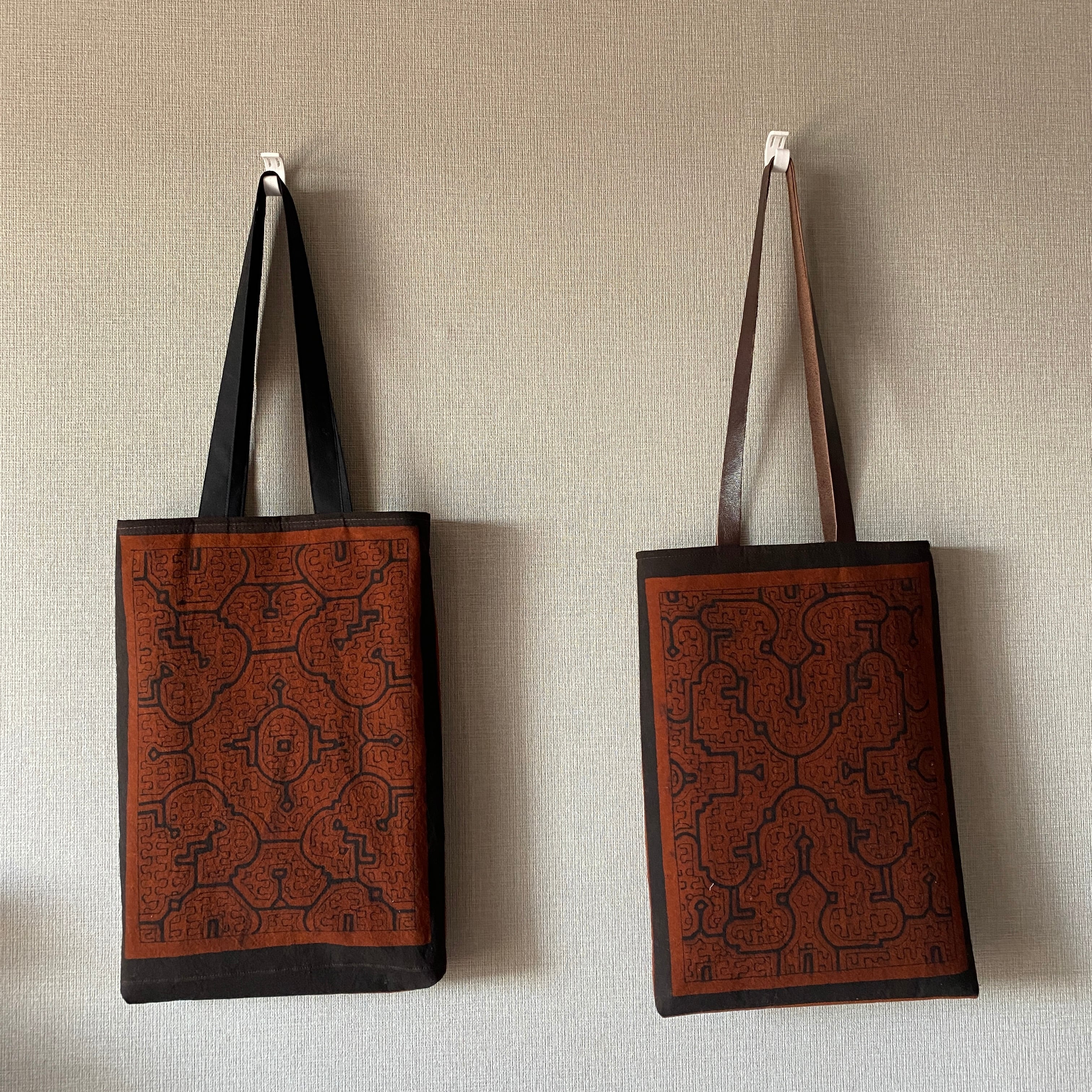 片面はクッションサイズを利用した模様を反対側に合わせて一回り大きくしたバッグ。