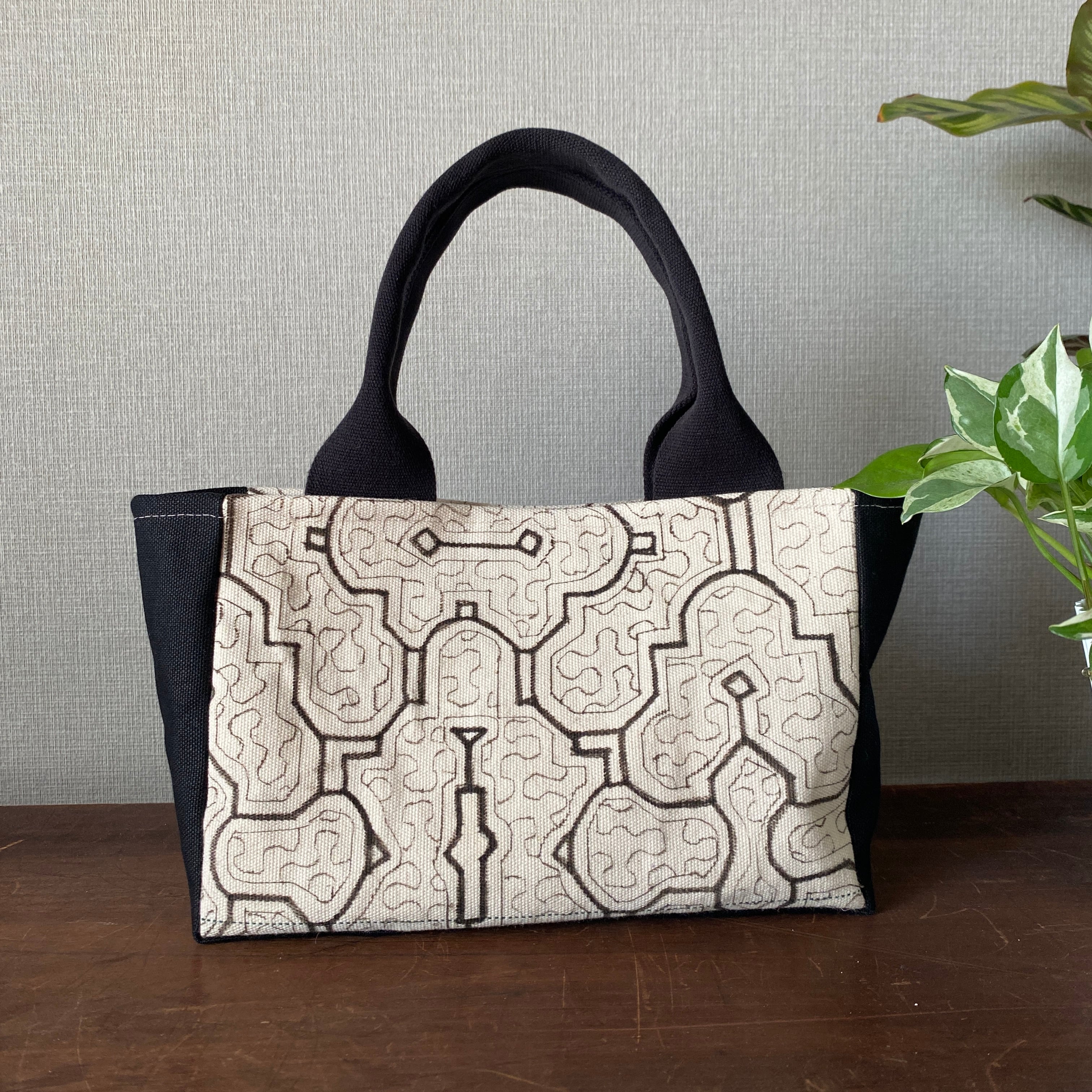 手描き模様を帆布に染めた特別な素材です。黒のマチ部分はとても硬い帆布生地で、アマゾン屋のバッグでは作り自体が新しい小型バッグです。