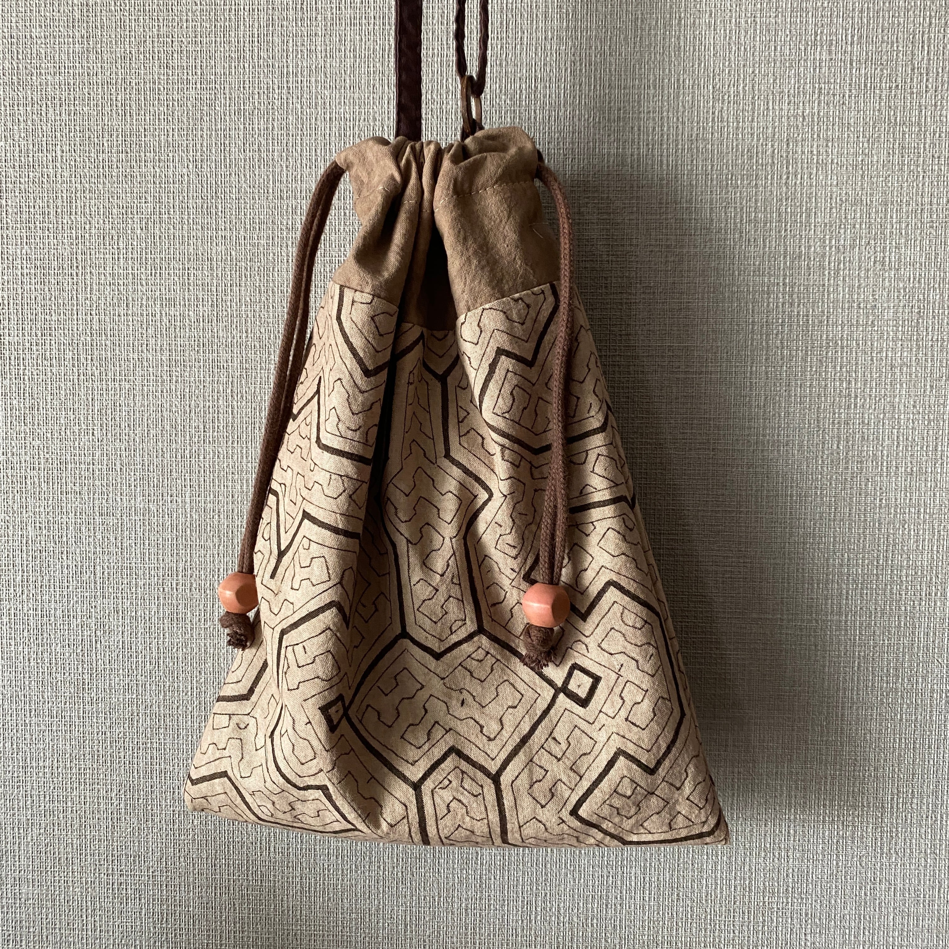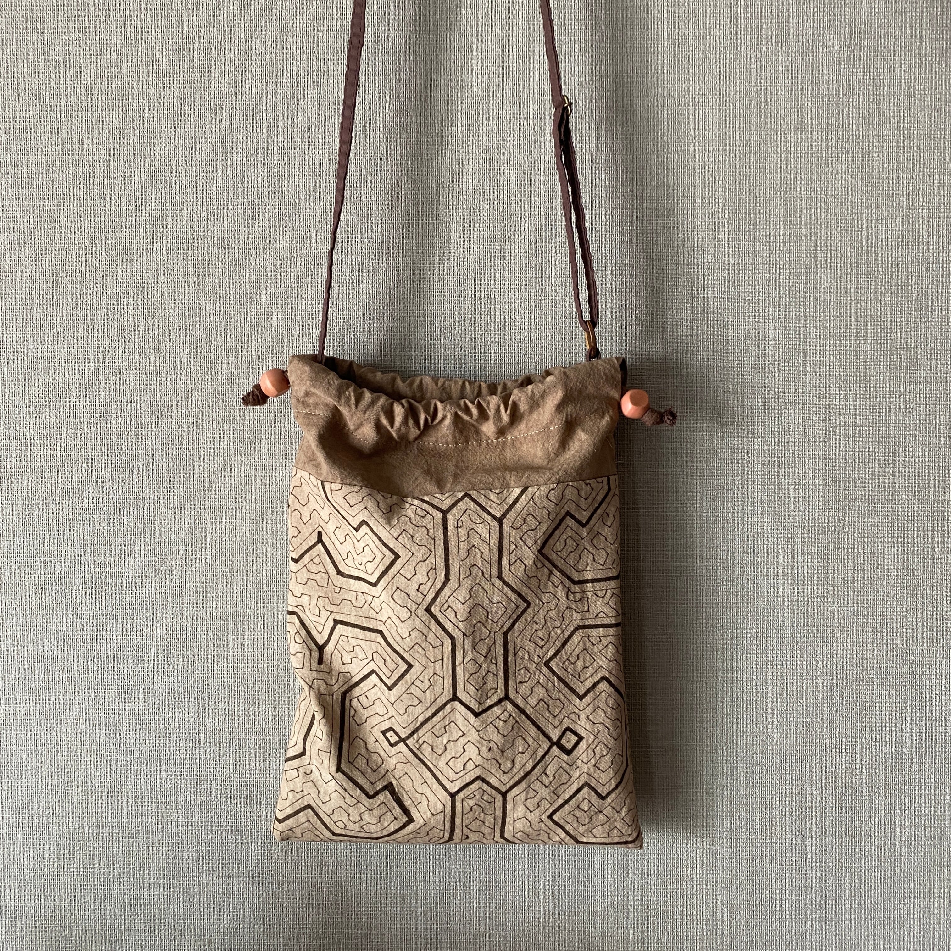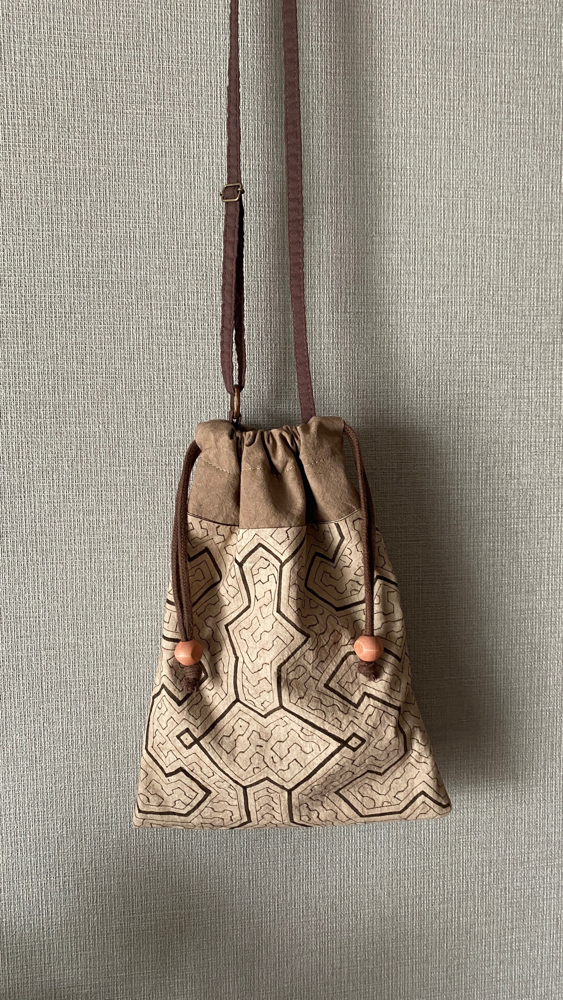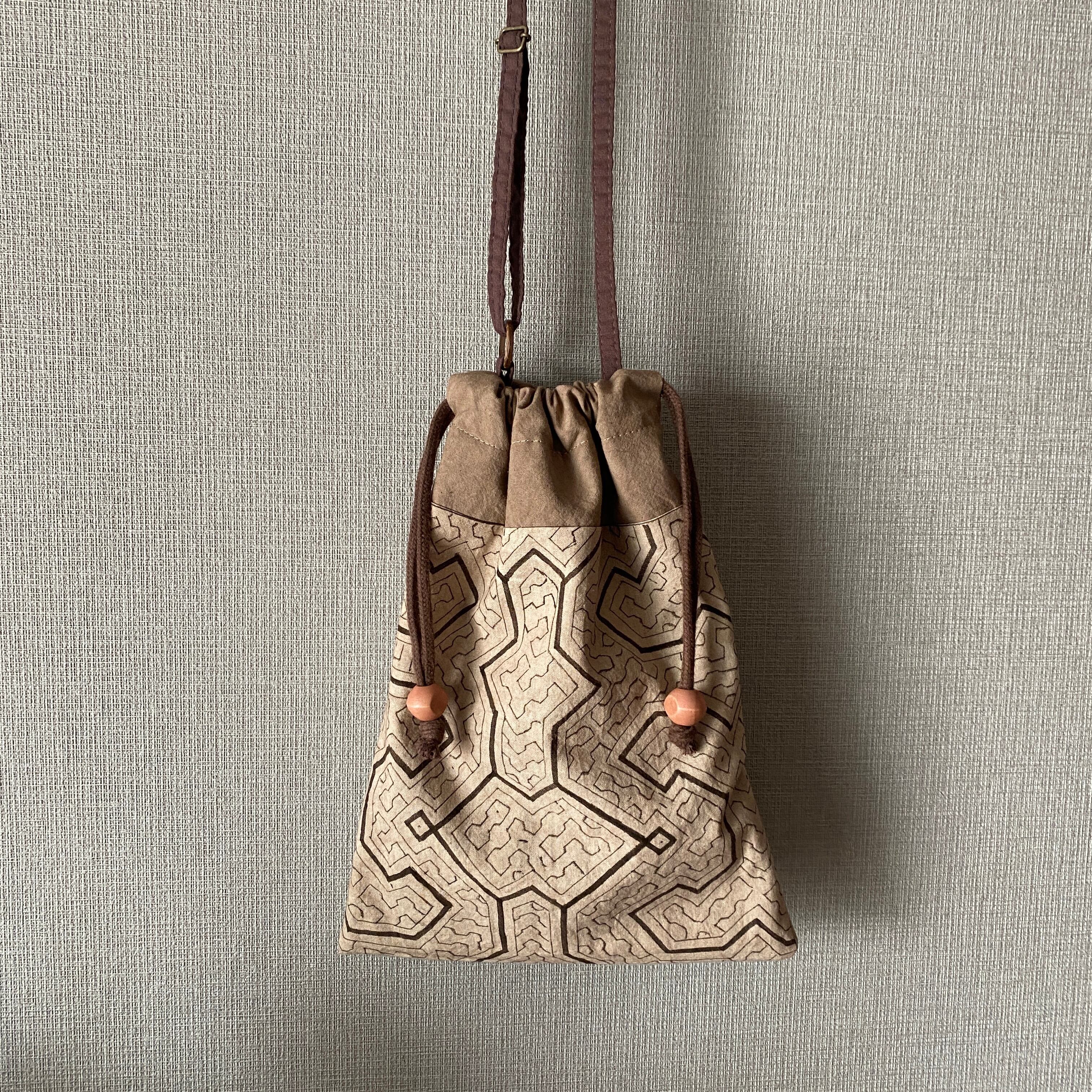 泥染め紫の巾着ポシェットショルダー 22x29cm シピボ族の泥染め