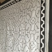周囲の飾り枠が半円のピンポンボールのような繰り返しですが、おそらくアナコンダというアマゾンに生息する巨大な蛇の模様をモチーフにした新鮮なデザインでしょう。蛇はアマゾン河の支流が蛇行する様子によく似ていて、またそれゆえにアマゾンの大河を時に厳しく、時に優しく見守る「母なる神」として考えられているため、また、アヤワスカの儀礼の際に現れるビジョンとしても出てくためか、よく泥染め布の模様のモチーフになっています。