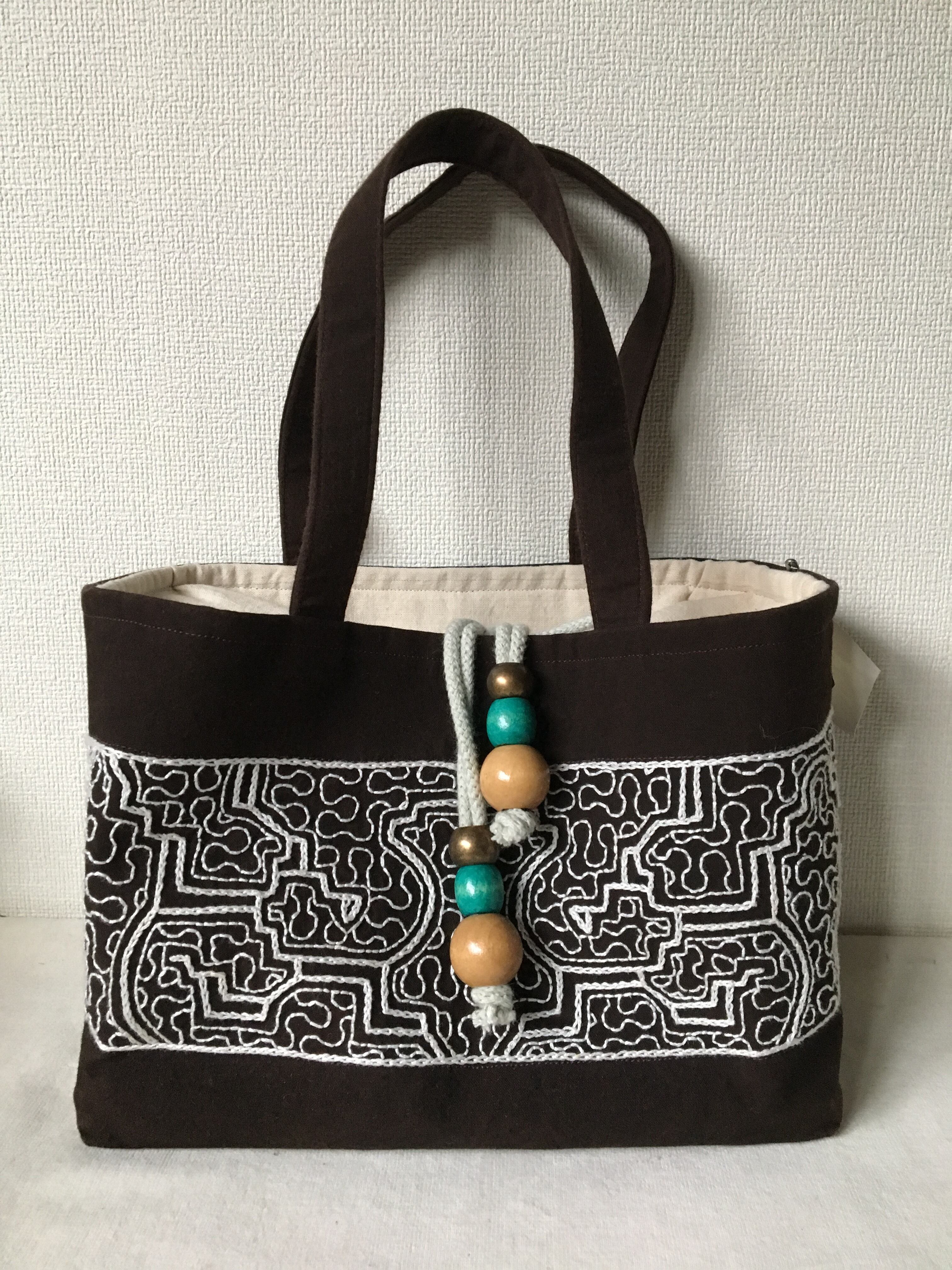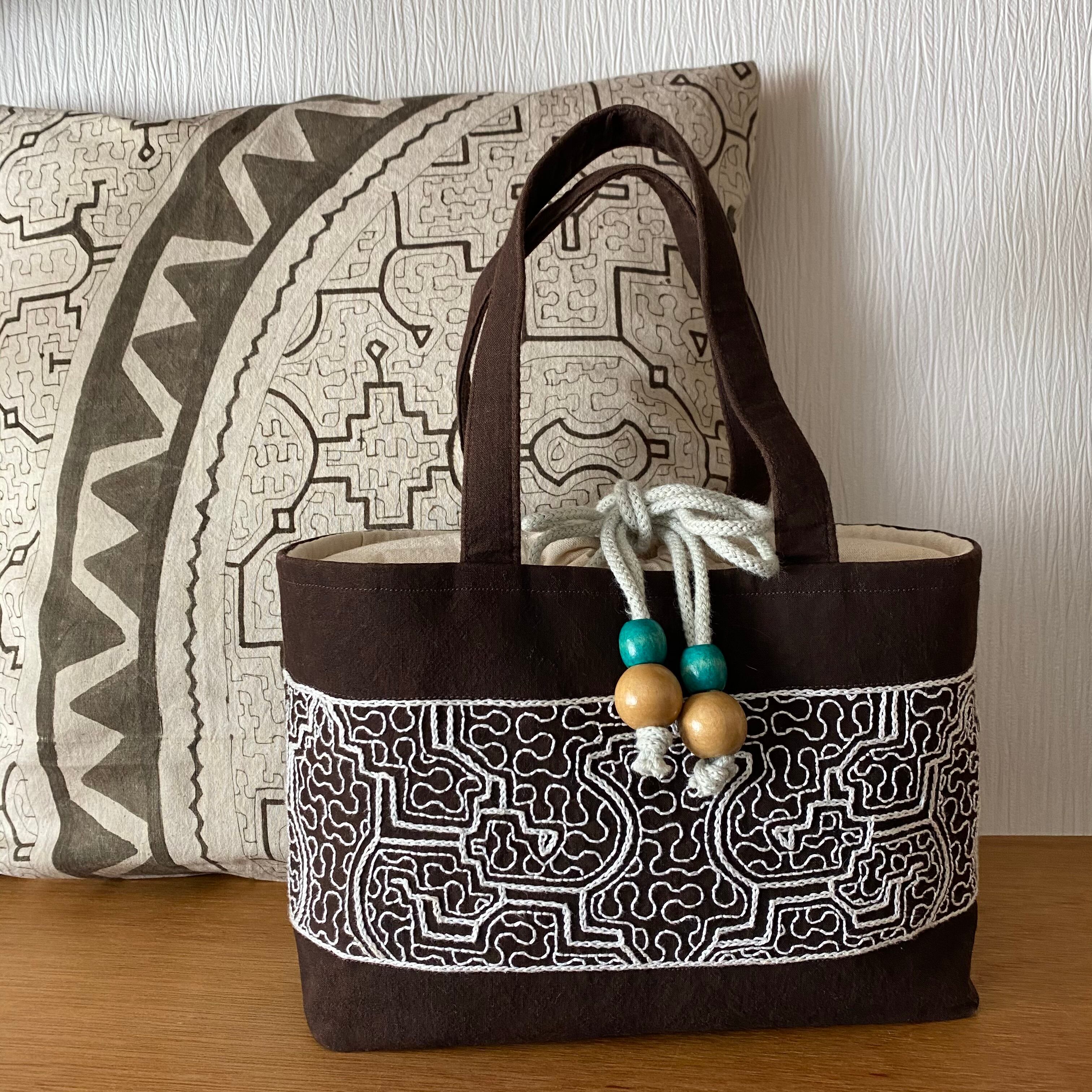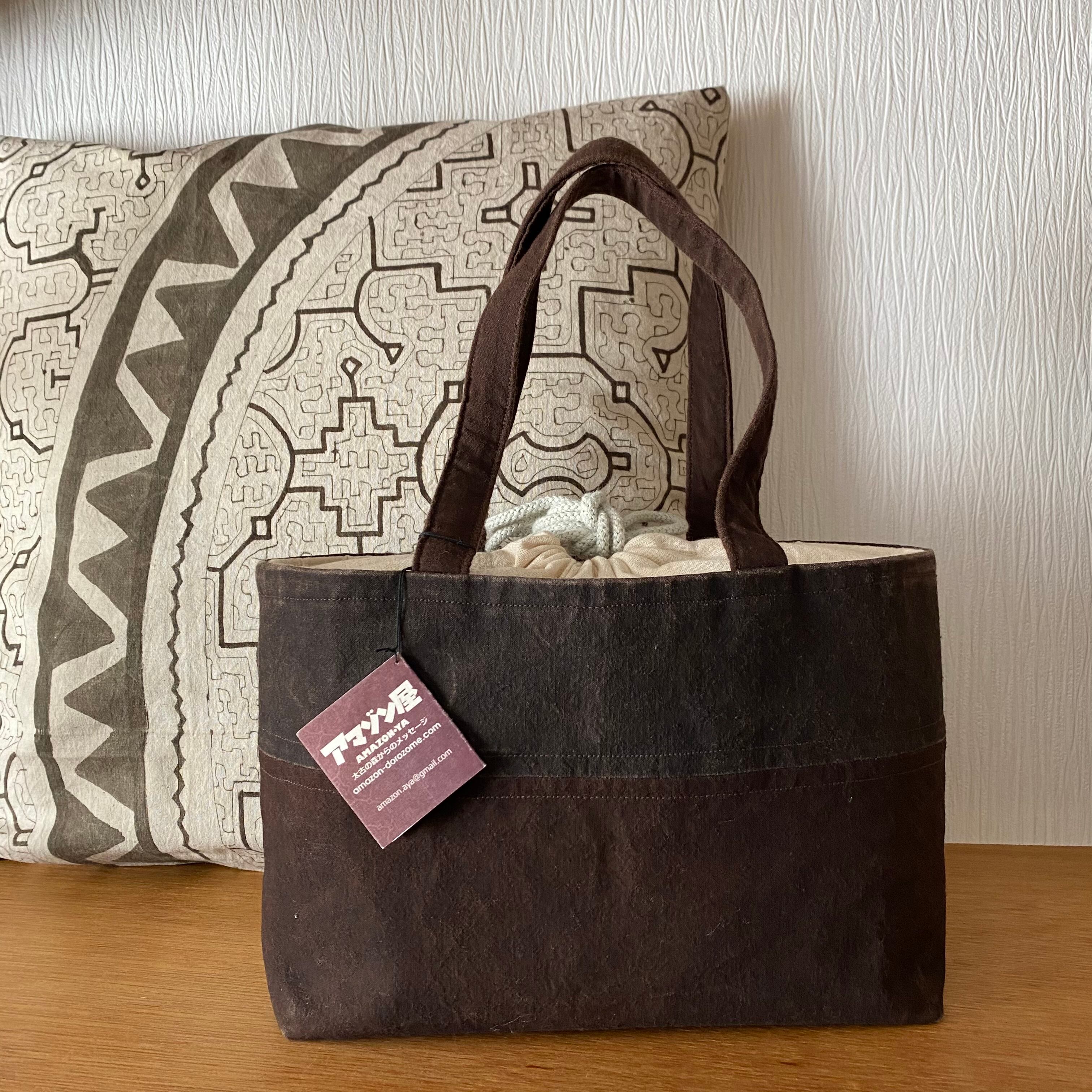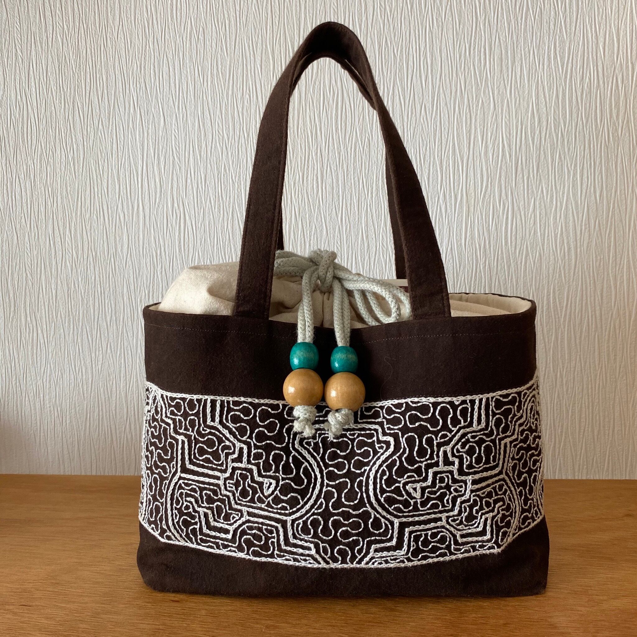 泥染めバッグ 厚底白刺繍巾着ふた アマゾン・シピボ族の刺繍