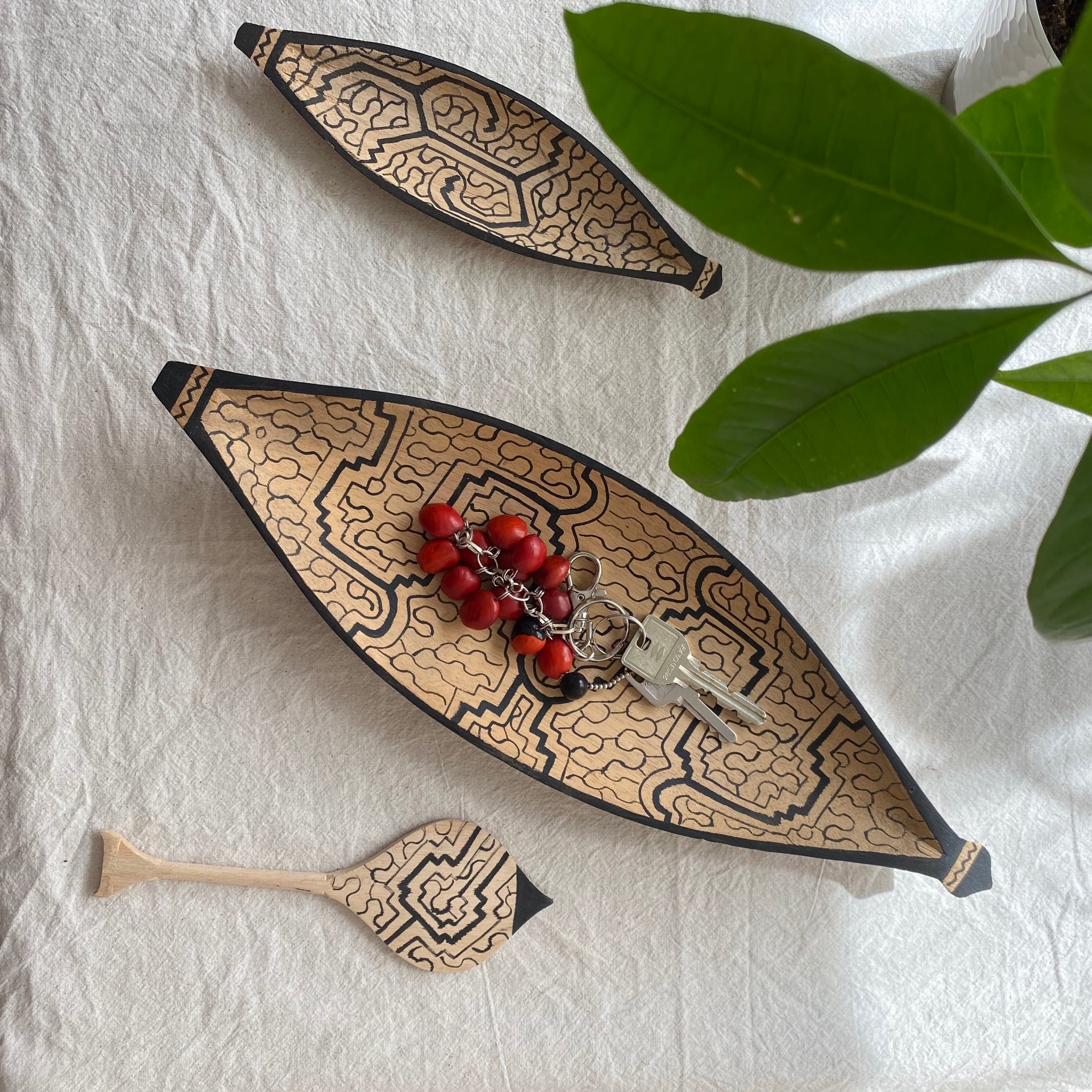 アマゾンの泥染めは、先住民族シピボ族の伝統工芸で、フリーハンドの幾何学模様を染める、希少価値の高い手工芸です。この布を使ってオーナー(AYACHI S)がバッグや布雑貨を手作りしています。 貴重な伝統工芸を少しでも長く作り続けて欲しいという想いから続けている活動です。