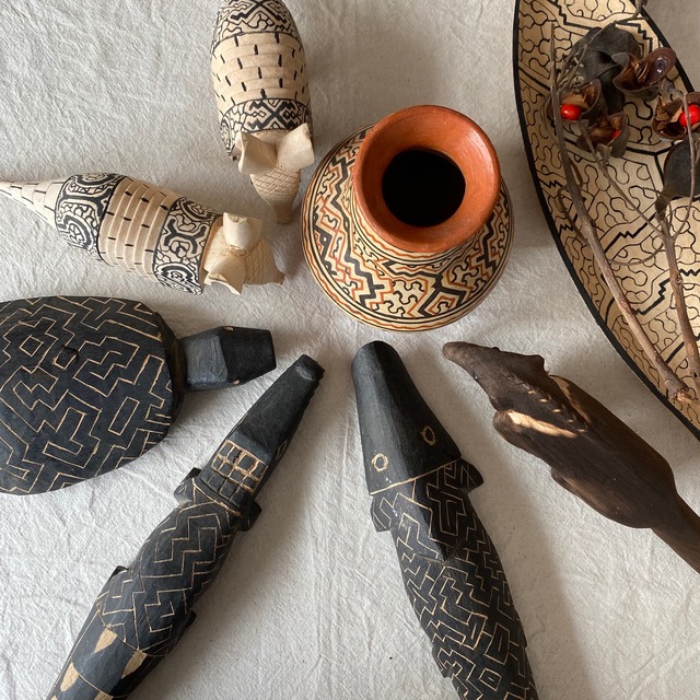 アマゾンの泥染めは、先住民族シピボ族の伝統工芸で、フリーハンドの幾何学模様を染める、希少価値の高い手工芸です。この布を使ってオーナー(AYACHI S)がバッグや布雑貨を手作りしています。 貴重な伝統工芸を少しでも長く作り続けて欲しいという想いから続けている活動です。