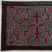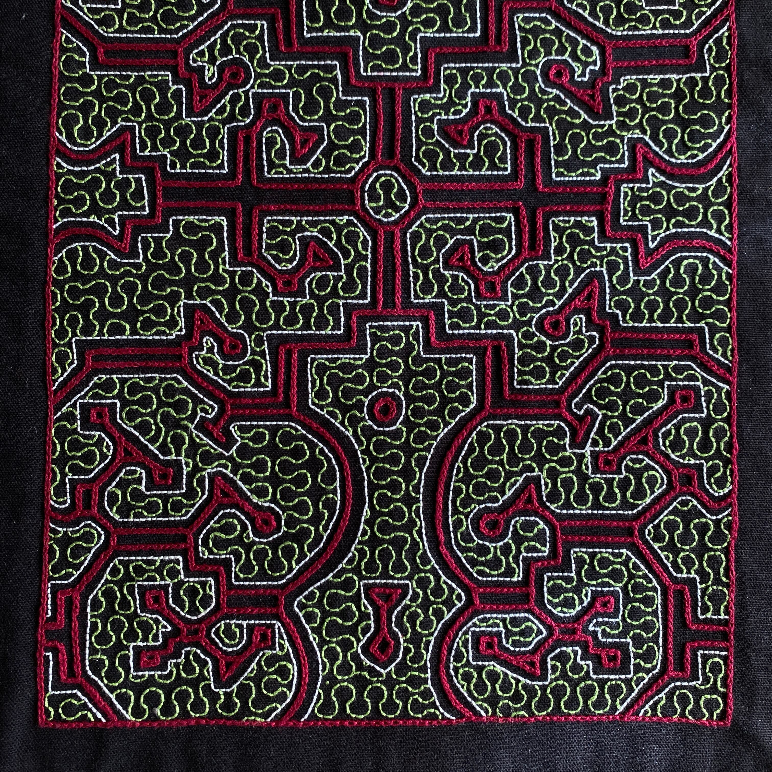 この布地は泥染めではなく、しっかりとした黒の帆布生地を使用し刺繍を施しており、裏側も同じ素材を使っているため、大変丈夫なテーブルマットになっています。細かい刺繍をするには布地が固くシピボ族の作り手レオニダさんには苦労をかけましたが、テーブルマットとしても使いやすいように考えたものです。