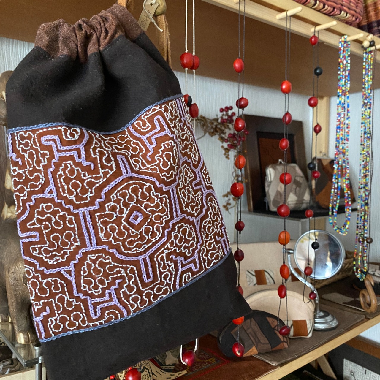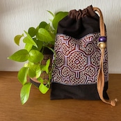 黒の泥染めが深みがあり柔らかい素材で、裏地もガーゼだけど硬めでハリのある薄い生地でを焦げ茶に染めたものです。泥染めの一部に刺繍を入れた特注素材を巾着に仕立てたものです。