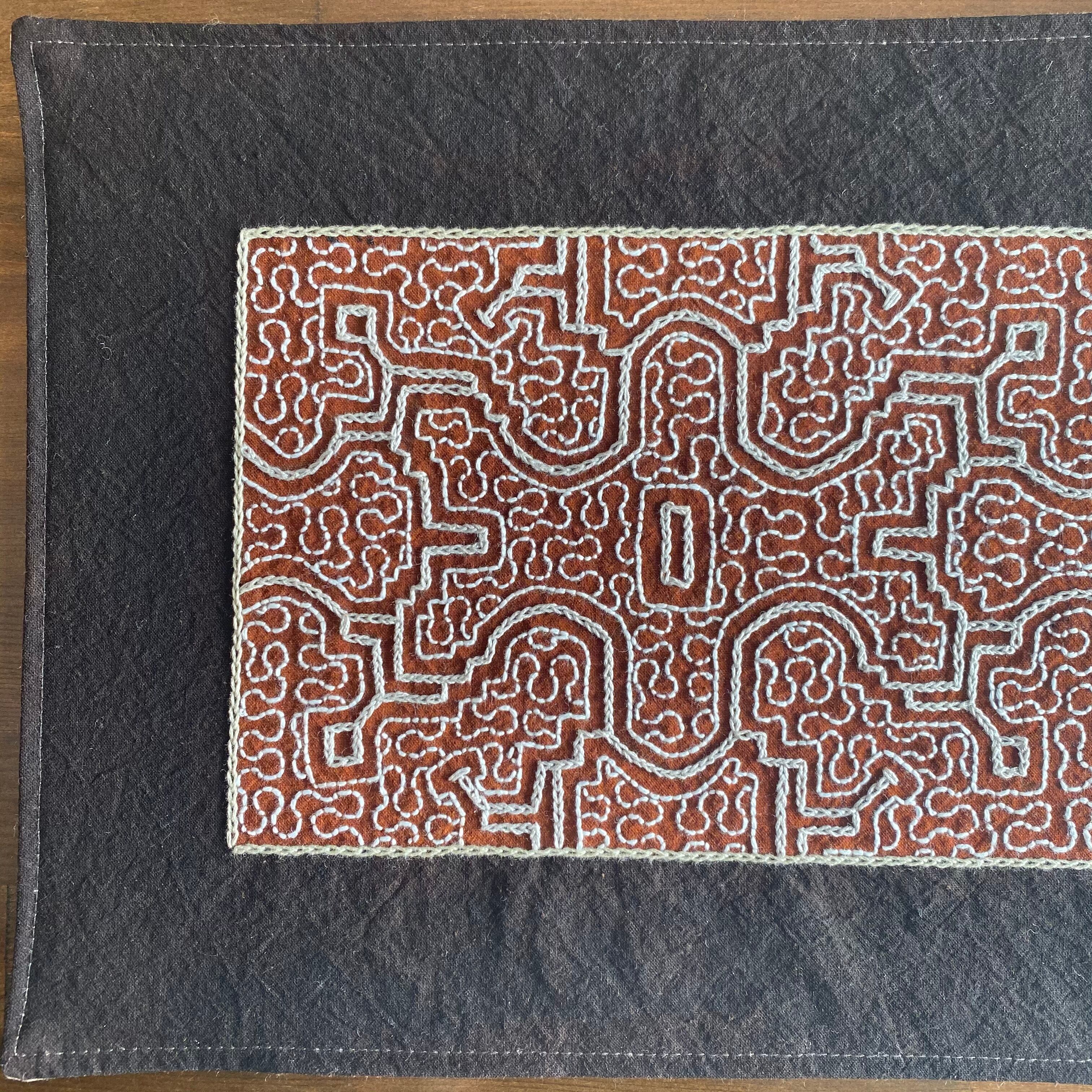 プレイスマット 25x31cm グレー系 両面 額装 アマゾンの泥染め シピボ族の刺繍