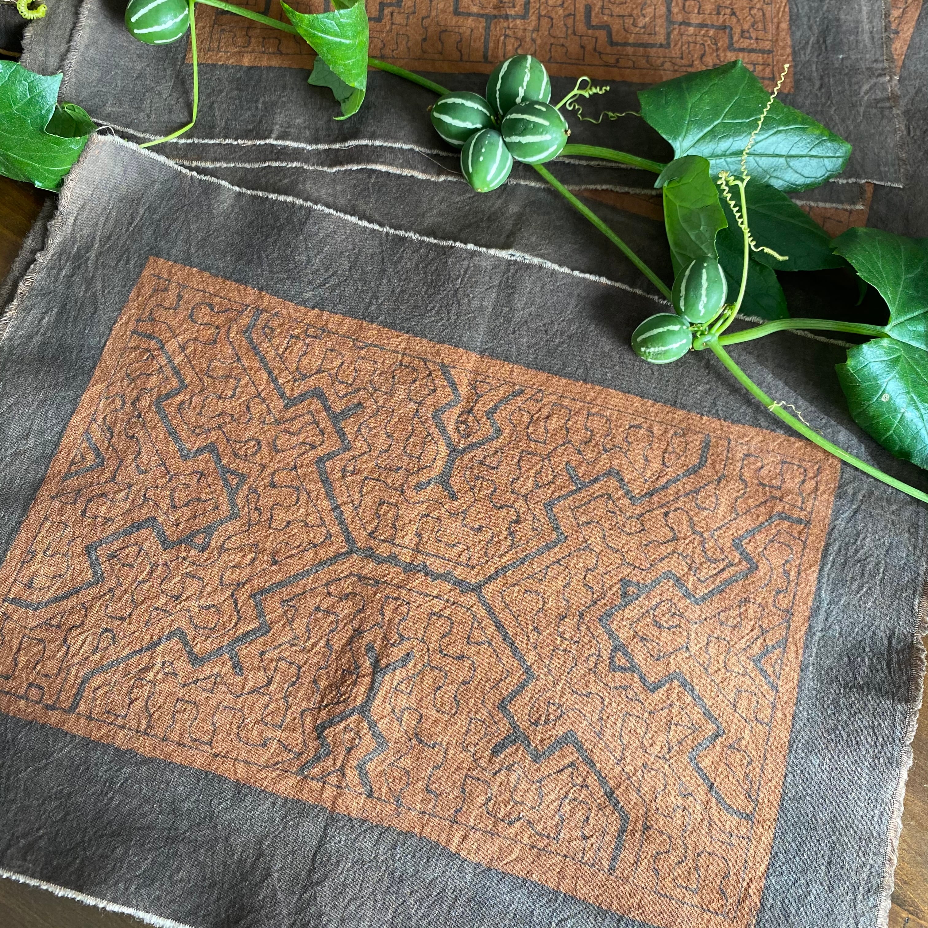 アマゾンの泥染めの茶色は、森の恵である木の樹皮を煮出したタンニン色素の染液と、灼熱の太陽の強い陽射しで天日干しすることで生まれる特別な茶色です。