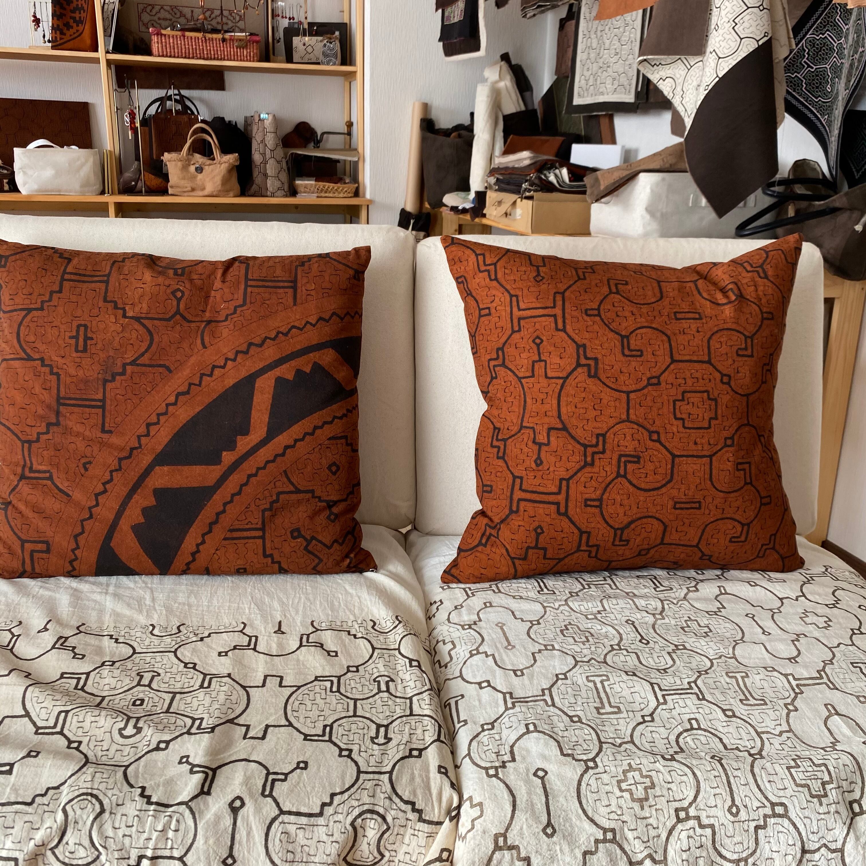 裏側の茶色の無地はペルーアマゾンのシピボ族の集落で染めた布地で、マホガニーの樹皮を煮出したタンニンを含む染液で染めあげます。ここに鉄分の多い特別な泥を使ってフリーハンドの模様を描き染めて模様を定着させます。