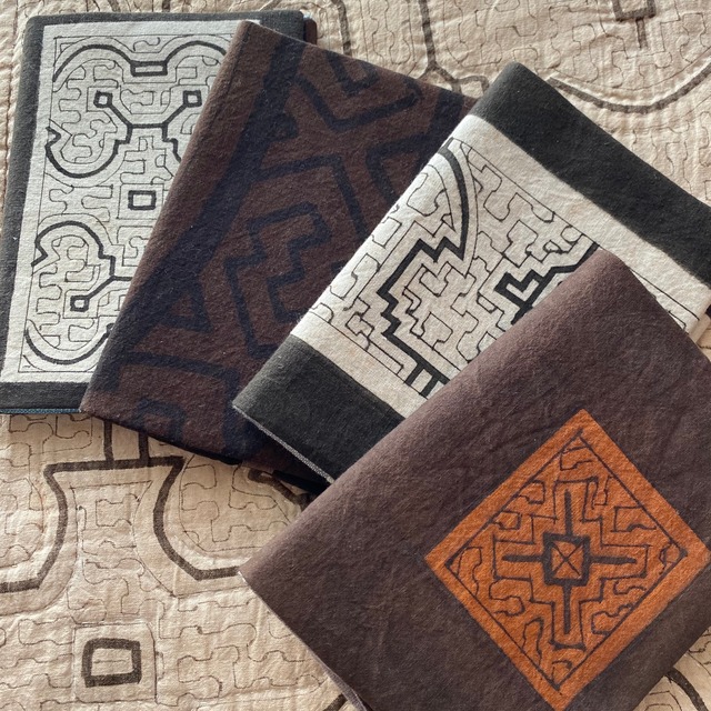 アマゾンの泥染めは、先住民族シピボ族の伝統工芸で、フリーハンドの幾何学模様を染める、希少価値の高い手工芸です。この布を使ってオーナー(AYACHI S)がバッグや布雑貨を手作りしています。 貴重な伝統工芸を少しでも長く作り続けて欲しいという想いから続けている活動です。