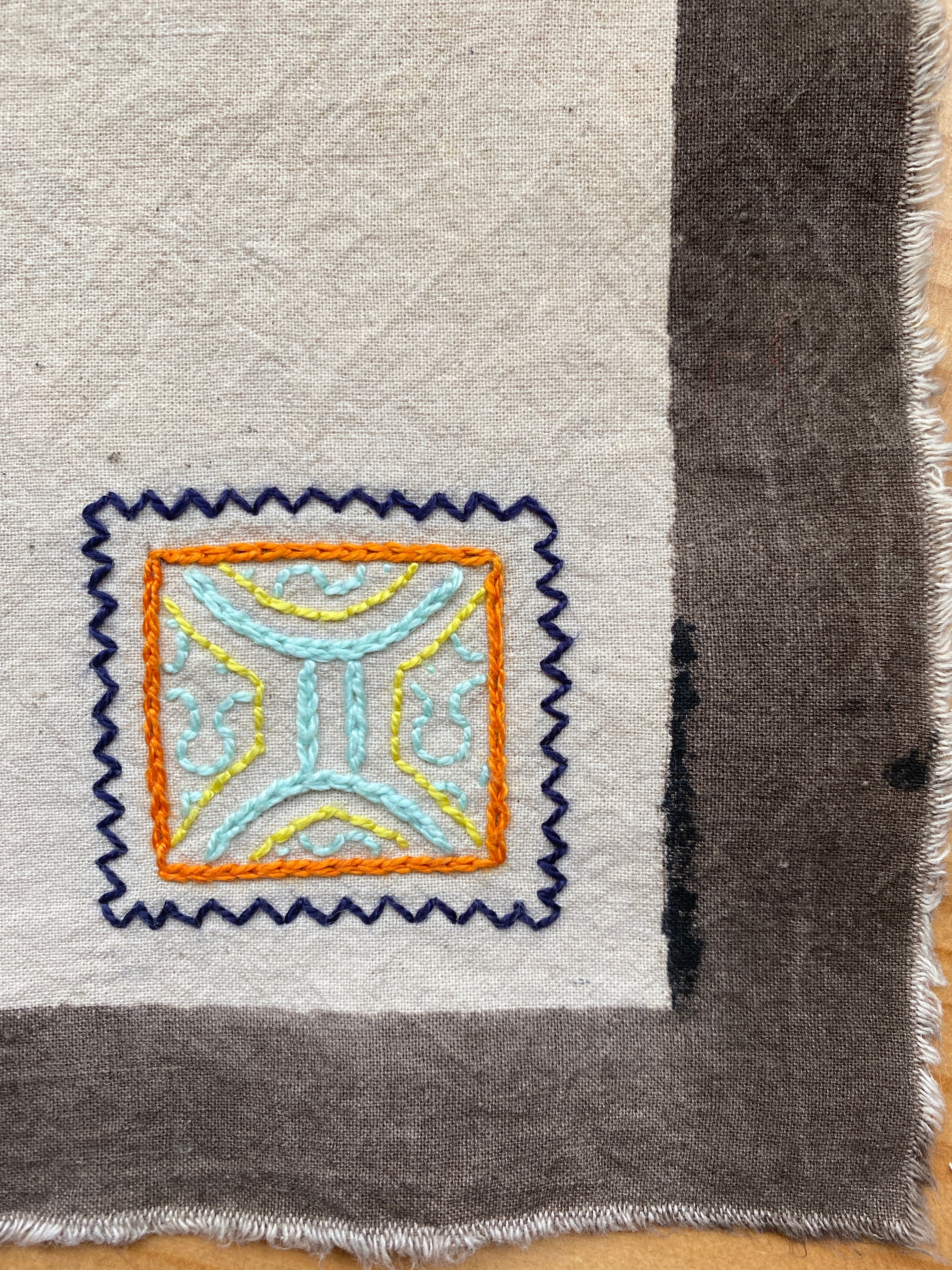 プレイスマットワンポ刺繍白5 シピボ族の泥染め 25x25cm ワンポイント・ティーマット