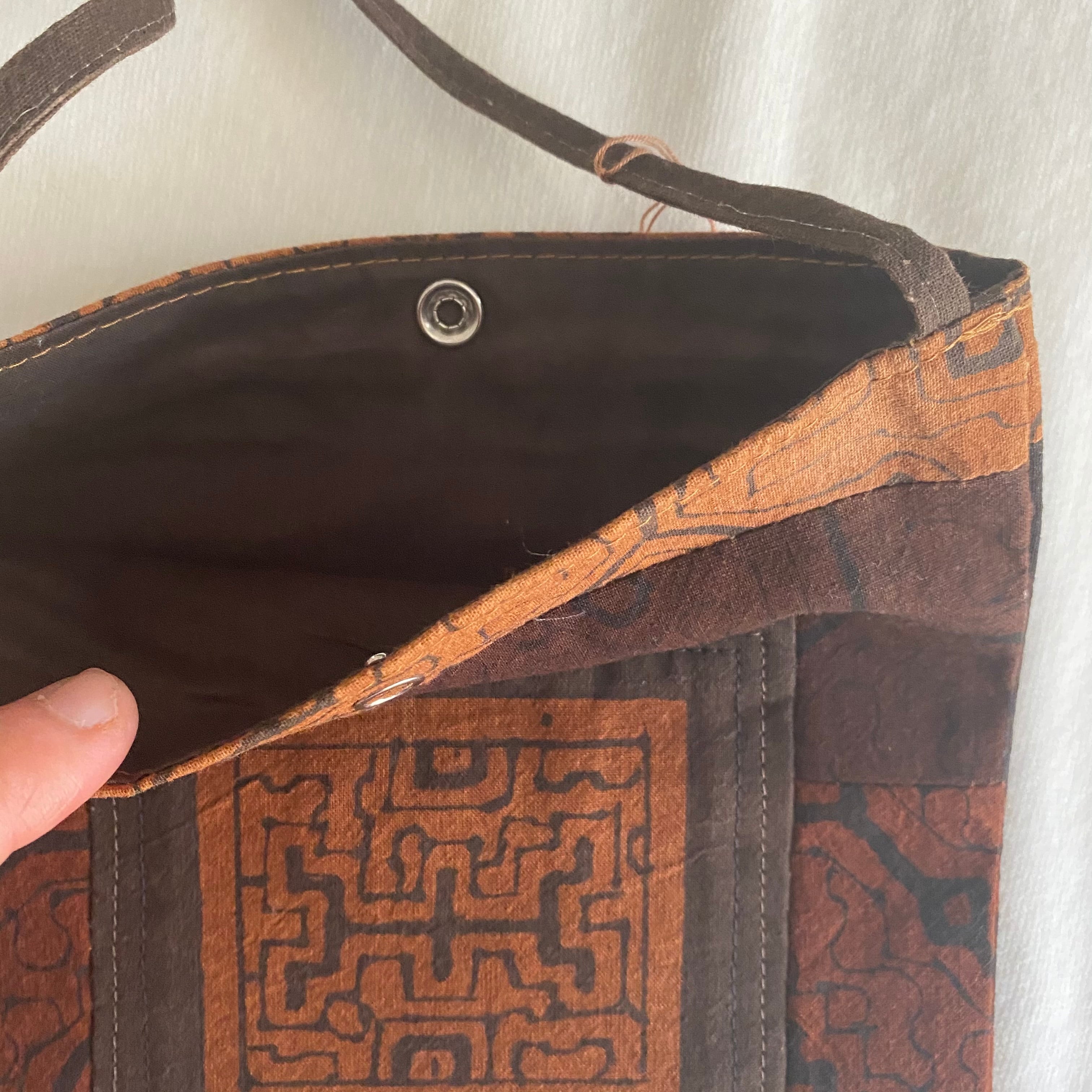 ◎泥染めポシェット28 蓋付き茶系のパッチワーク シピボ模様 ショルダー ホック付き