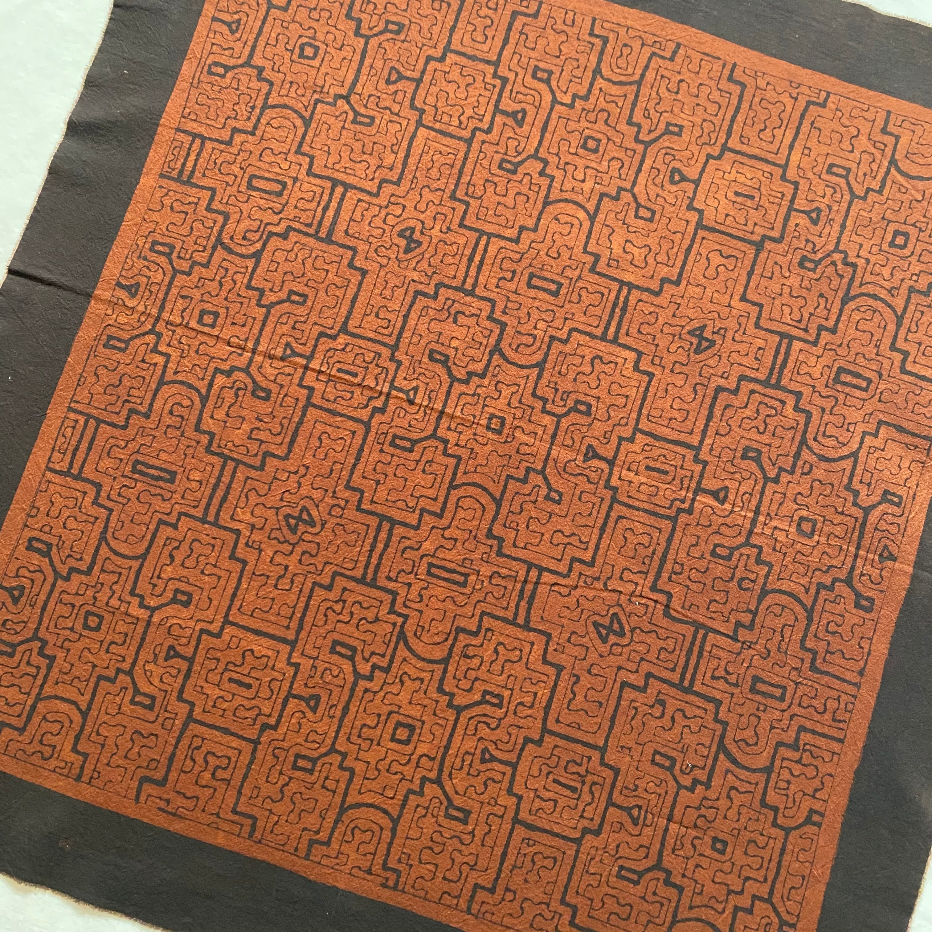 茶色と白地の二種類あり、どちらも「タンニン」を含む樹皮を煮出した染料と、森の奥地から採取する「鉄分」の強い特別な泥の化合を利用した染色方法で、フリーハンドで描かれる幾何学模様のデザインの部分だけが黒く染まることが特徴です。