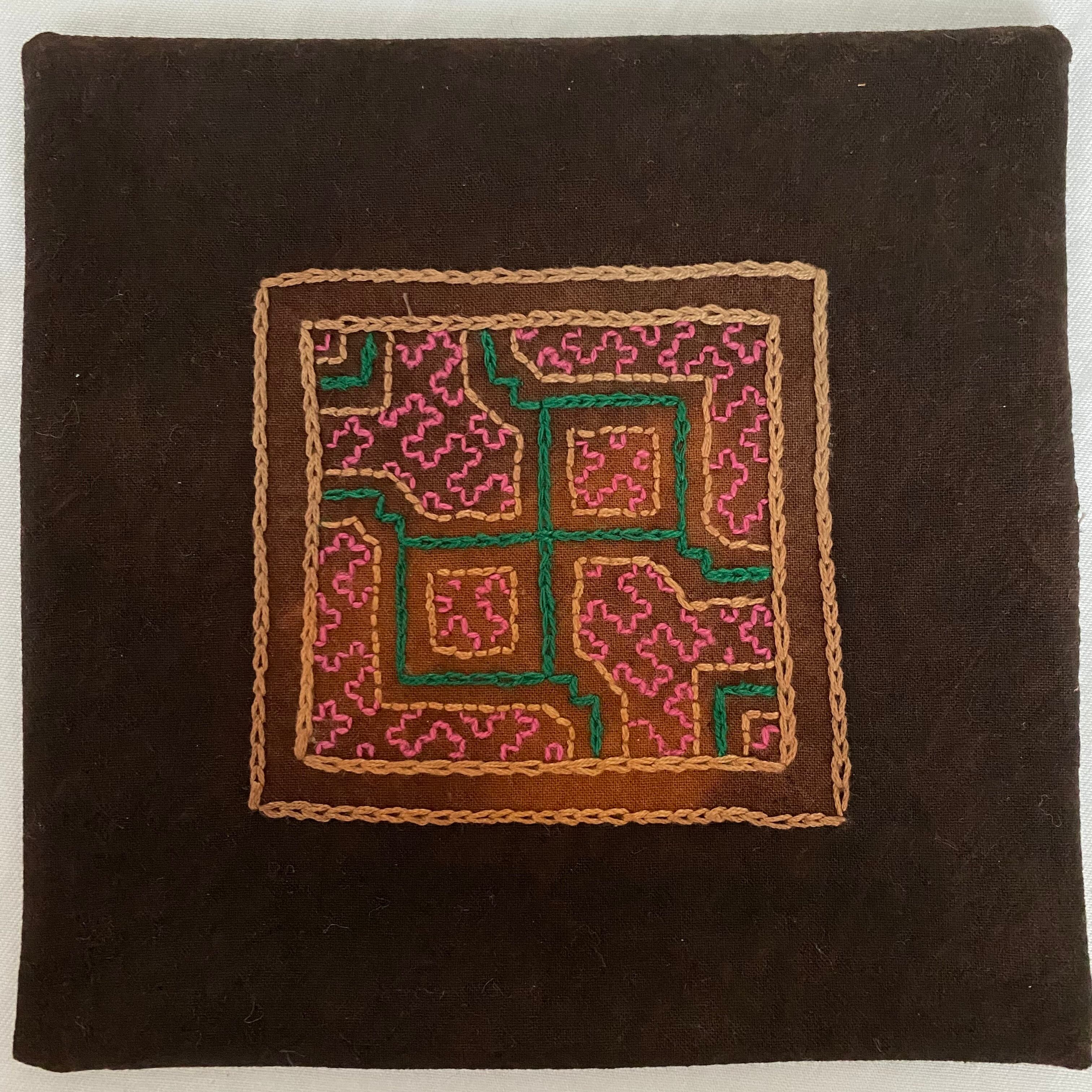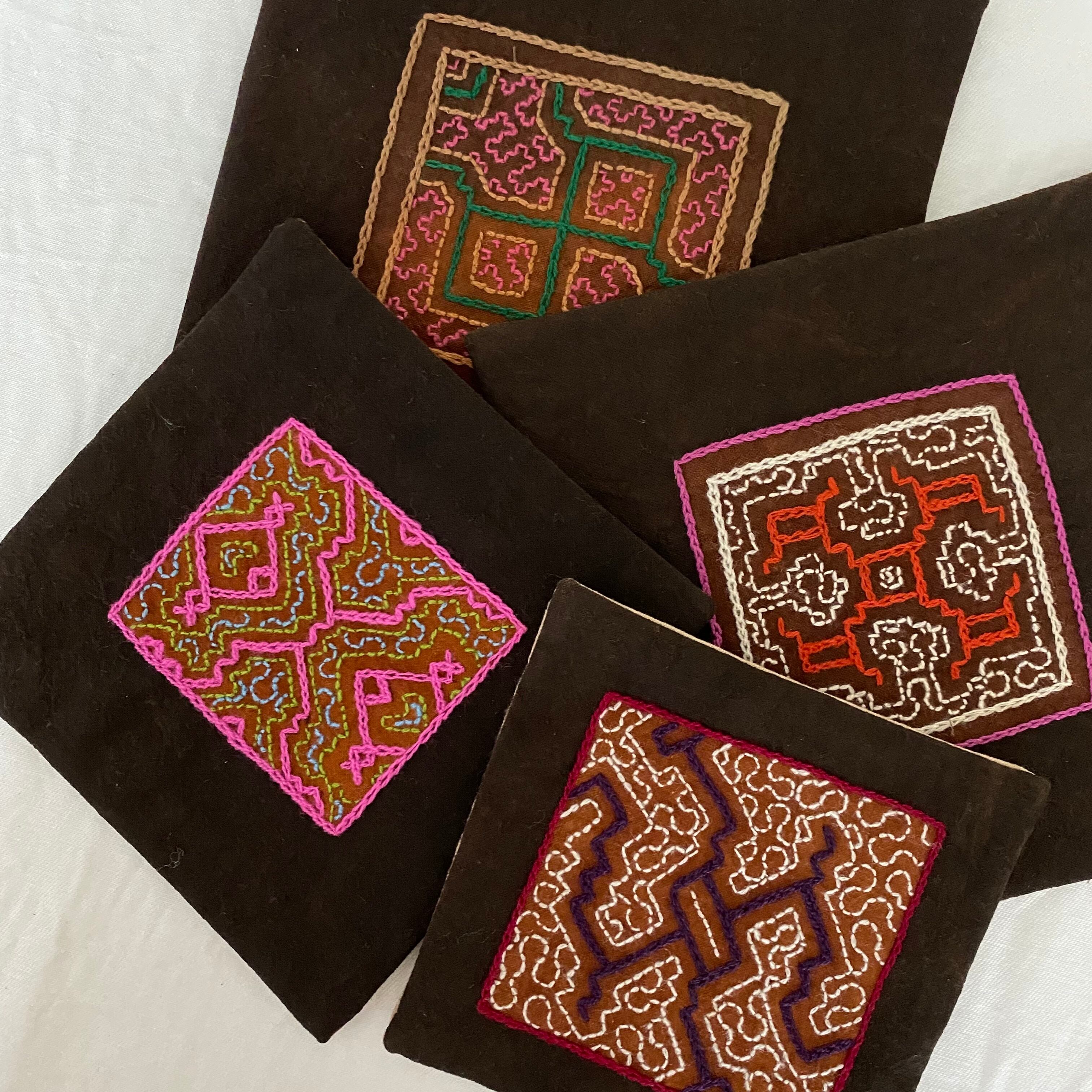 泥染め刺繍コースター 両面16cm 模様染め 緑刺繍 ポットマット シピボ族の刺繍