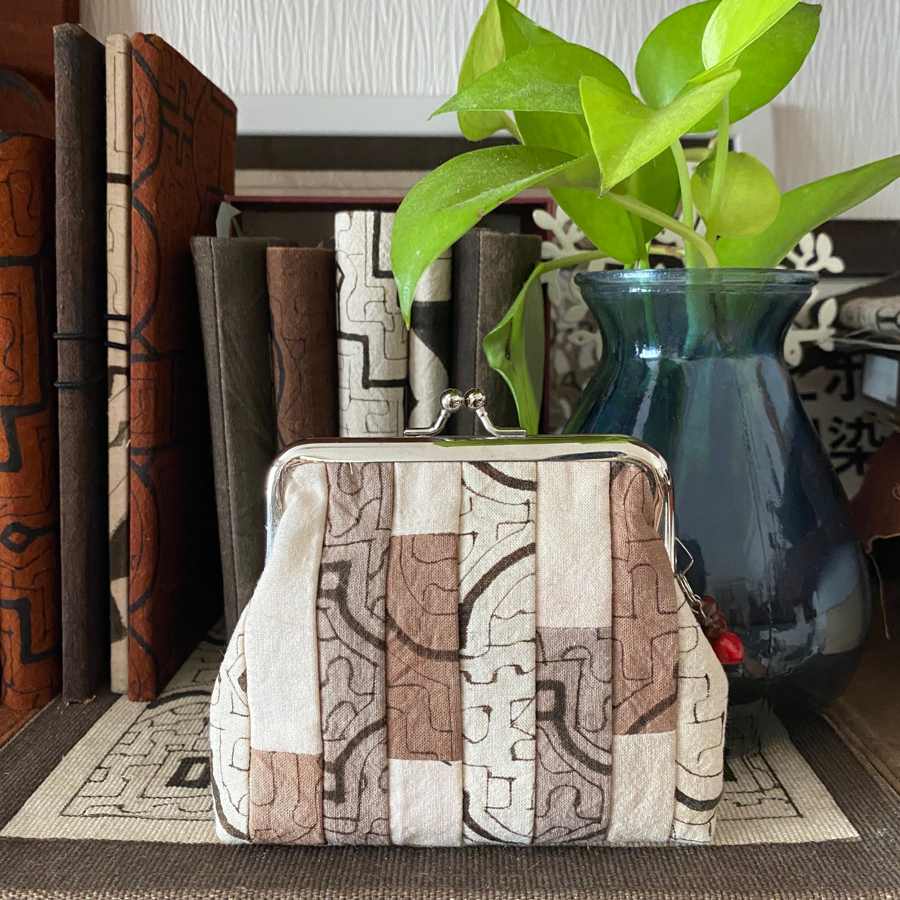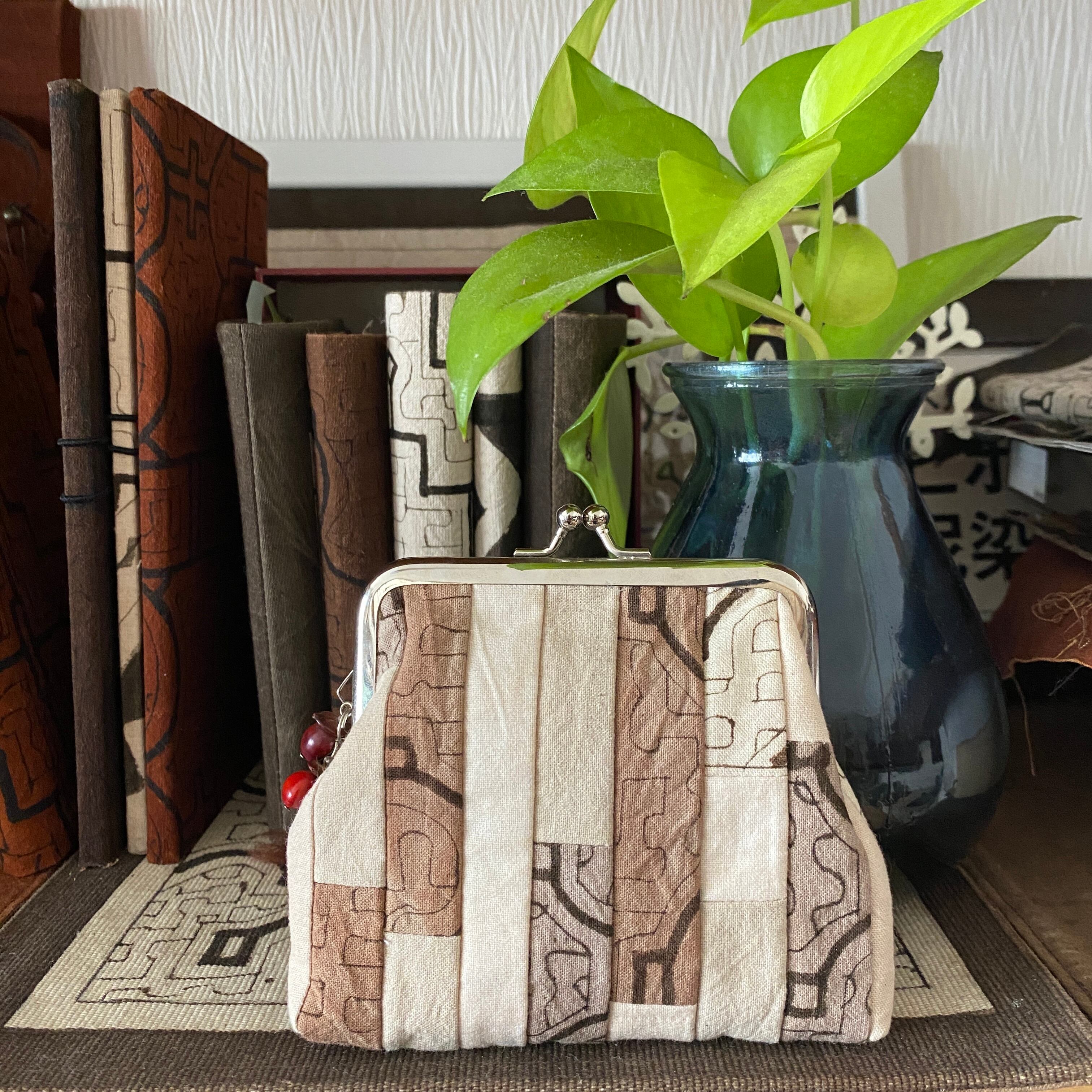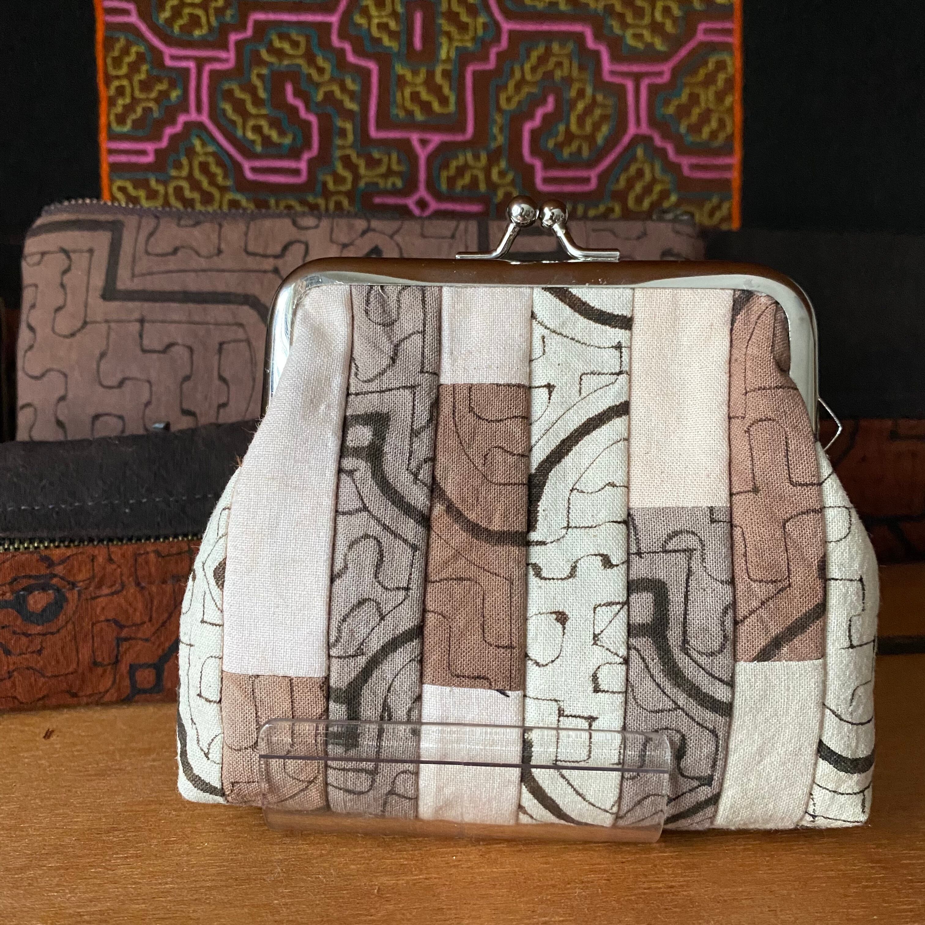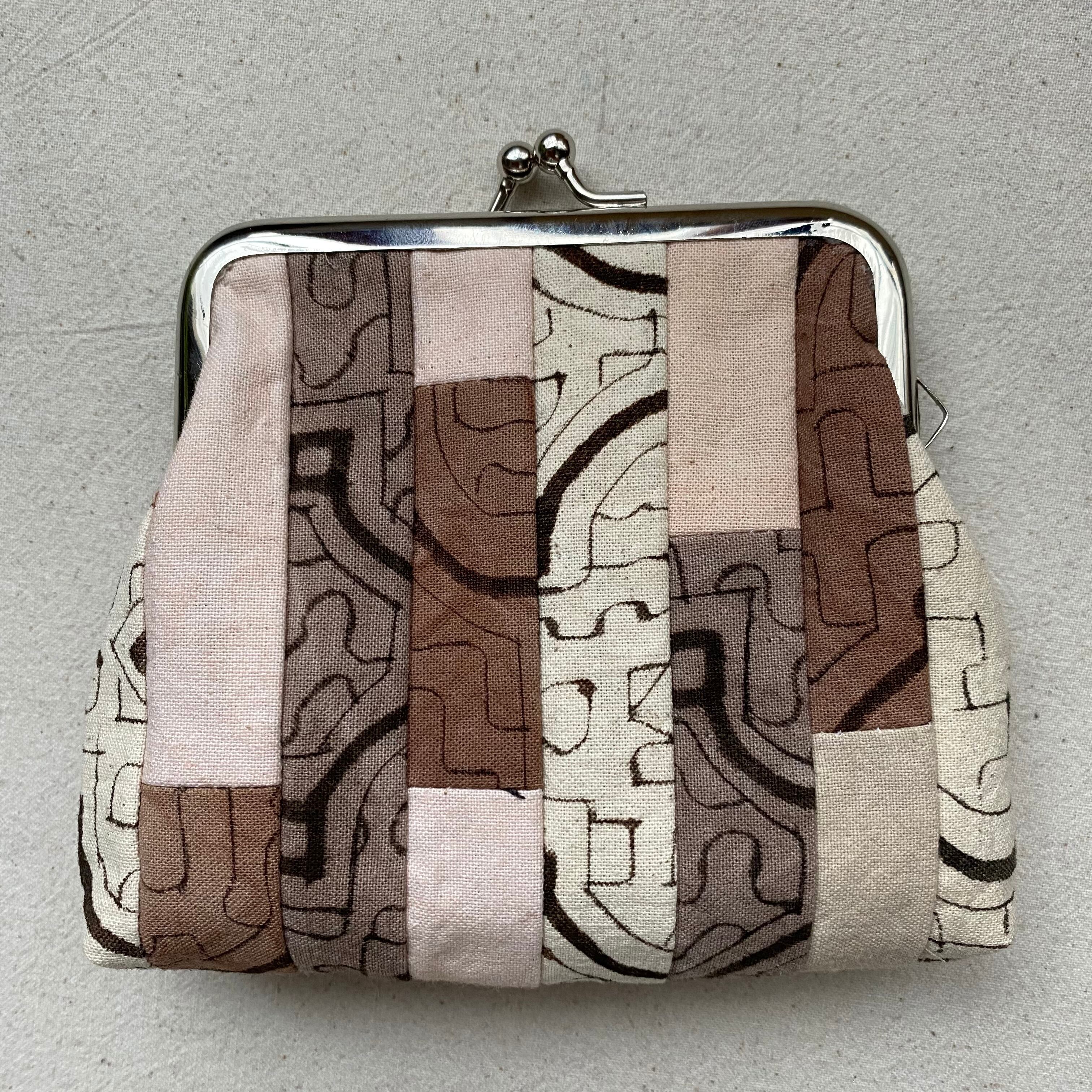 シピボ族が染めた泥染めや草木染めのハギレを使った細かいパッチワークのがま口です。